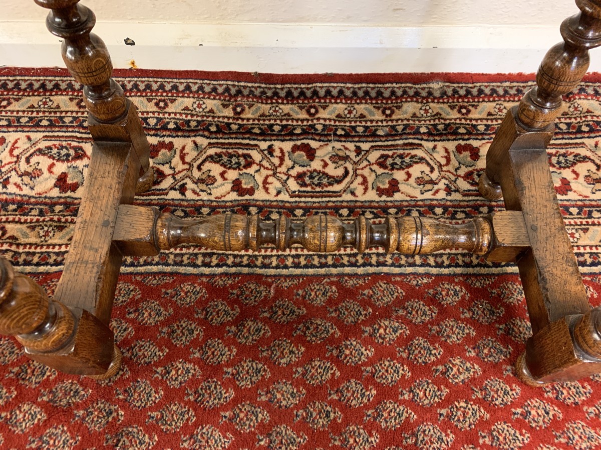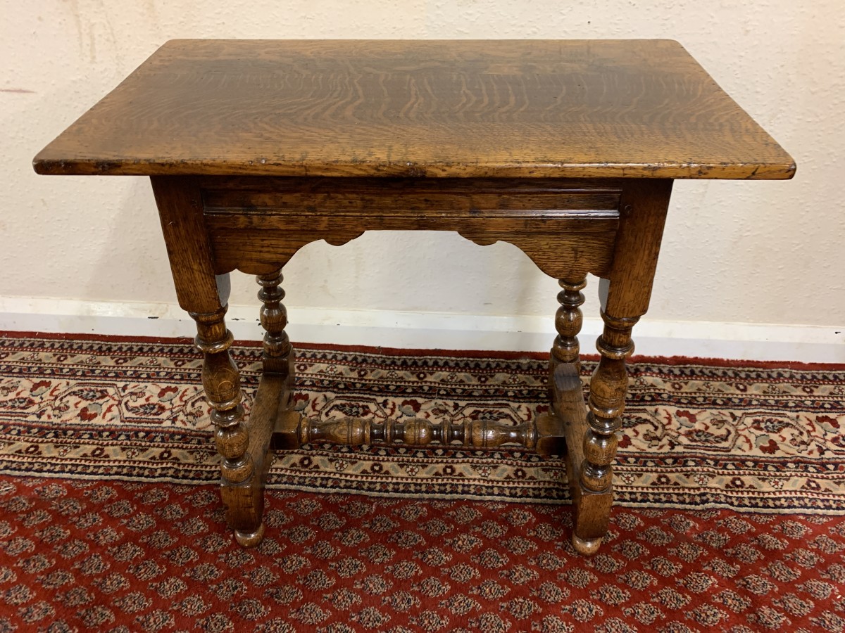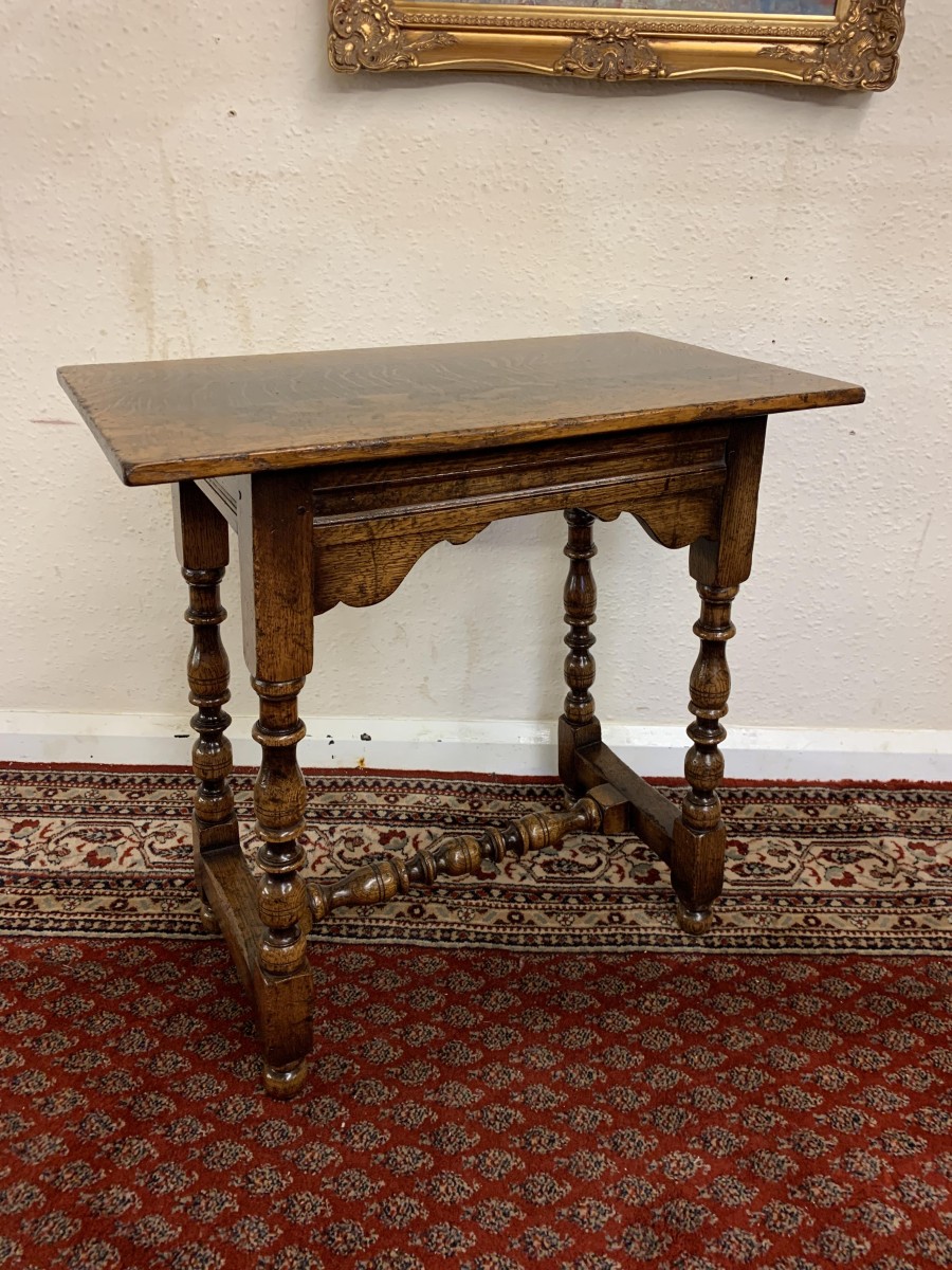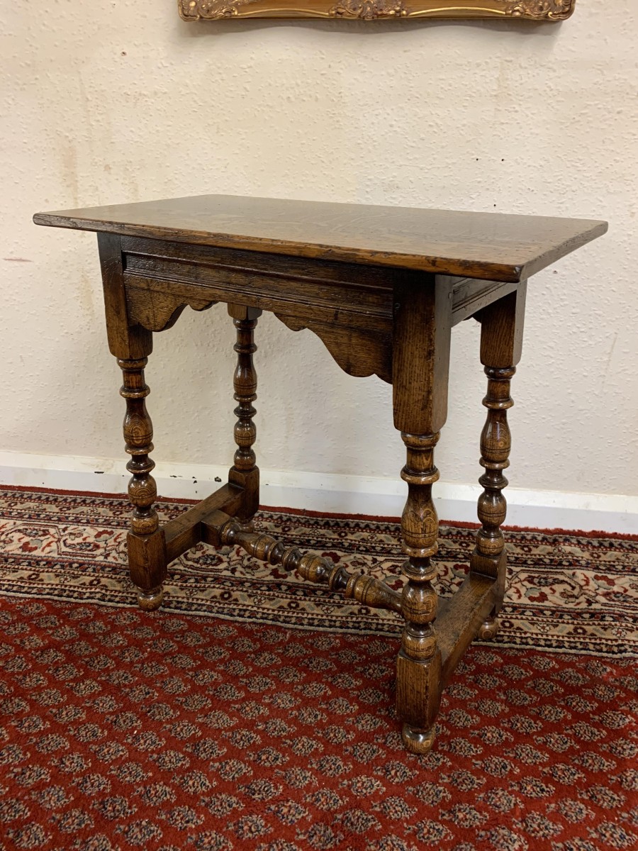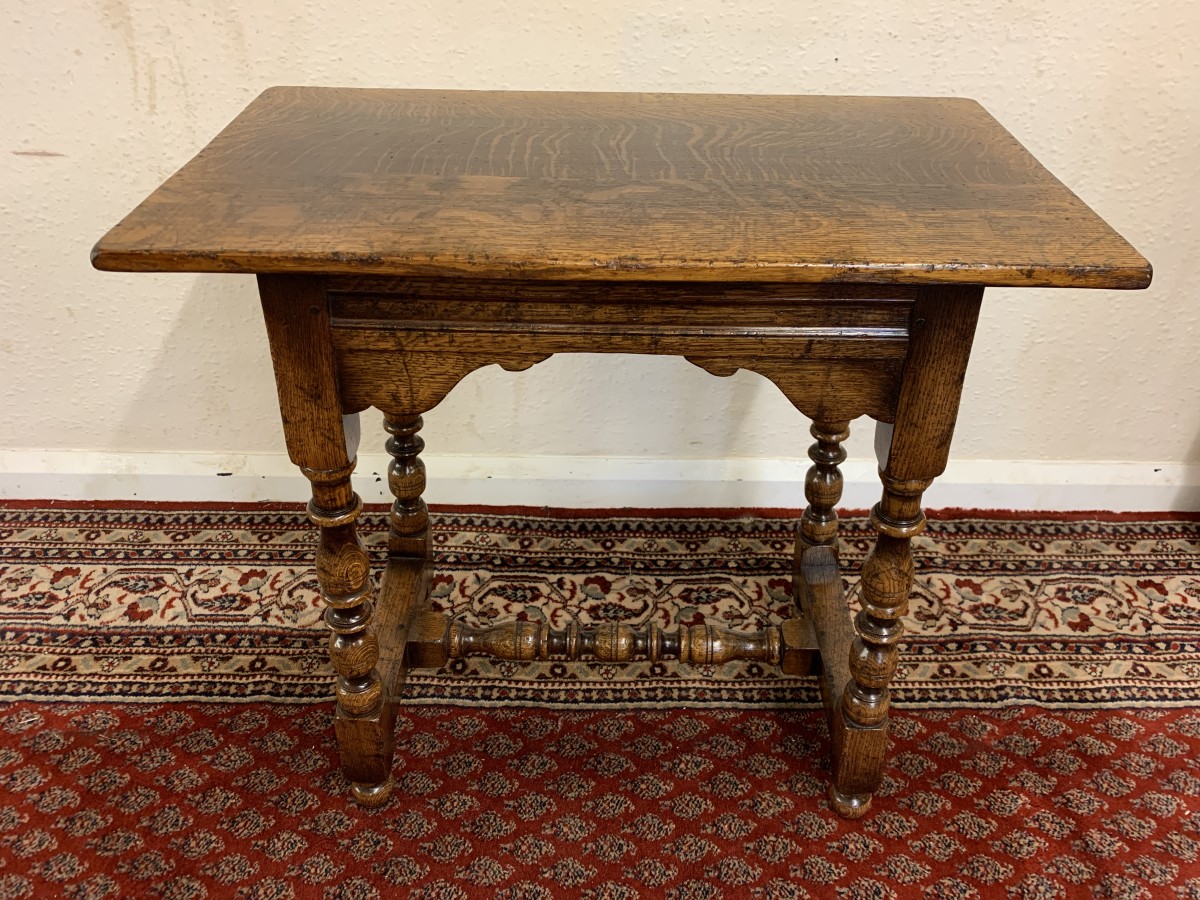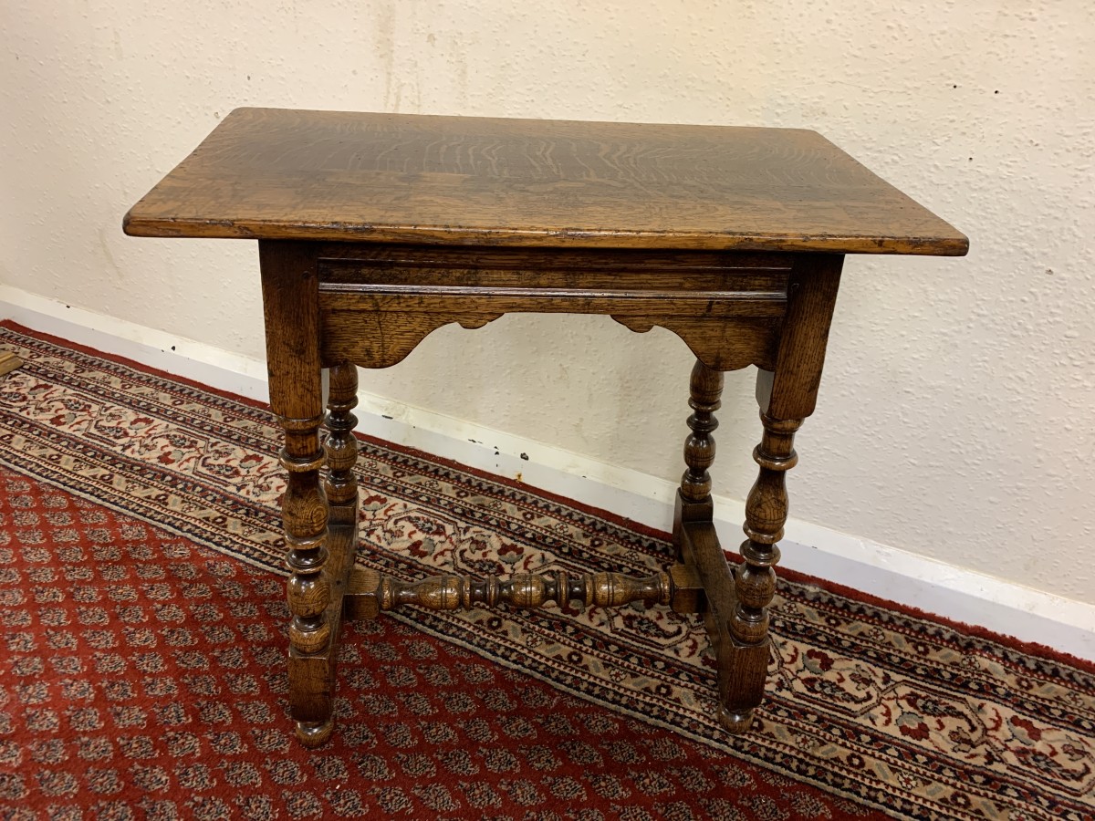 Made in glorious solid oak by the renowned Titchmarsh & Goodwin furniture makers. The oversailing top sits above four elegant turned legs: turned stretcher and standing on four turned feet. Please note this side table is in excellent condition.