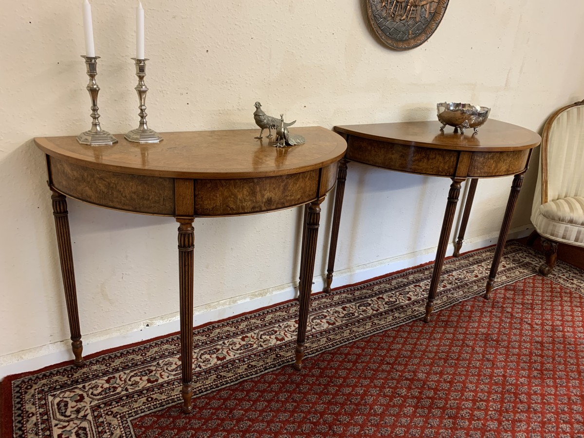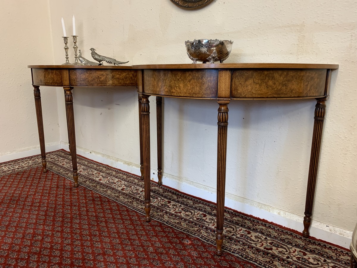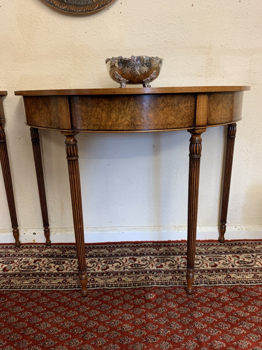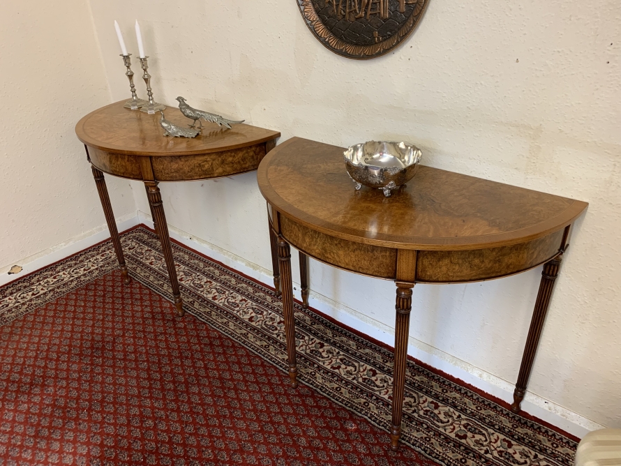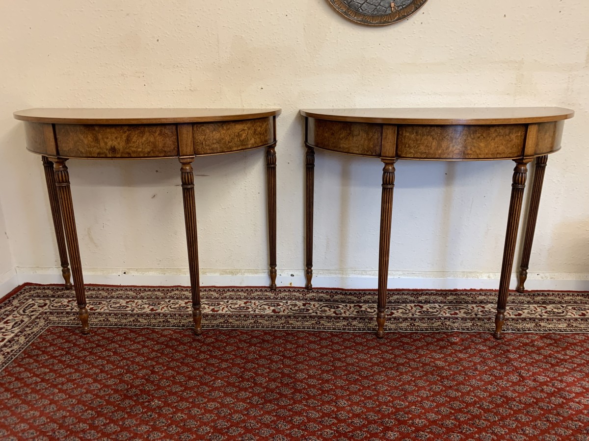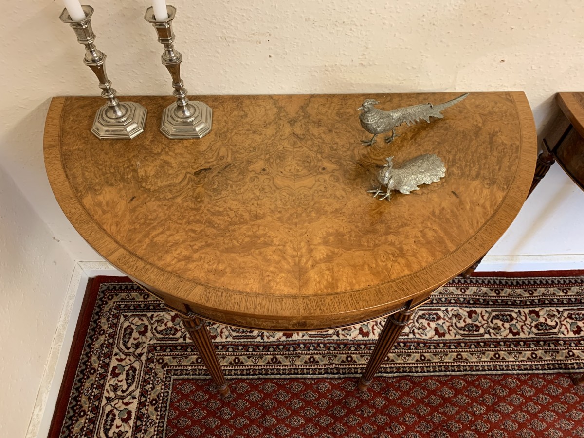 The pair tables are made from striking burr walnut and are in excellent condition. Demi-Lune in shape, banding edging with herring bone inlay. Each table stands on four turned reeded legs on turned feet.