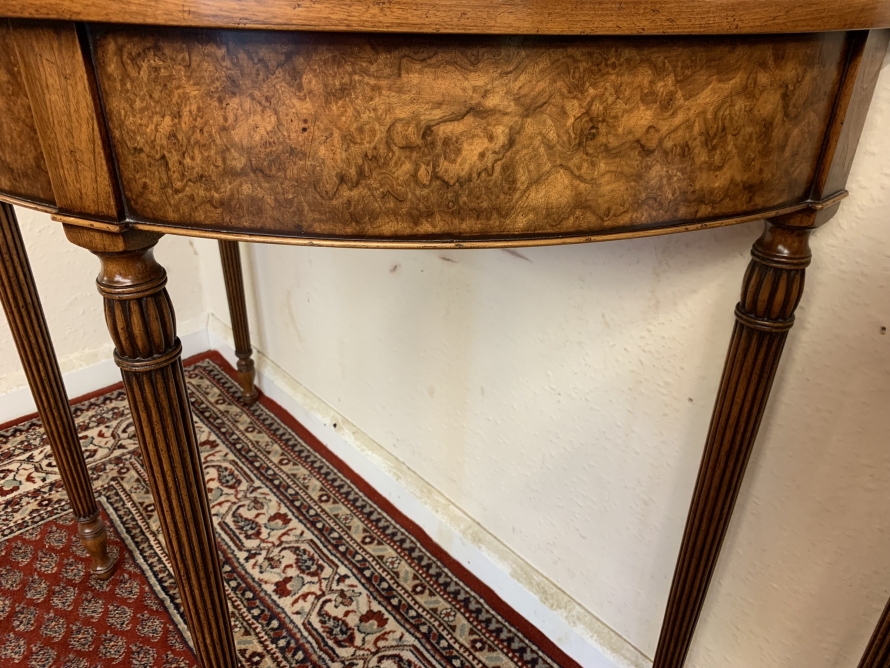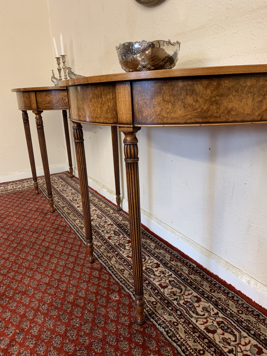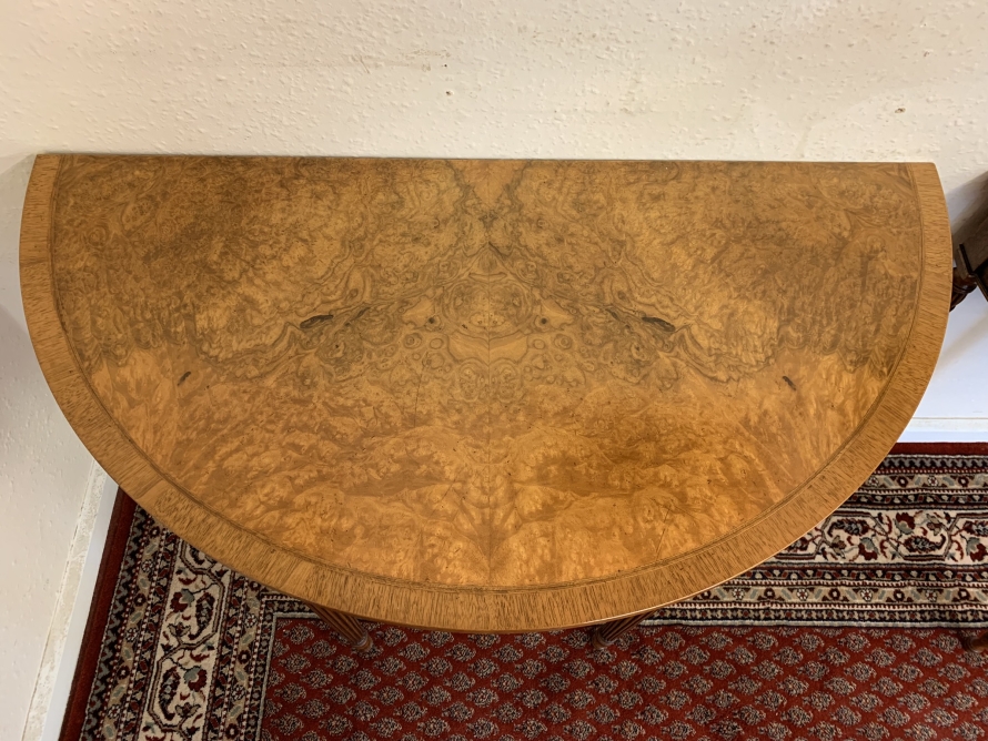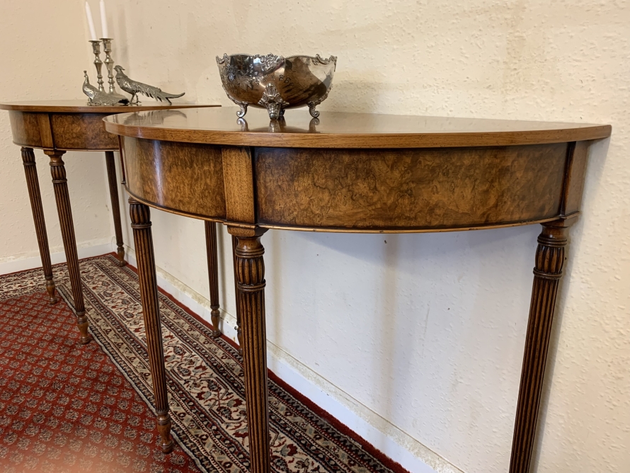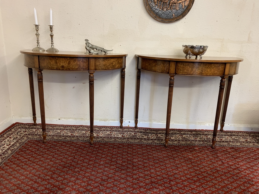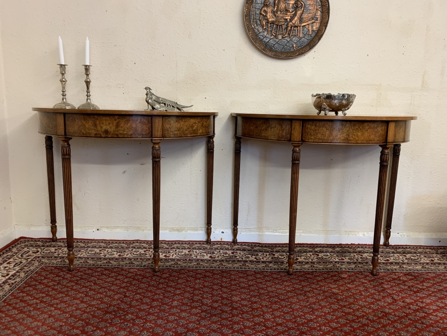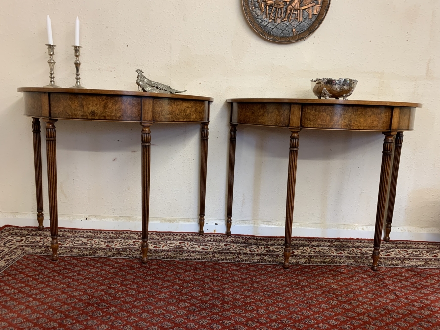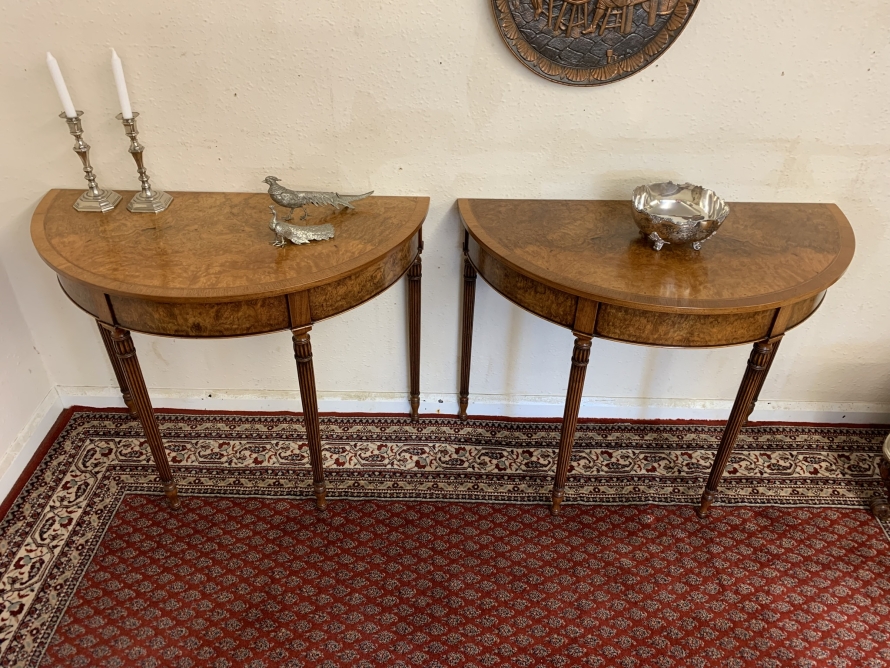 The pair tables are made from striking burr walnut and are in excellent condition. Demi-Lune in shape, banding edging with herring bone inlay. Each table stands on four turned reeded legs on turned feet.