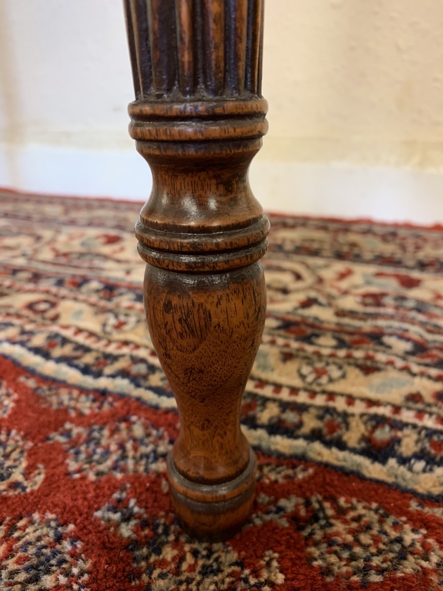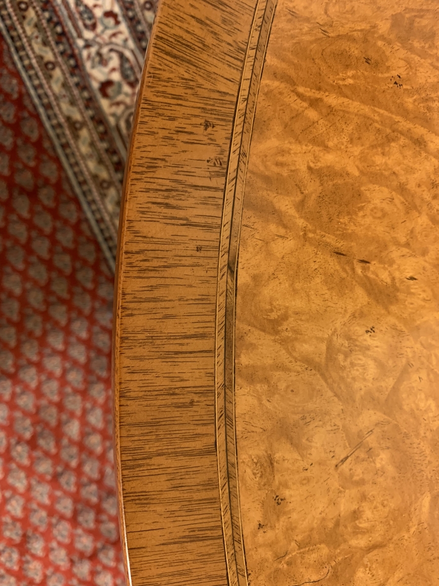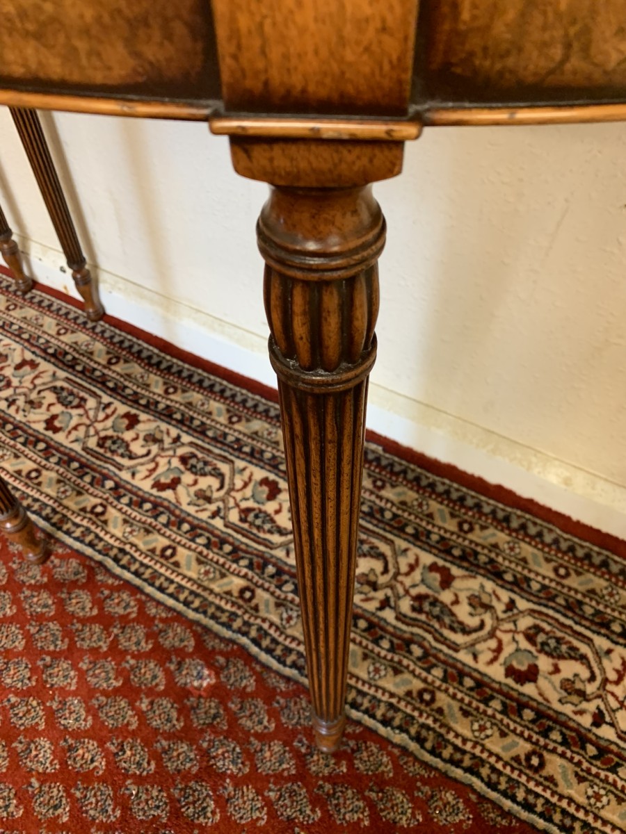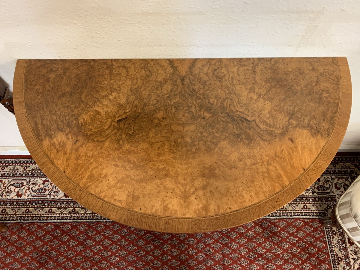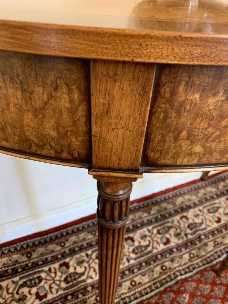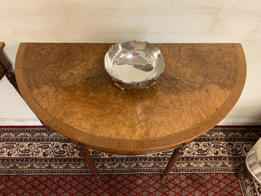 The pair tables are made from striking burr walnut and are in excellent condition. Demi-Lune in shape, banding edging with herring bone inlay. Each table stands on four turned reeded legs on turned feet.