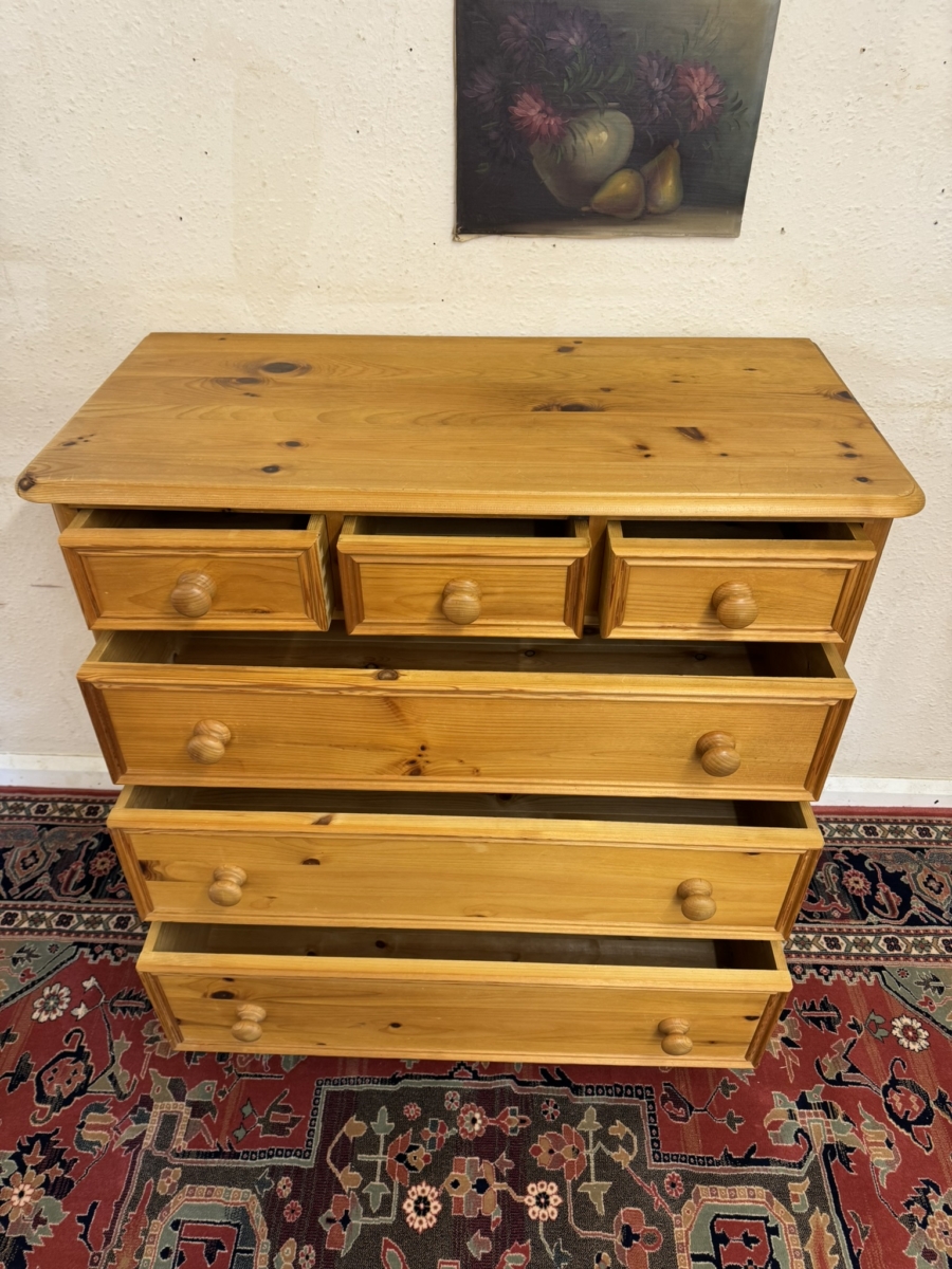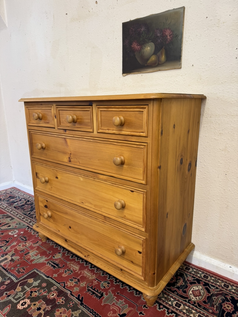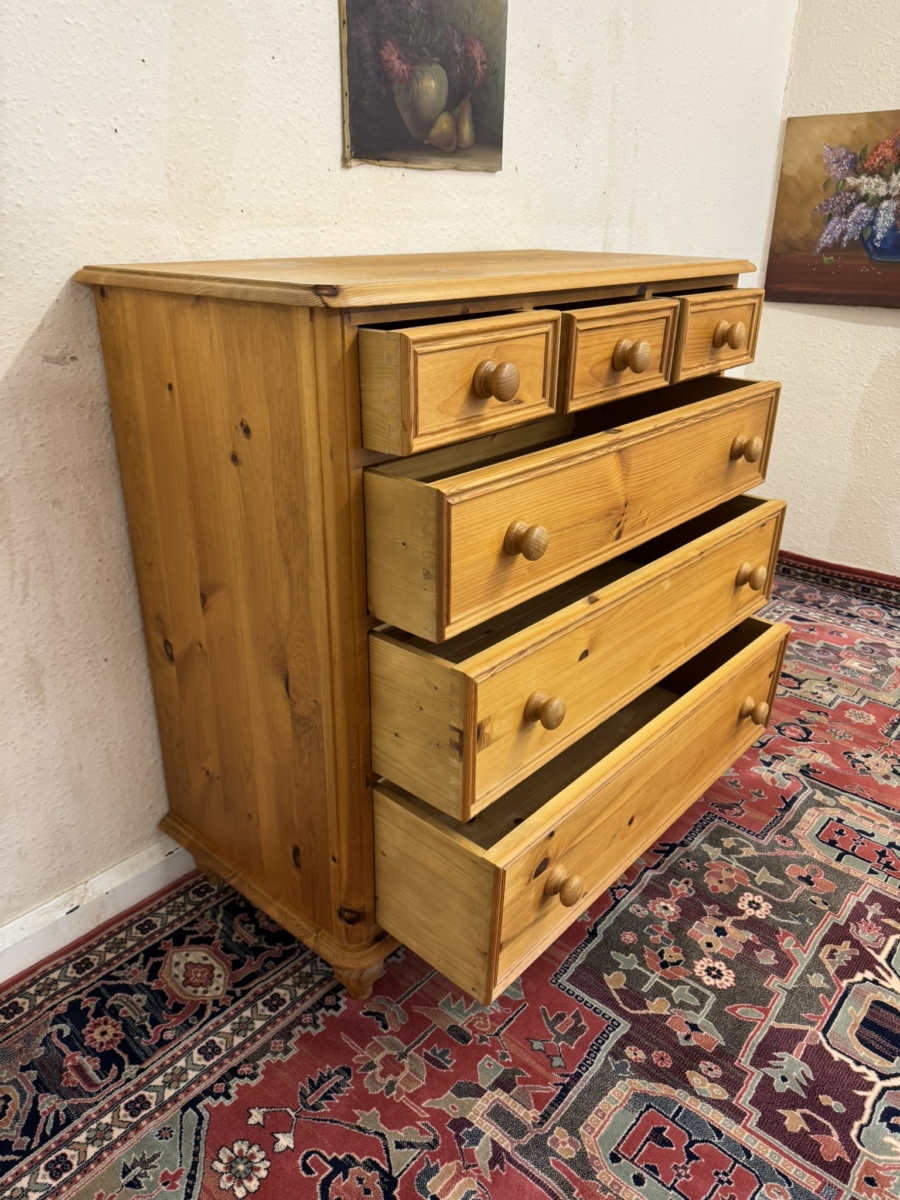 The chest dates circa 1980 and is in excellent condition. Victorian in style the chest has rounded corners to the front, three short drawers below, each with turned handle which sit above three graduated long drawers, each of the long drawers having a pair of turned knob handles. This super chest stands on for tulip feet.