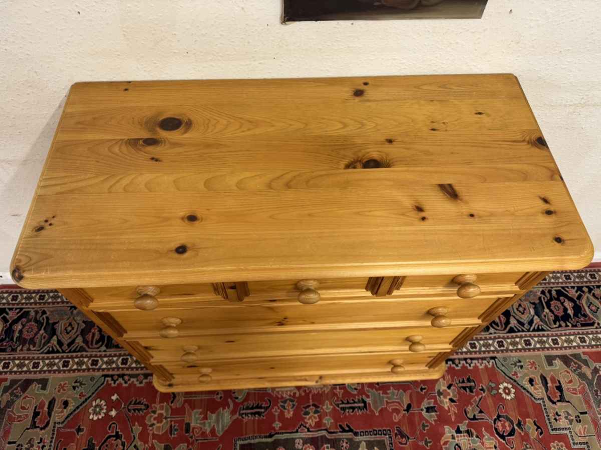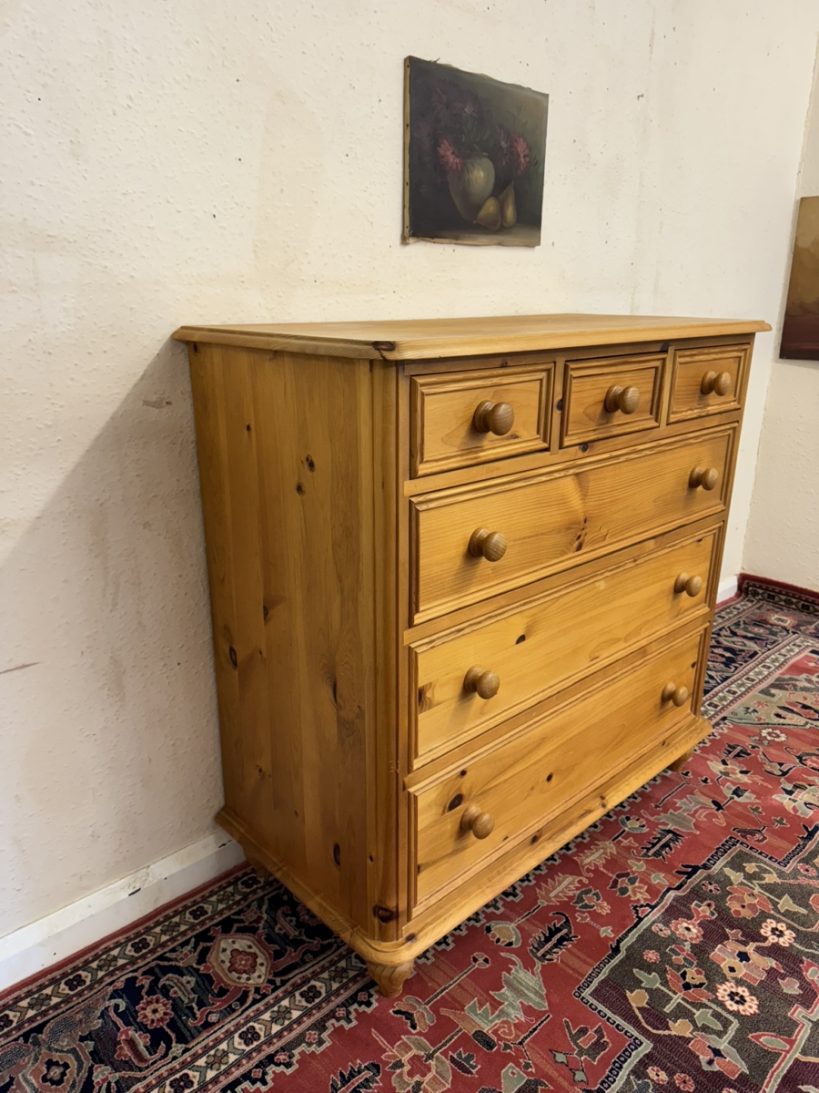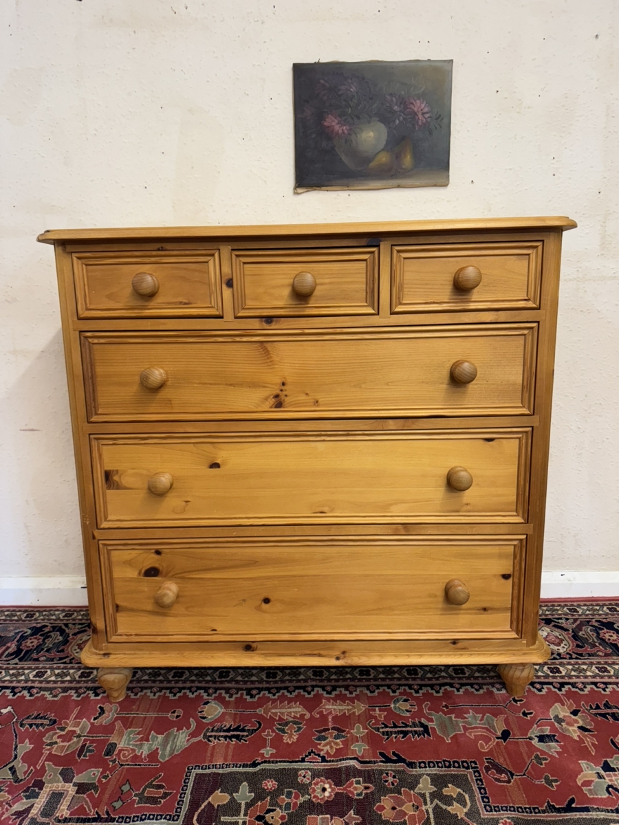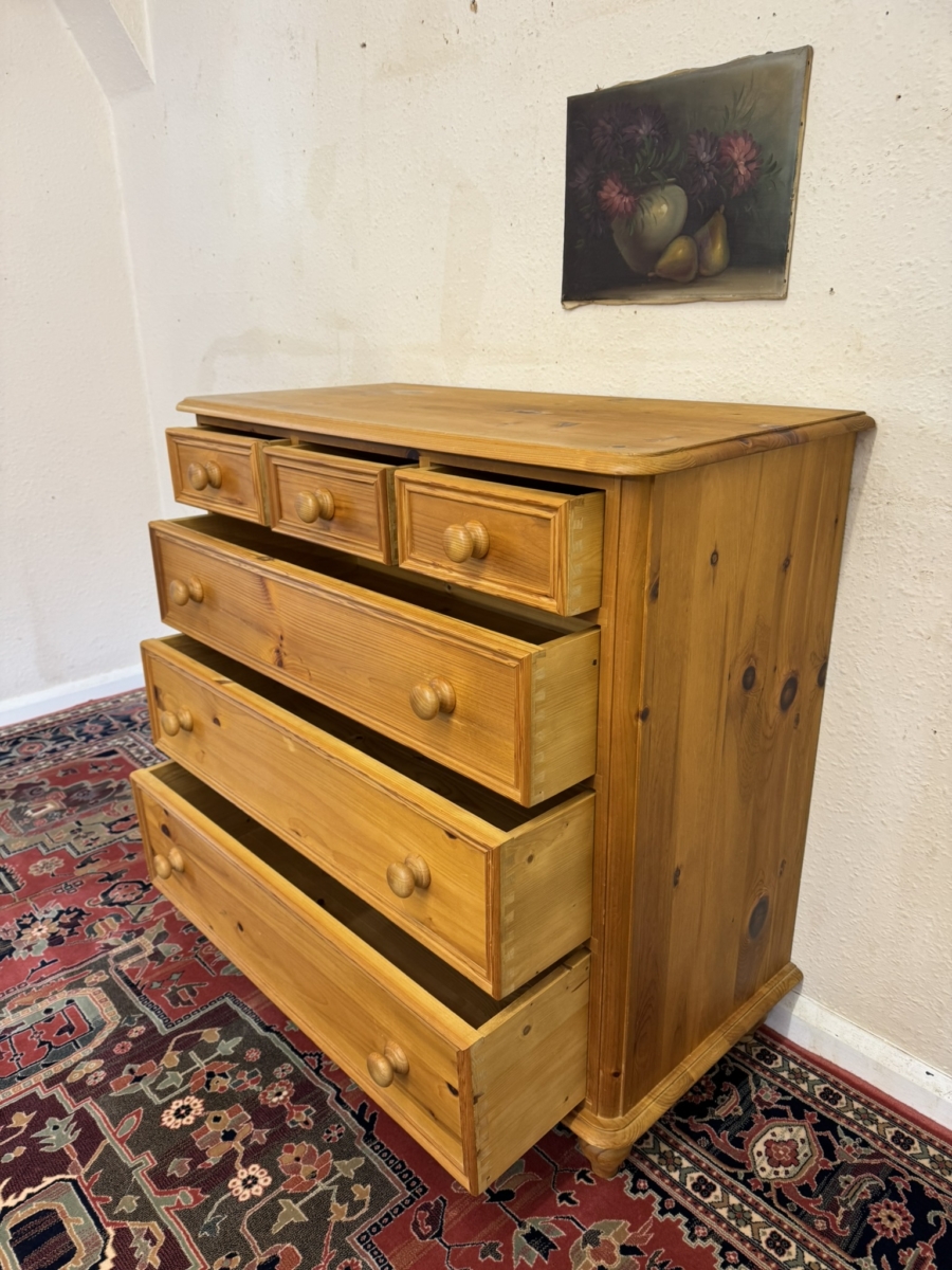 The chest dates circa 1980 and is in excellent condition. Victorian in style the chest has rounded corners to the front, three short drawers below, each with turned handle which sit above three graduated long drawers, each of the long drawers having a pair of turned knob handles. This super chest stands on for tulip feet.