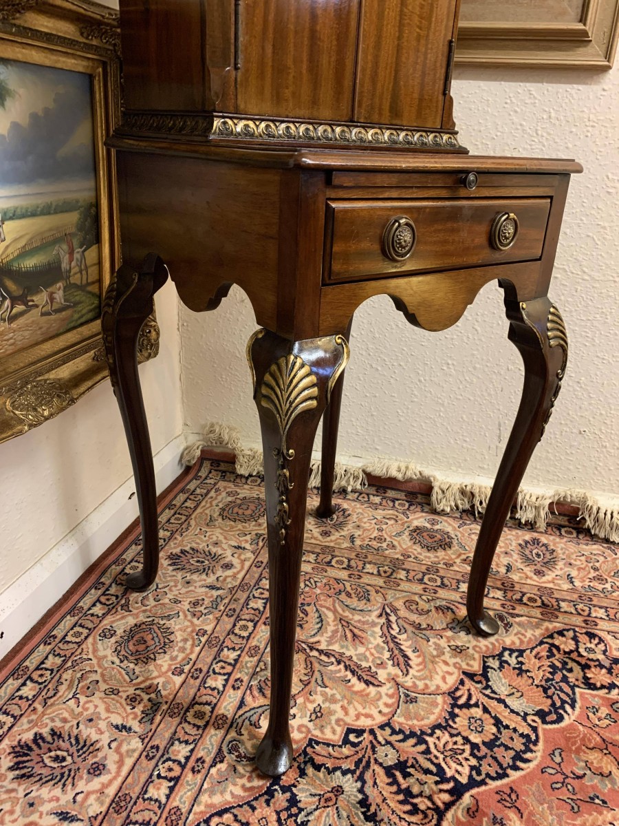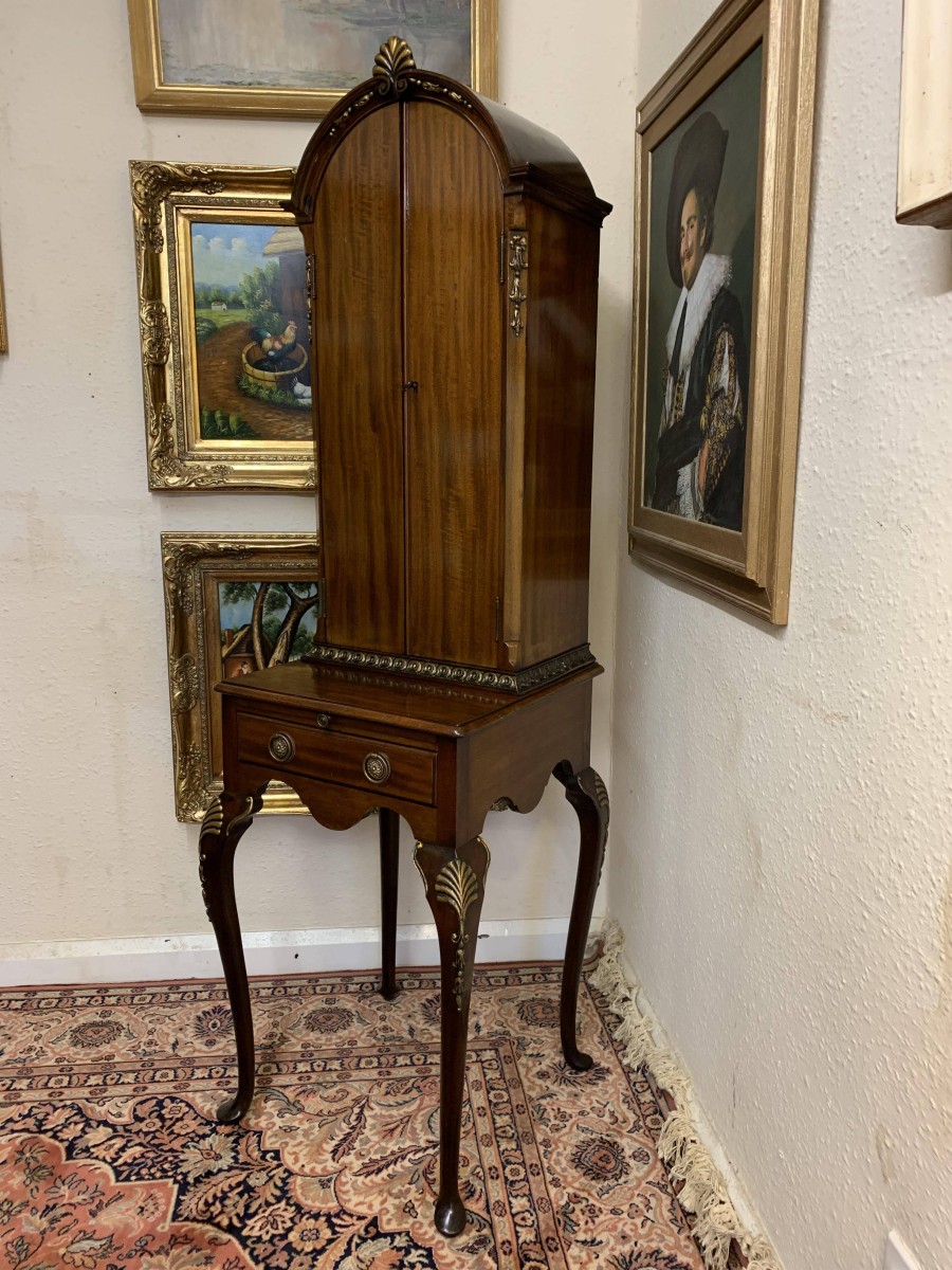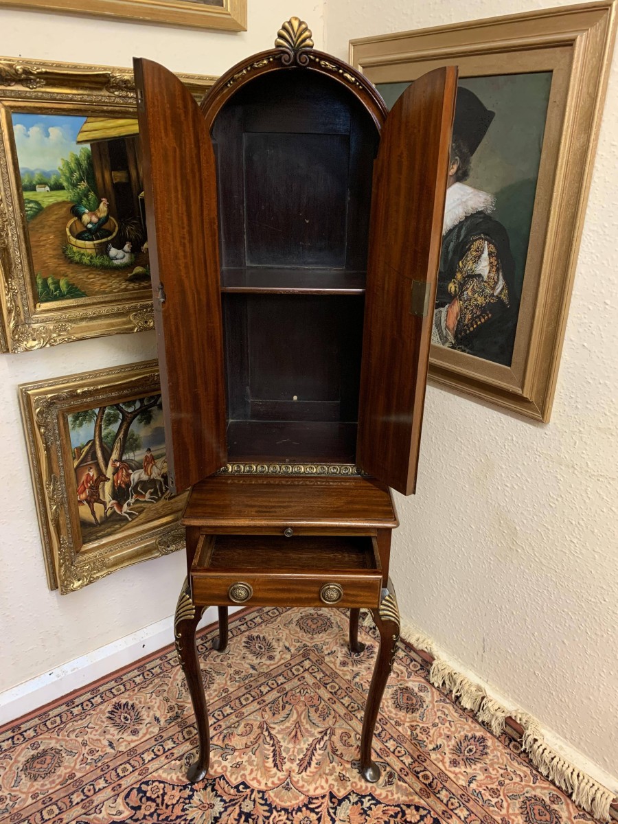 This unusual slender mahogany ladies cabinet oozes quality and dates circa 1910. The dome topped cabinet rises to a decorative gilt wood carving. Below are a pair of lockable doors, the doors having gilt wood decoration to the sides and to the base. The doors open to reveal a removable shelf. The base section has a pull out slide which sits above a drawer, the drawer having a pair of brass ring handles. Shaped skirt to the sides and front this pretty cabinet stands on four tall cabriole shaped legs with gilt decoration.
