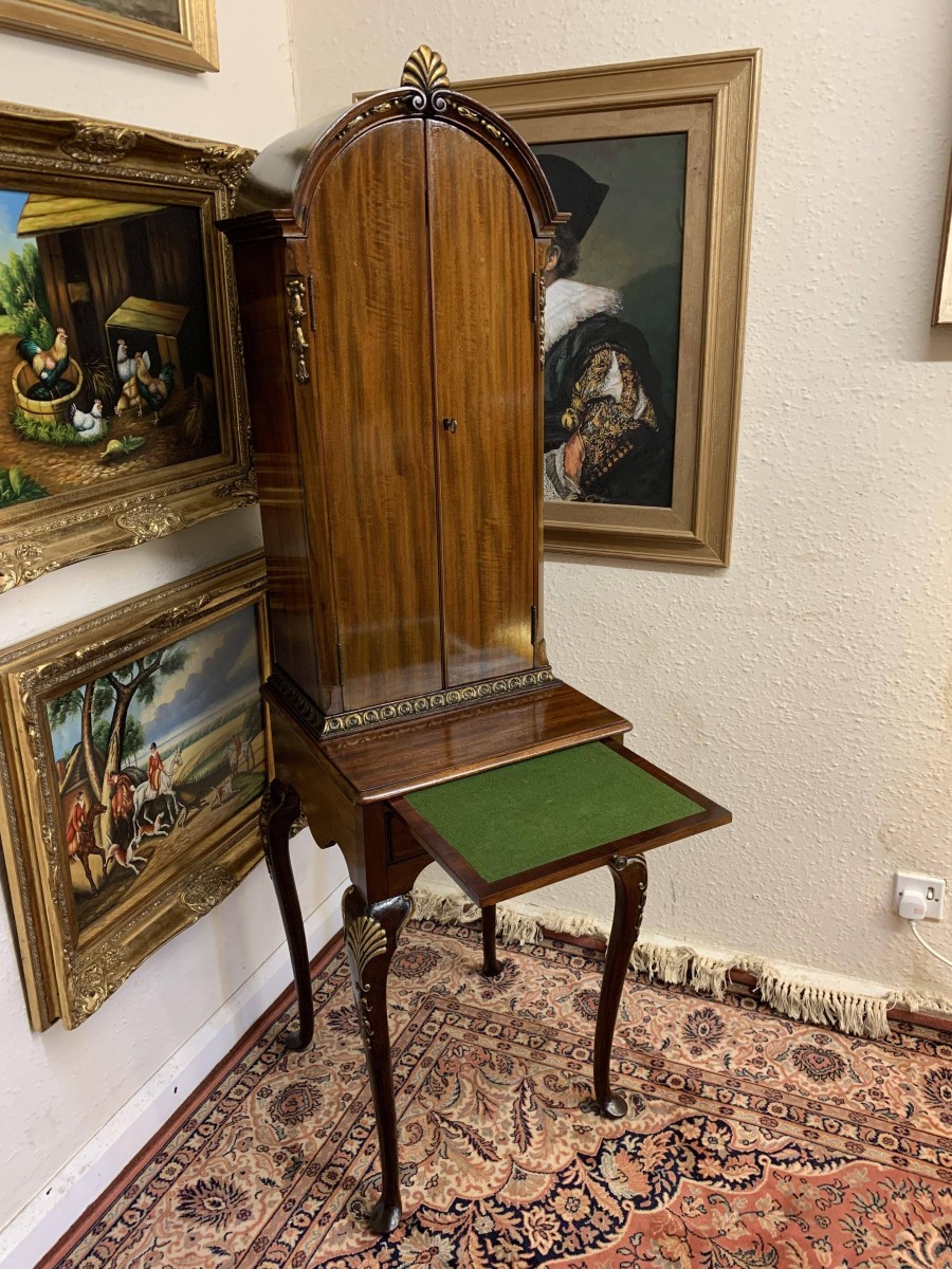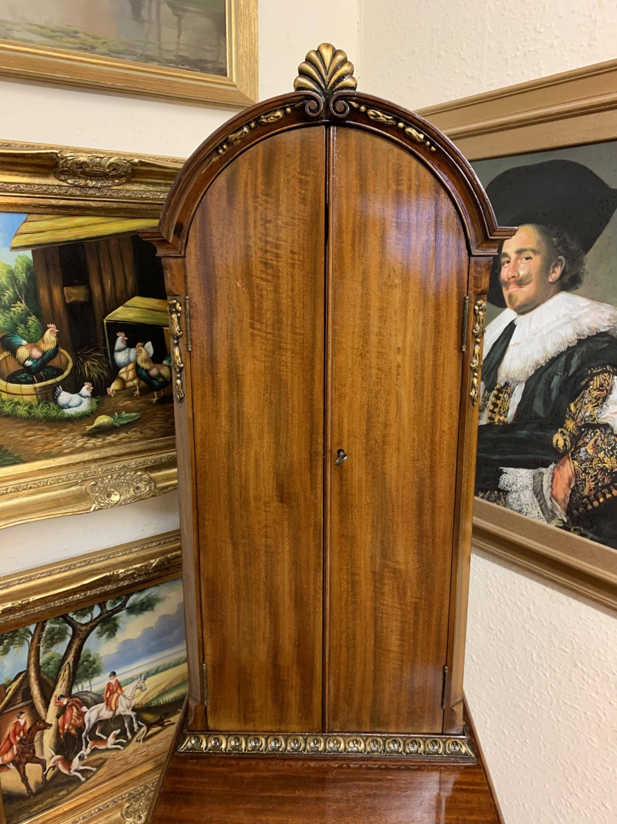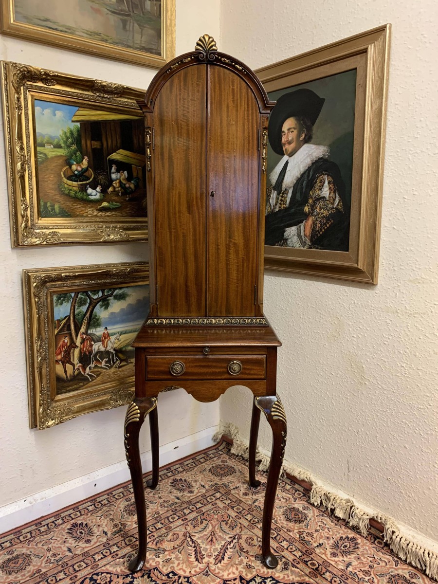This unusual slender mahogany ladies cabinet oozes quality and dates circa 1910. The dome topped cabinet rises to a decorative gilt wood carving. Below are a pair of lockable doors, the doors having gilt wood decoration to the sides and to the base. The doors open to reveal a removable shelf. The base section has a pull out slide which sits above a drawer, the drawer having a pair of brass ring handles. Shaped skirt to the sides and front this pretty cabinet stands on four tall cabriole shaped legs with gilt decoration.