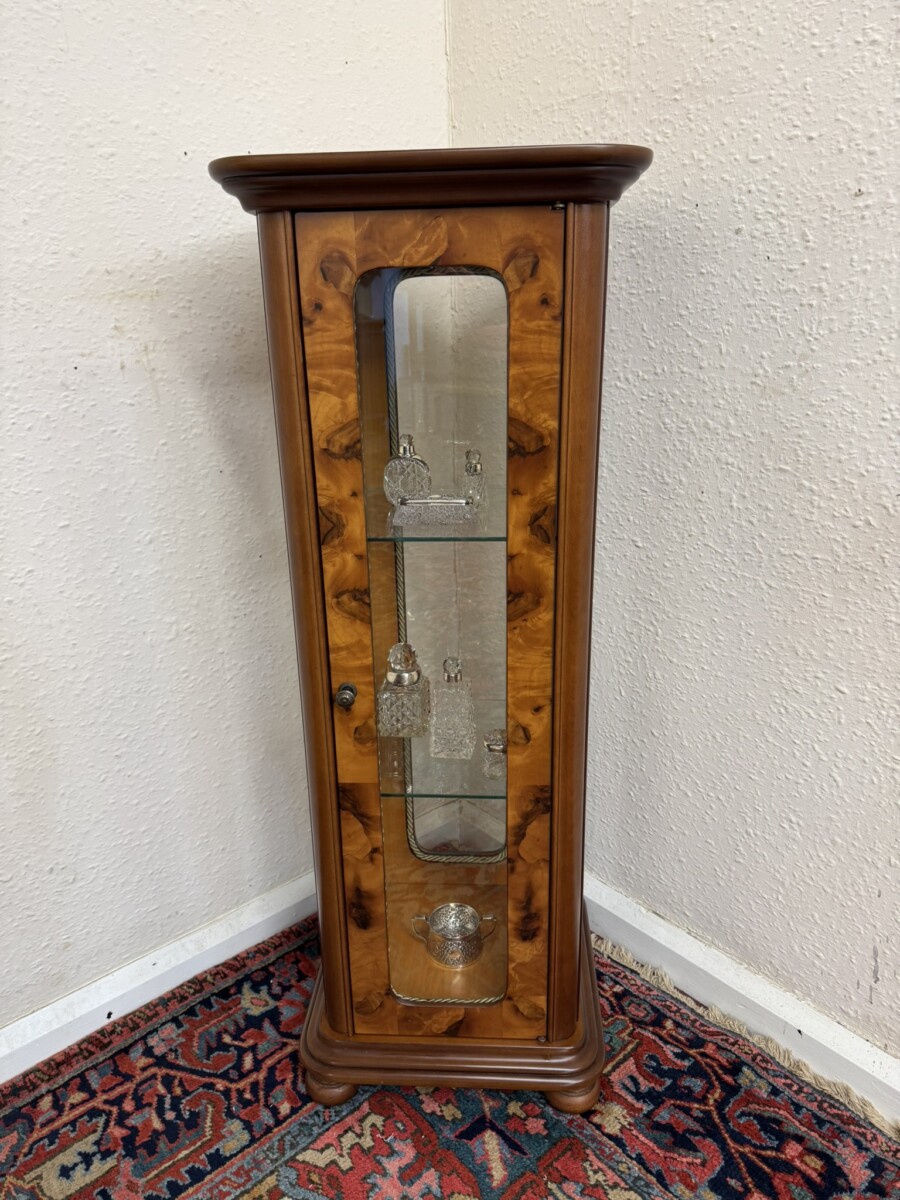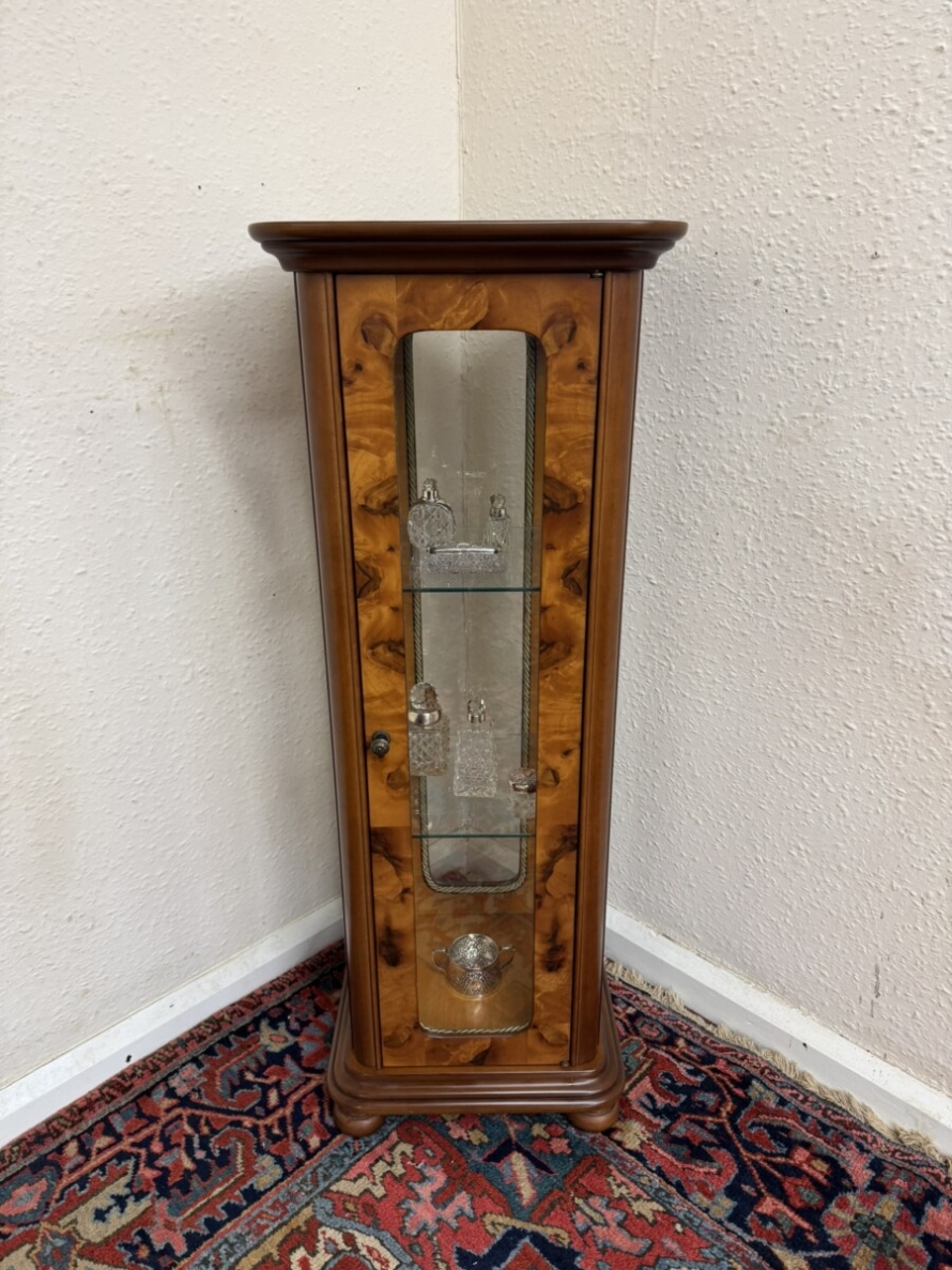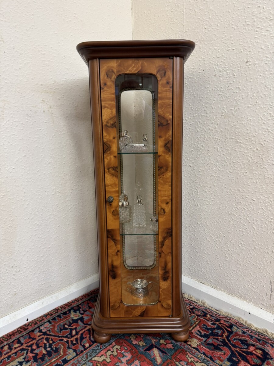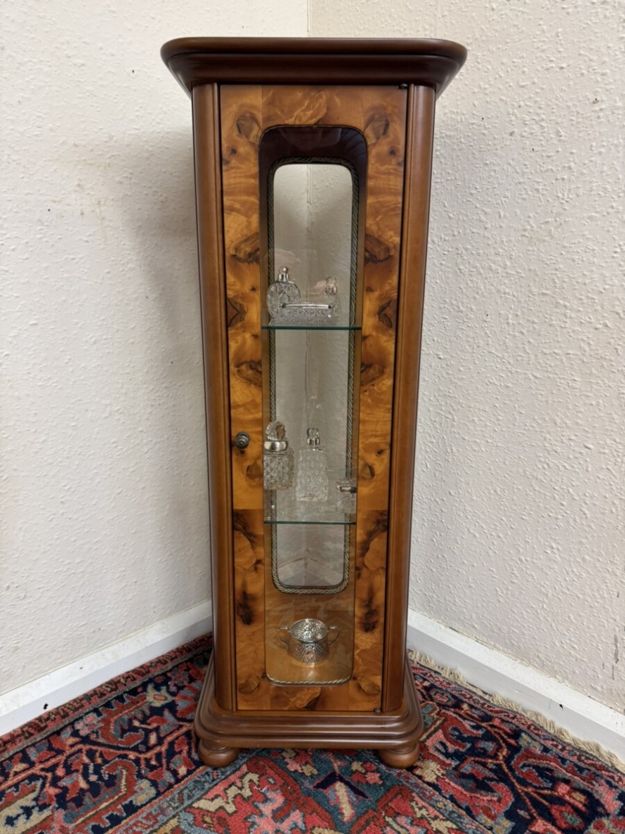 This slim walnut cabinet is in excellent condition. Narrow in design with four glazed sides for optimum display. With the door to the front has a brass knob handle and opens to reveal to glass fixed shelves. This lovely cabinet stands on four turned feet.