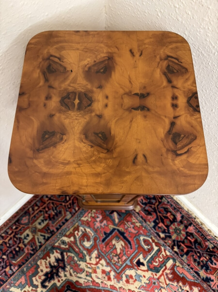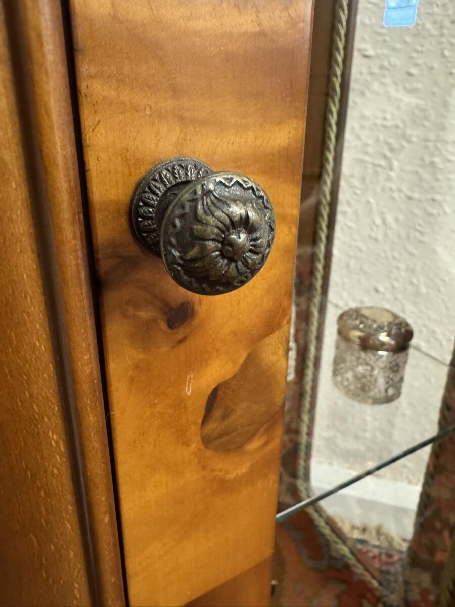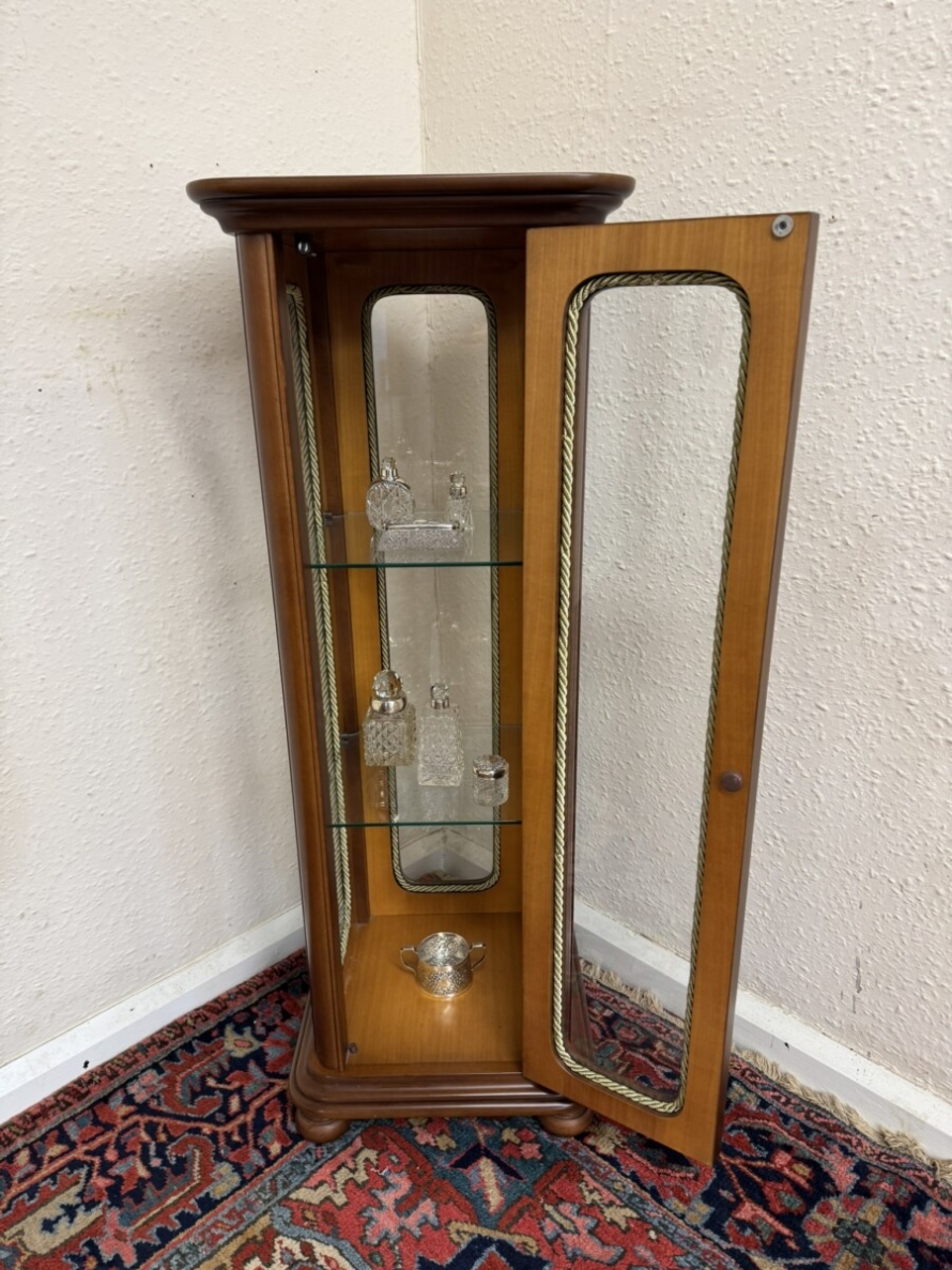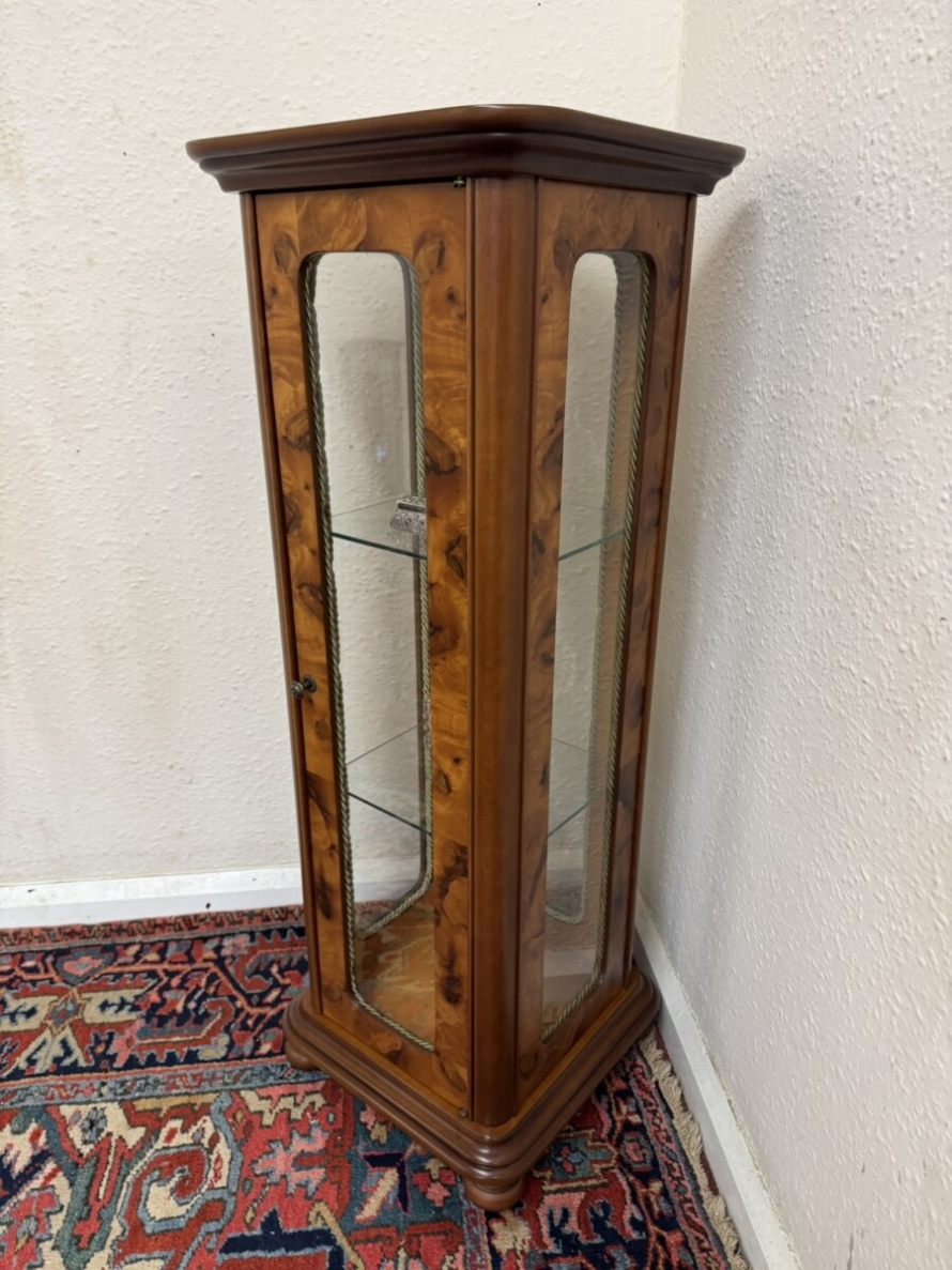 This slim walnut cabinet is in excellent condition. Narrow in design with four glazed sides for optimum display. With the door to the front has a brass knob handle and opens to reveal to glass fixed shelves. This lovely cabinet stands on four turned feet.
