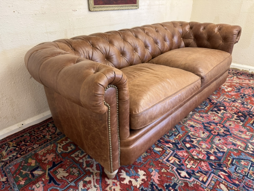 The sofa is made in a beautifully soft tan leather. Having buttoned back and scroll arms with studded decoration to the front. Two removable seat cushions and standing on turned feet to the front.