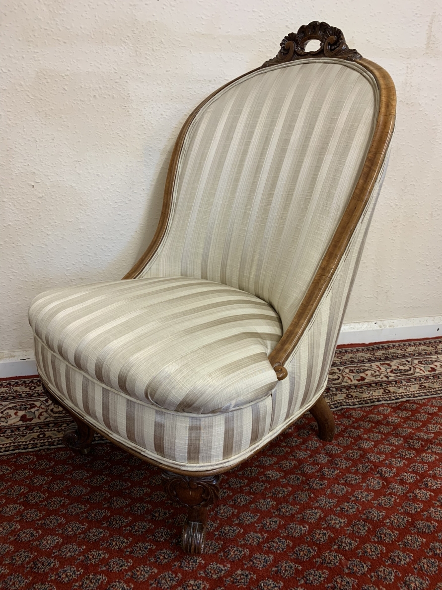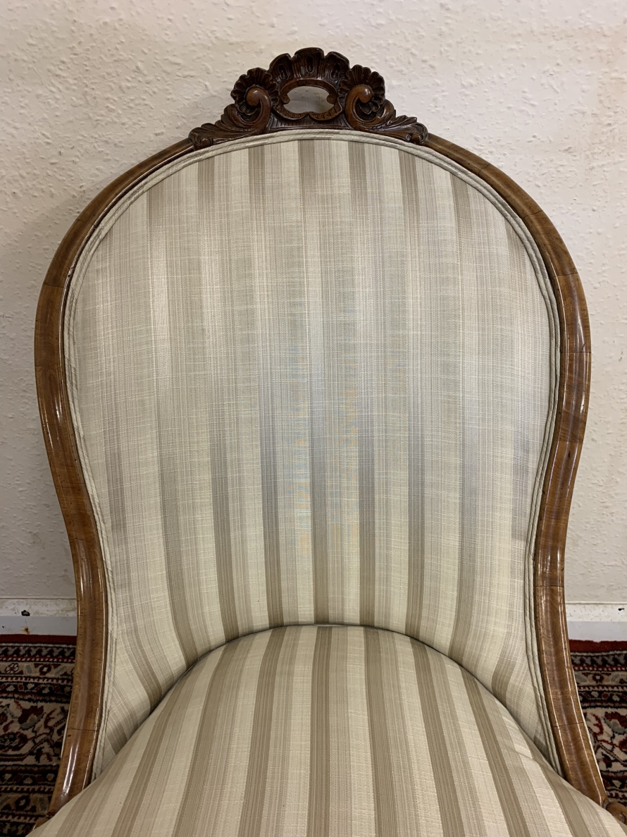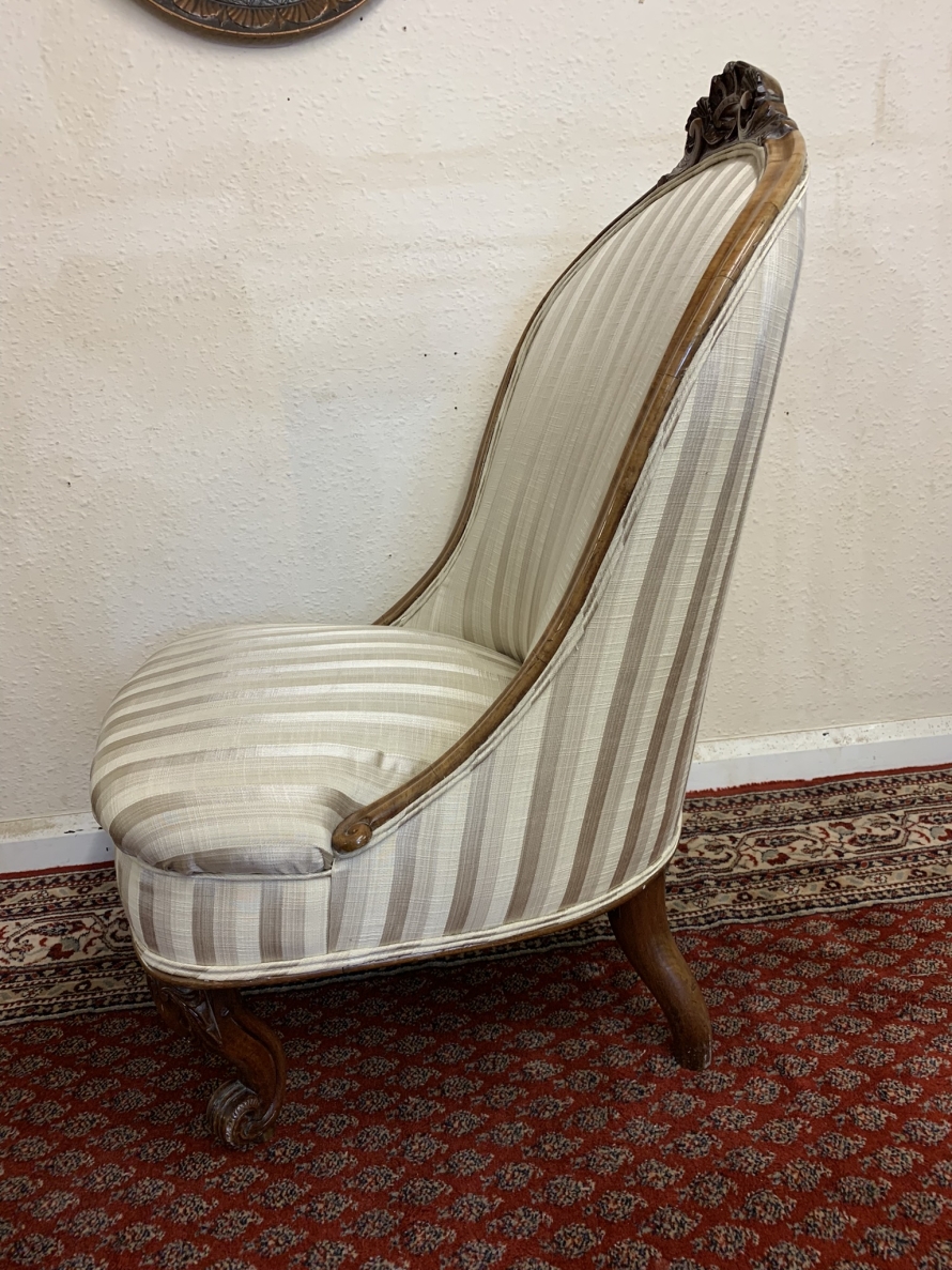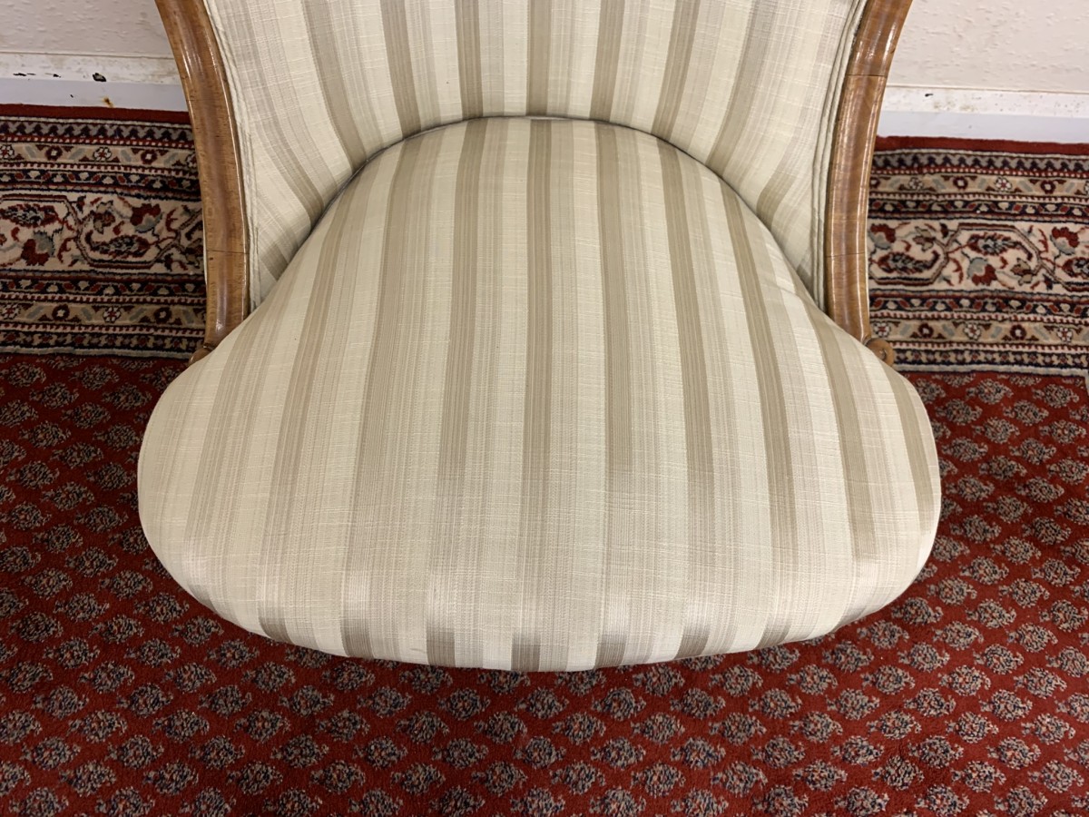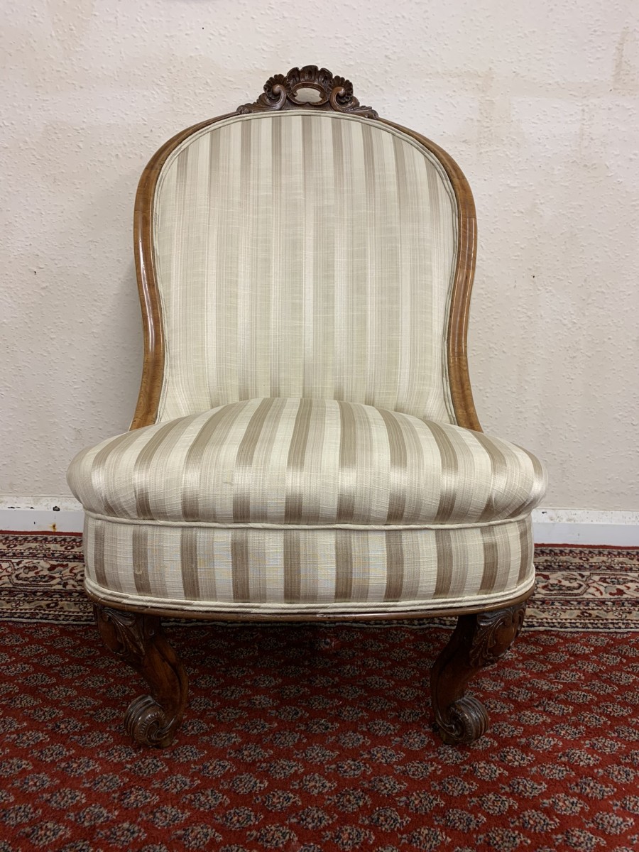 Made in stunning Burr Walnut the chair dates circa 1880. The hoop back has a fabulous central carving. Quality neutral striped upholstery with piping around the edge – the chair stands on two carved cabriole legs to the front.