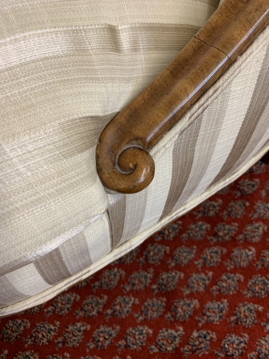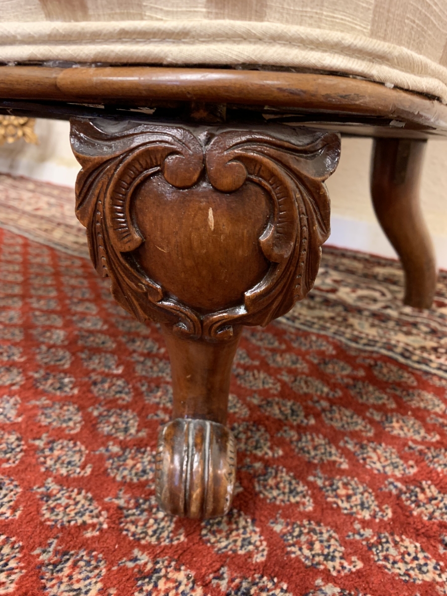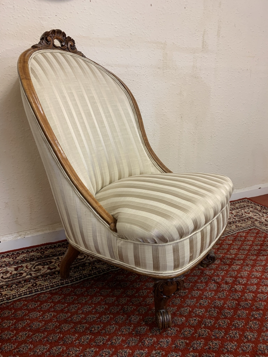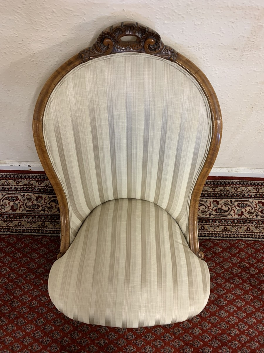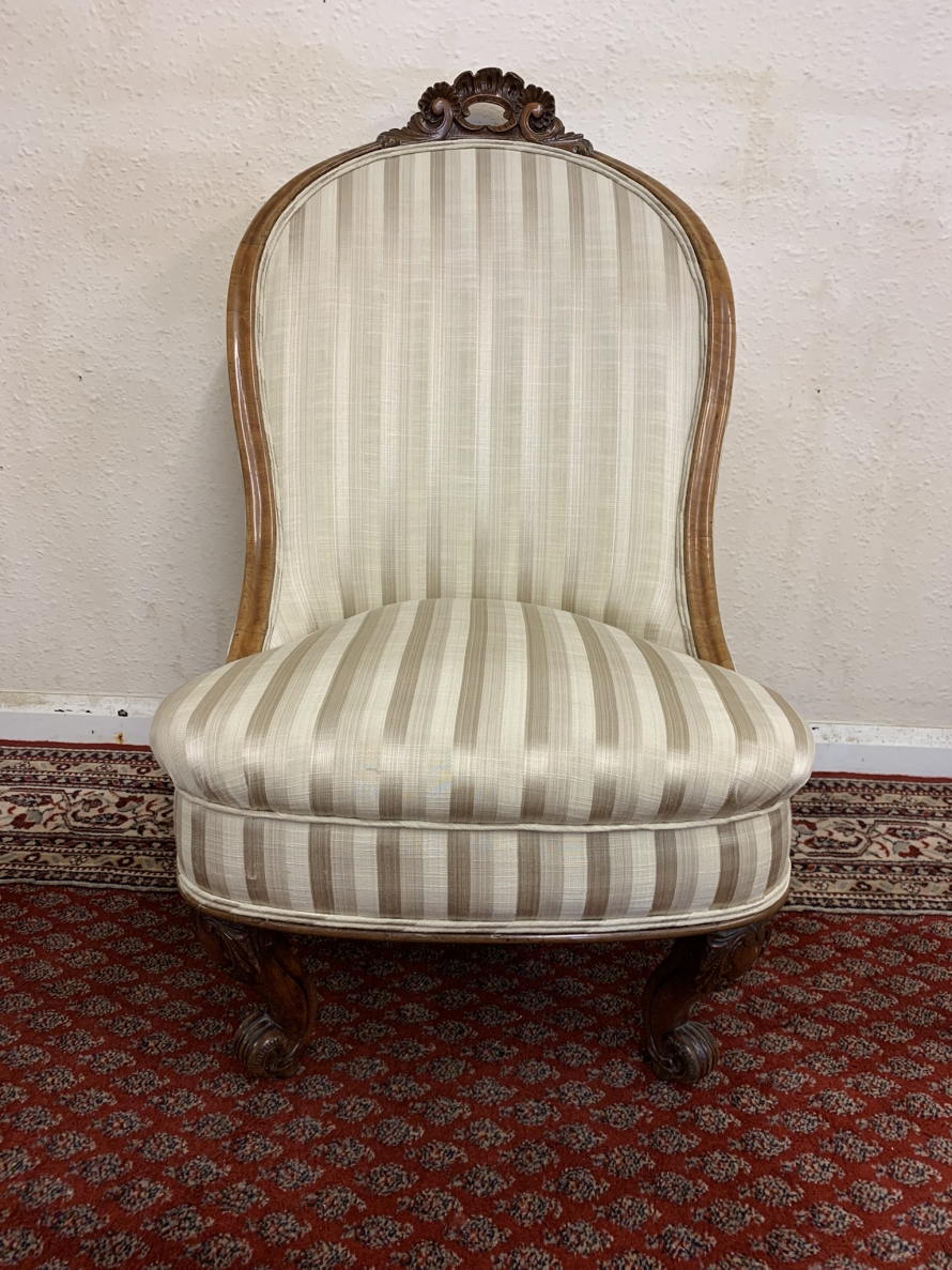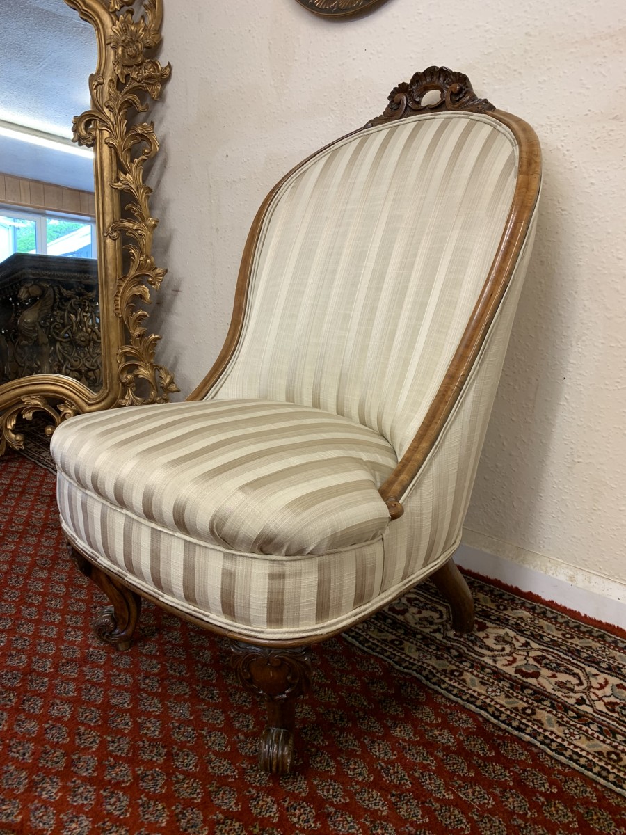 Made in stunning Burr Walnut the chair dates circa 1880. The hoop back has a fabulous central carving. Quality neutral striped upholstery with piping around the edge – the chair stands on two carved cabriole legs to the front.