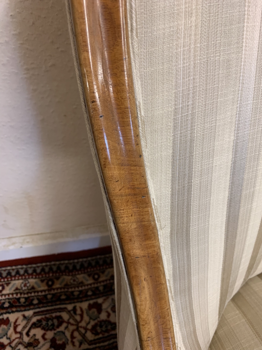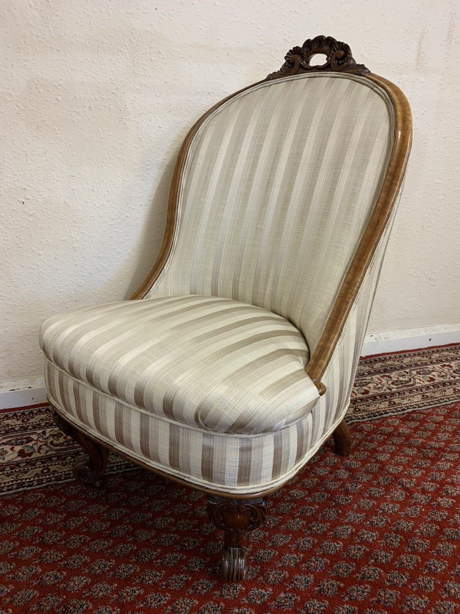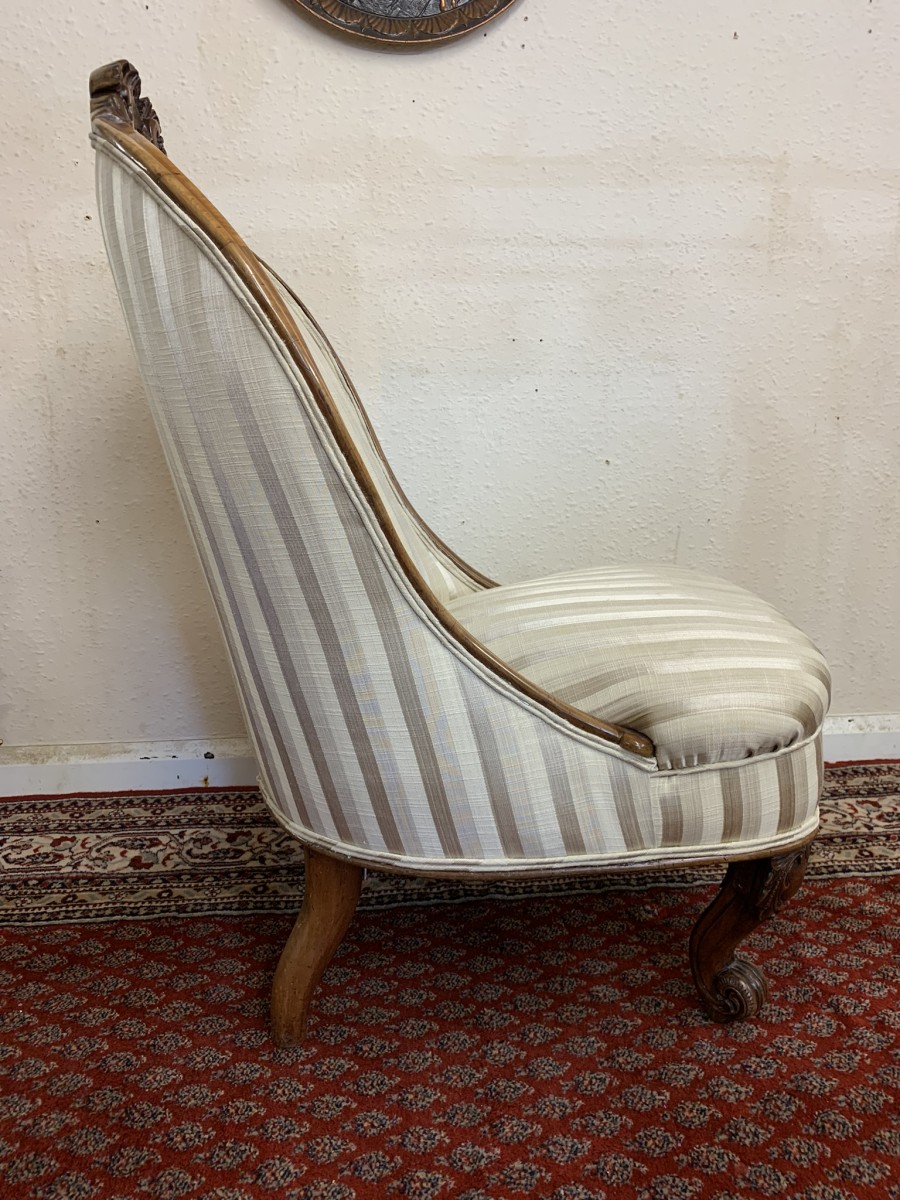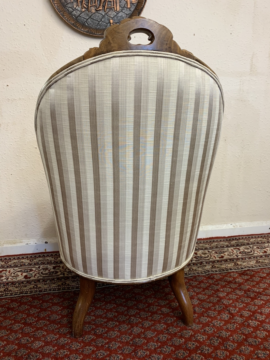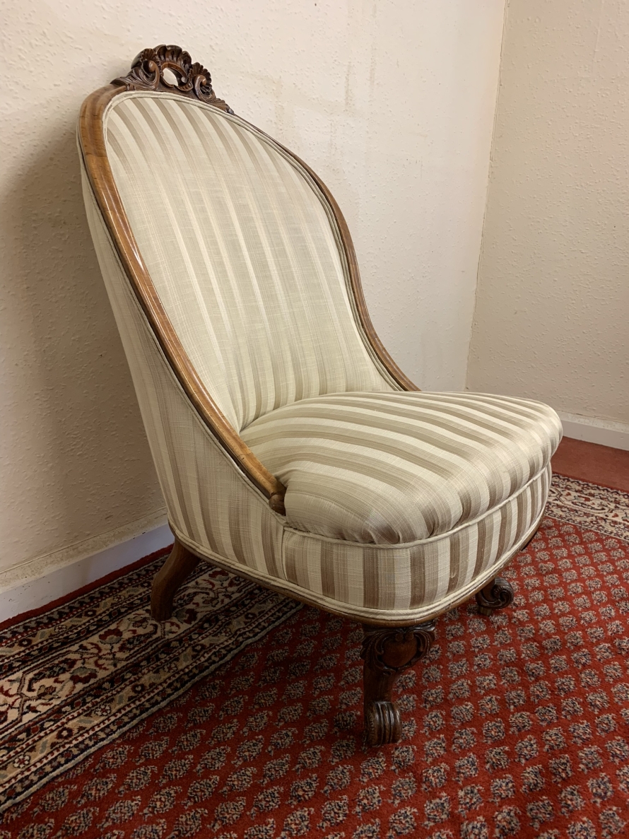 Made in stunning Burr Walnut the chair dates circa 1880. The hoop back has a fabulous central carving. Quality neutral striped upholstery with piping around the edge – the chair stands on two carved cabriole legs to the front.