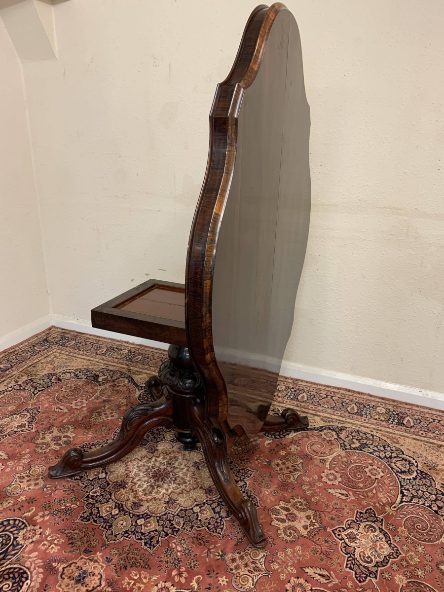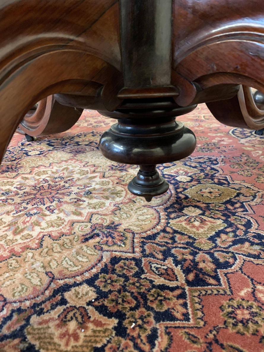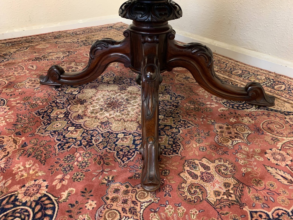 This beautiful table oozes quality, the craftsmanship is sublime. The shaped top has a moulded edge with a frieze below. Having a fantastic carved turned column with four shaped carved cabriole legs sitting on four original brass casters. The table has a tilt top adding versatility. Made in glorious rosewood this table is in excellent condition.