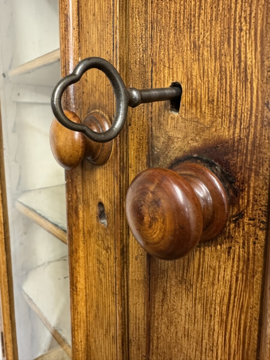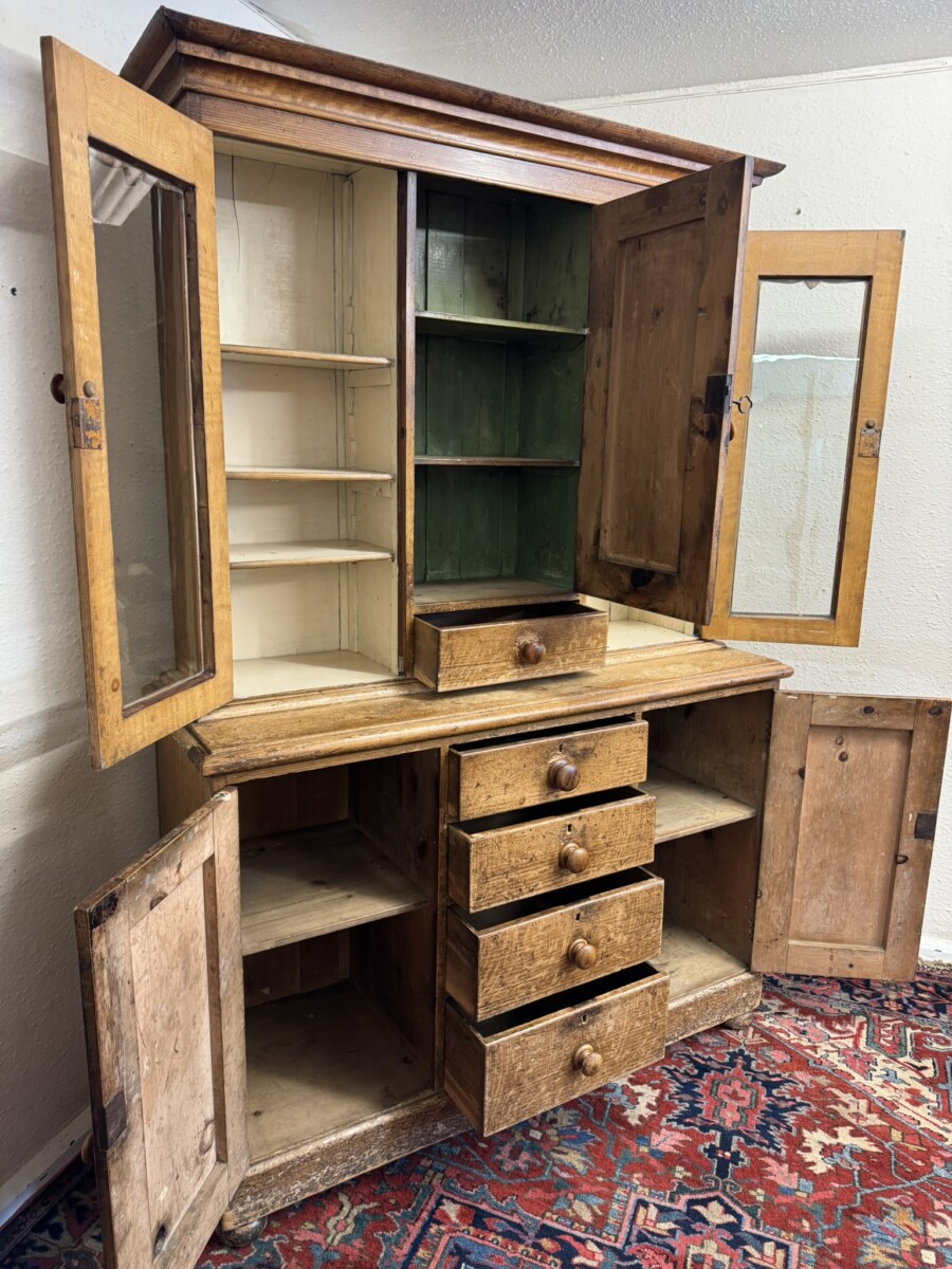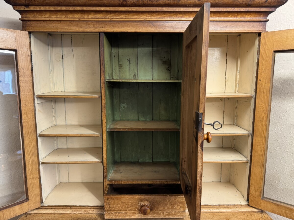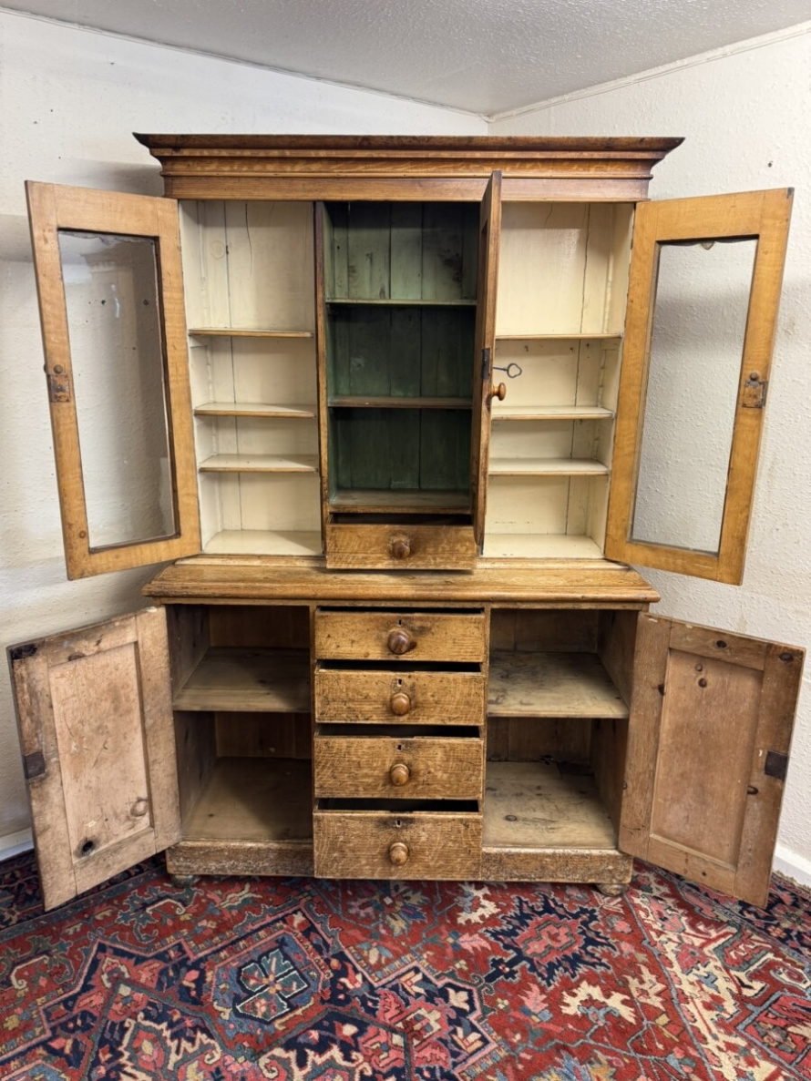 This un-touched housemaids cupboard with original paint dates circa 1850. The stepped cornice sits above a central lockable panelled door with a drawer below, two lockable glazed doors either side with original knob handles. The central door opens to reveal two fixed shelves, the left-hand right-hand glazed doors open to reveal three fixed shelves. The base section having four lockable graduated drawers, each drawer having a turn knob handle the drawers are flanked by a pair of panelled cupboard doors, each door opens to reveal a fixed shelf. Plinth base and standing on four turned feet.