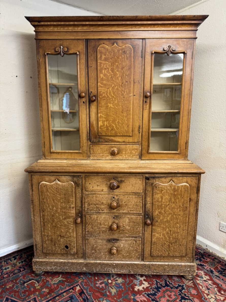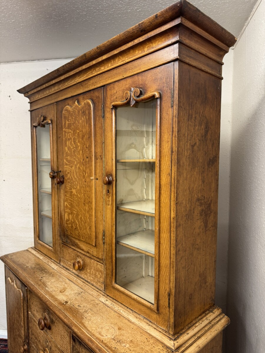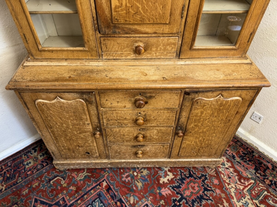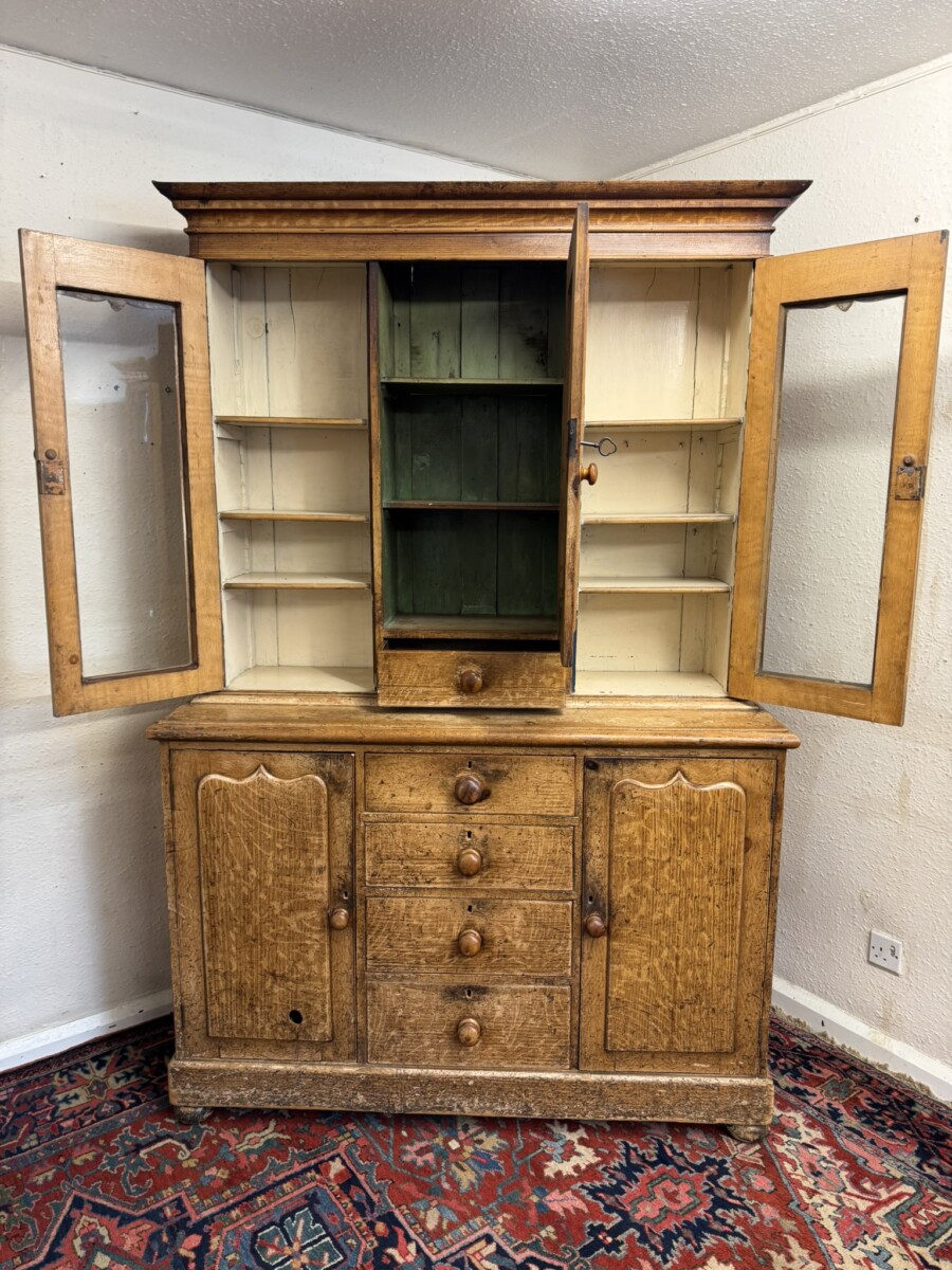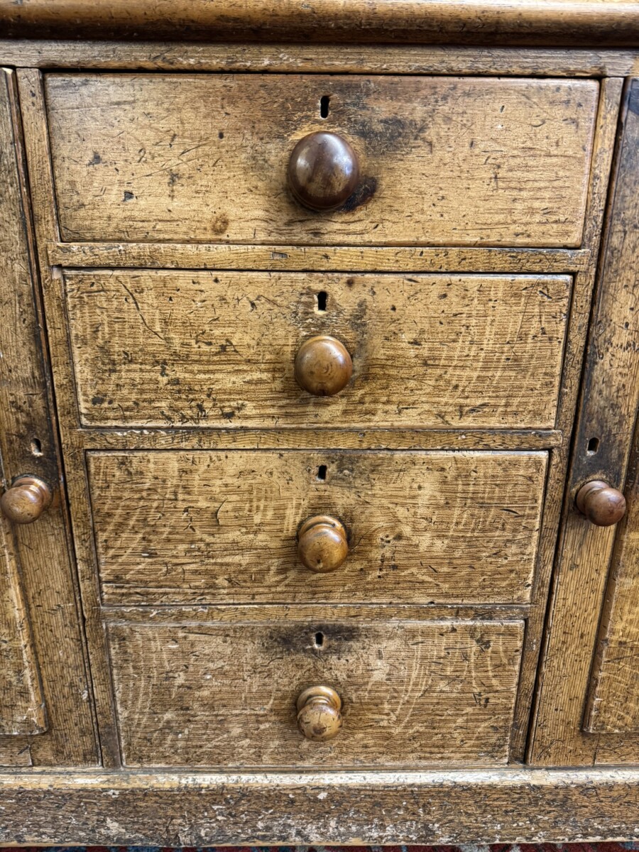 This un-touched housemaids cupboard with original paint dates circa 1850. The stepped cornice sits above a central lockable panelled door with a drawer below, two lockable glazed doors either side with original knob handles. The central door opens to reveal two fixed shelves, the left-hand right-hand glazed doors open to reveal three fixed shelves. The base section having four lockable graduated drawers, each drawer having a turn knob handle the drawers are flanked by a pair of panelled cupboard doors, each door opens to reveal a fixed shelf. Plinth base and standing on four turned feet.