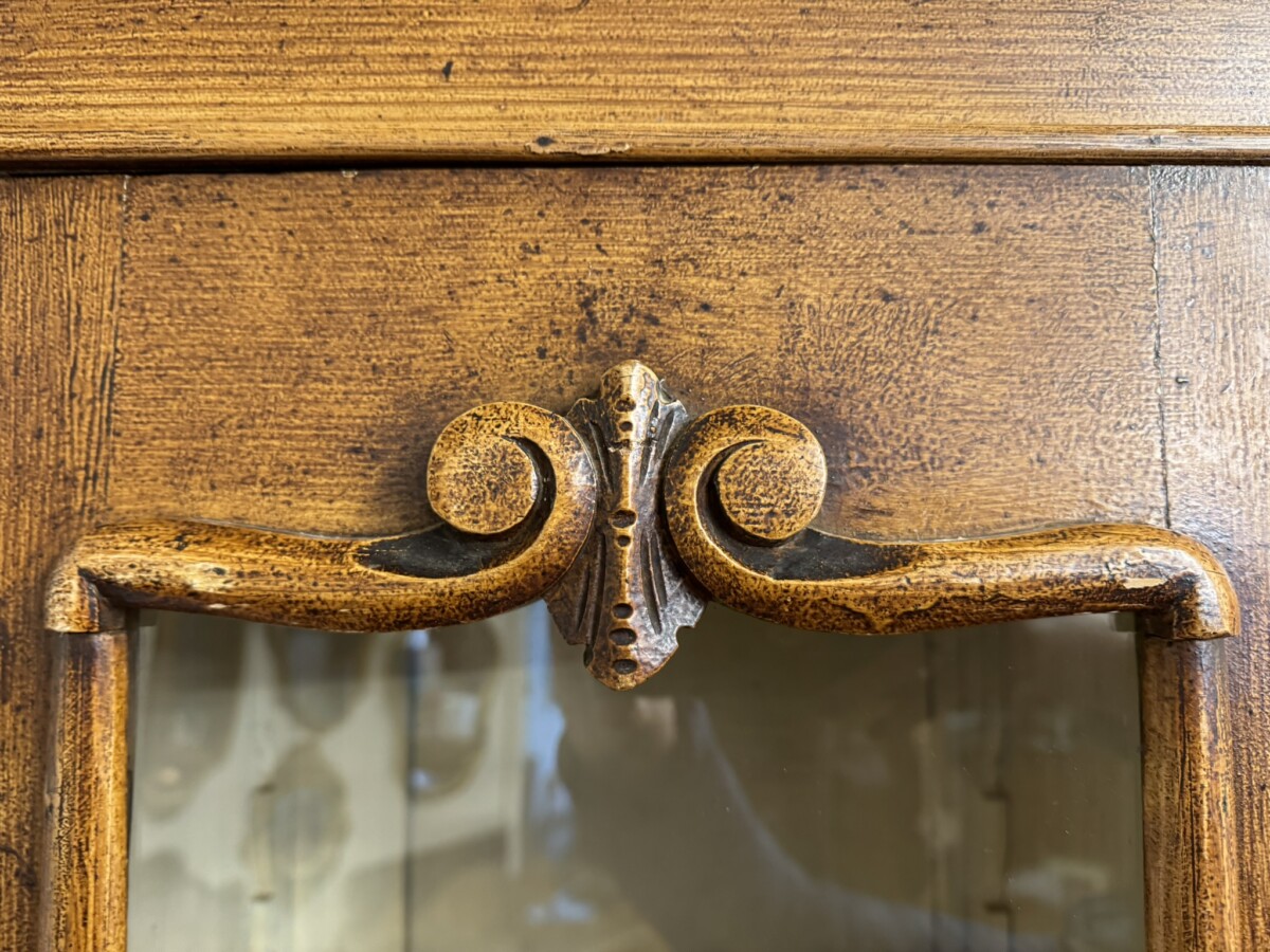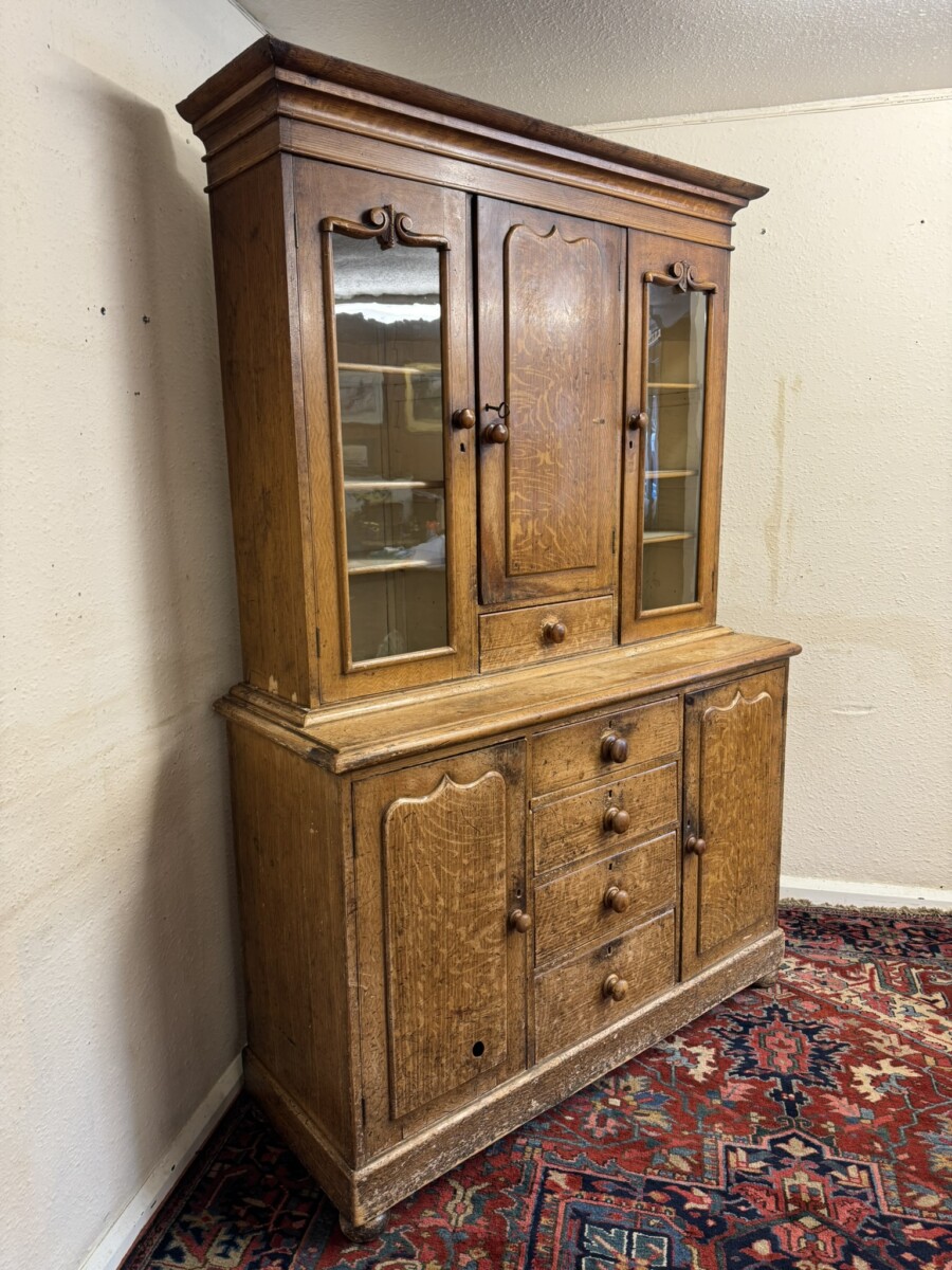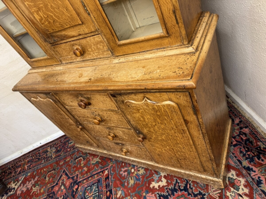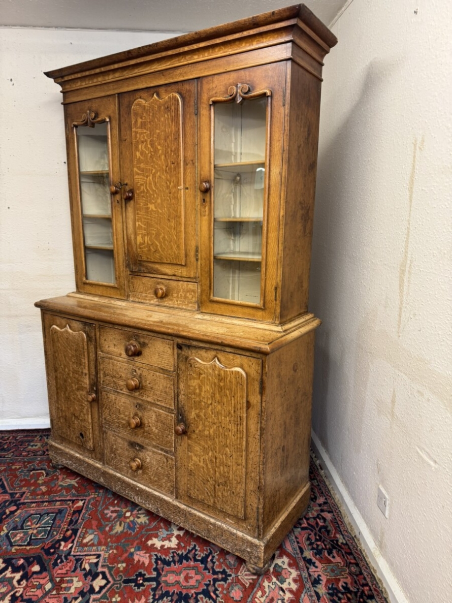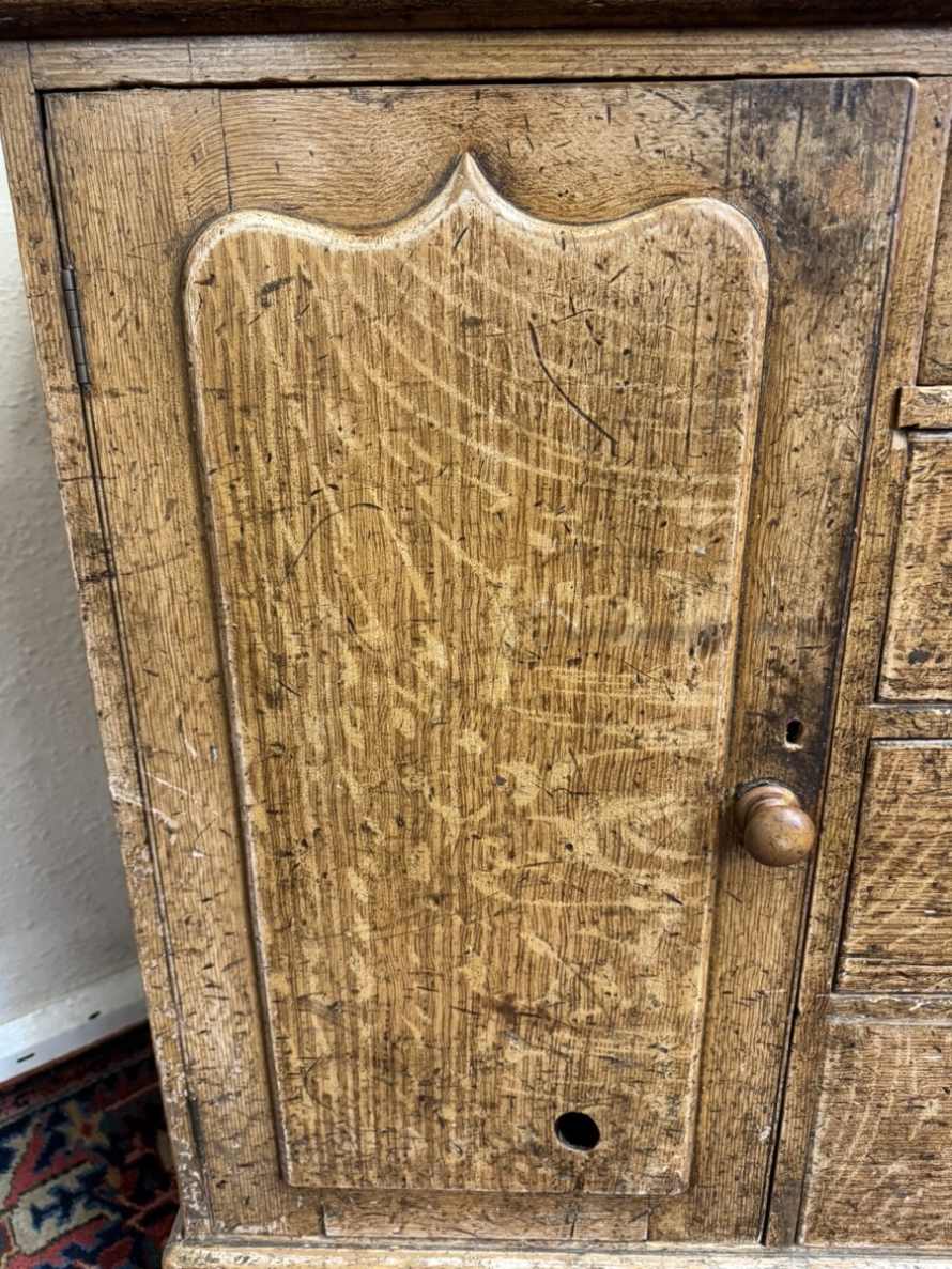 This un-touched housemaids cupboard with original paint dates circa 1850. The stepped cornice sits above a central lockable panelled door with a drawer below, two lockable glazed doors either side with original knob handles. The central door opens to reveal two fixed shelves, the left-hand right-hand glazed doors open to reveal three fixed shelves. The base section having four lockable graduated drawers, each drawer having a turn knob handle the drawers are flanked by a pair of panelled cupboard doors, each door opens to reveal a fixed shelf. Plinth base and standing on four turned feet.