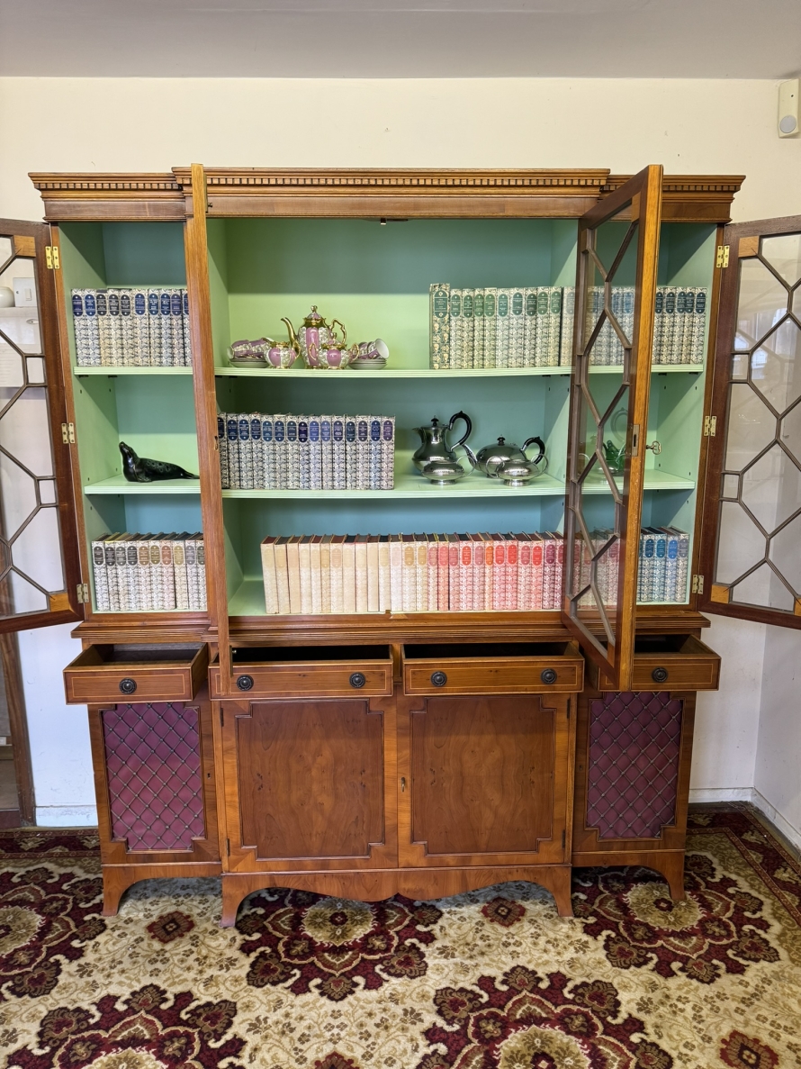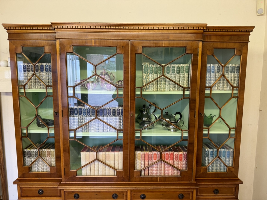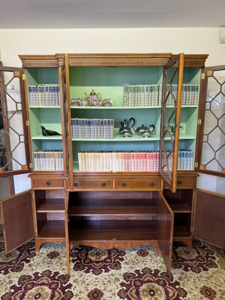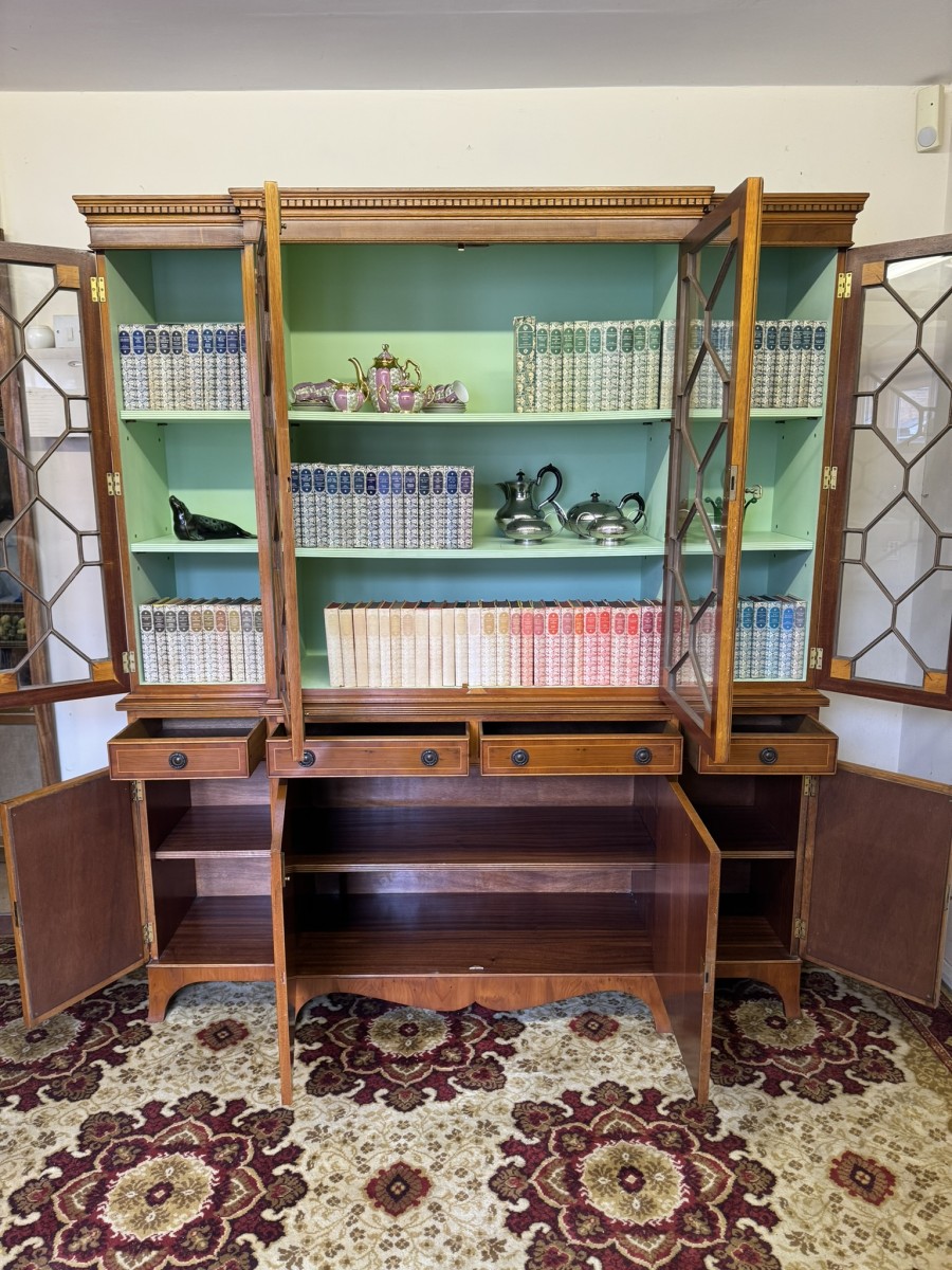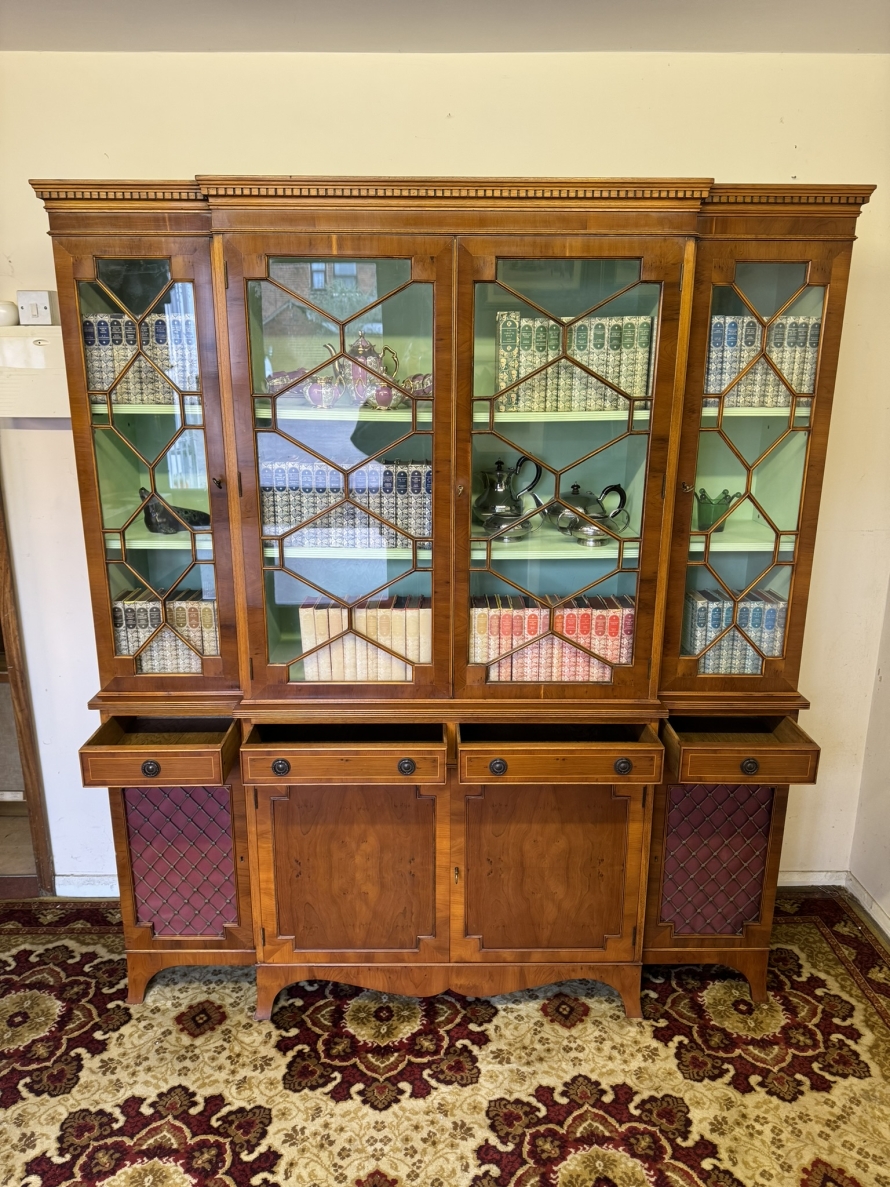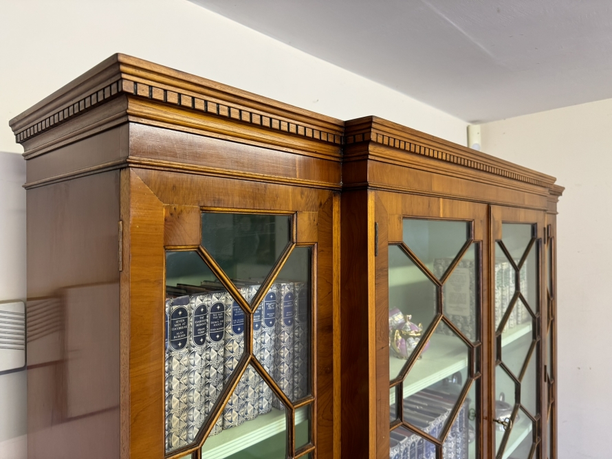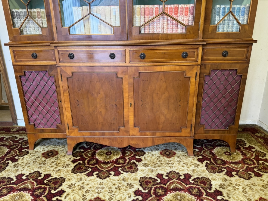 The oversailing top has dental decoration to the front, below are four lockable glazed doors, the doors have astral glazed wood barring. The central pair of doors are brakefront the doors open to reveal two adjustable and removable shelves, below are four drawers, the drawers sit above four lockable cupboard doors,. The end two cupboard doors have metal grill decoration. The doors open to reveal removable shelves. This stunning bookcase stands on six out swept bracket feet.