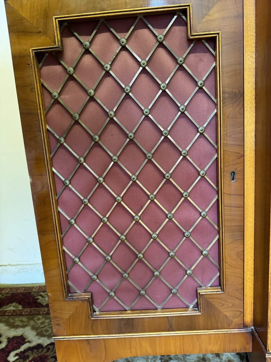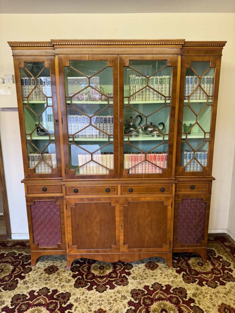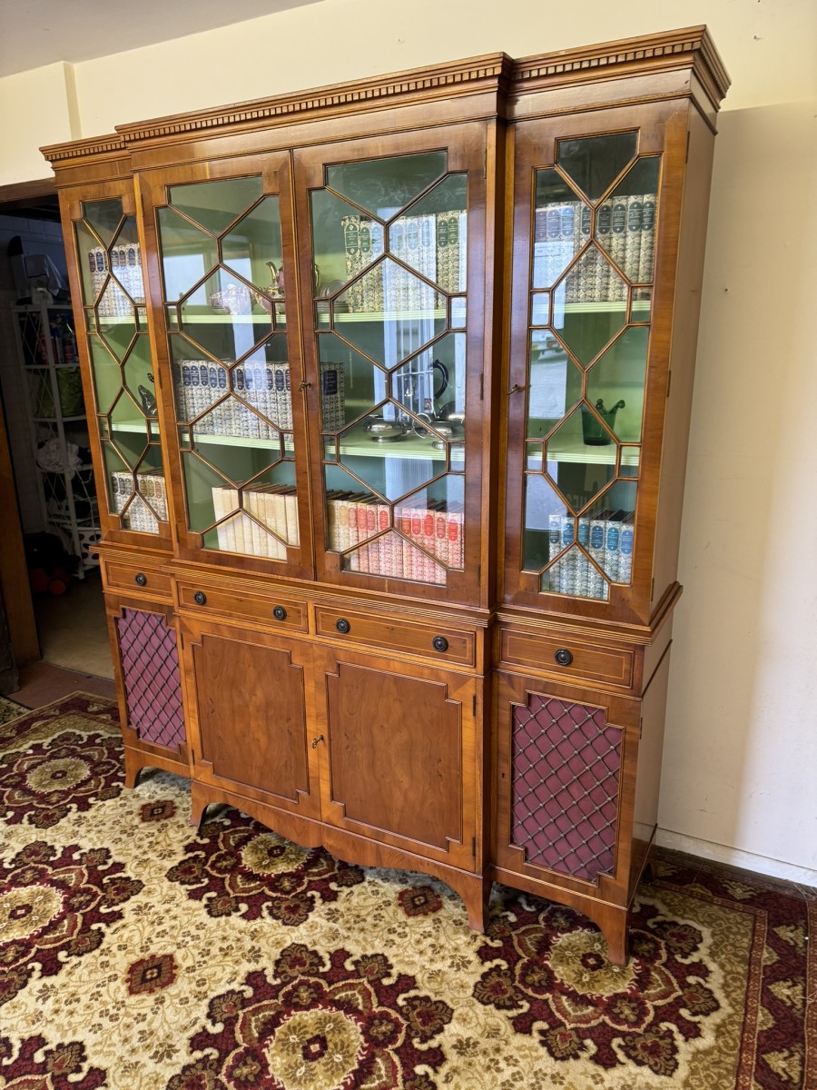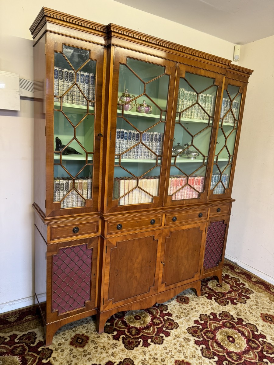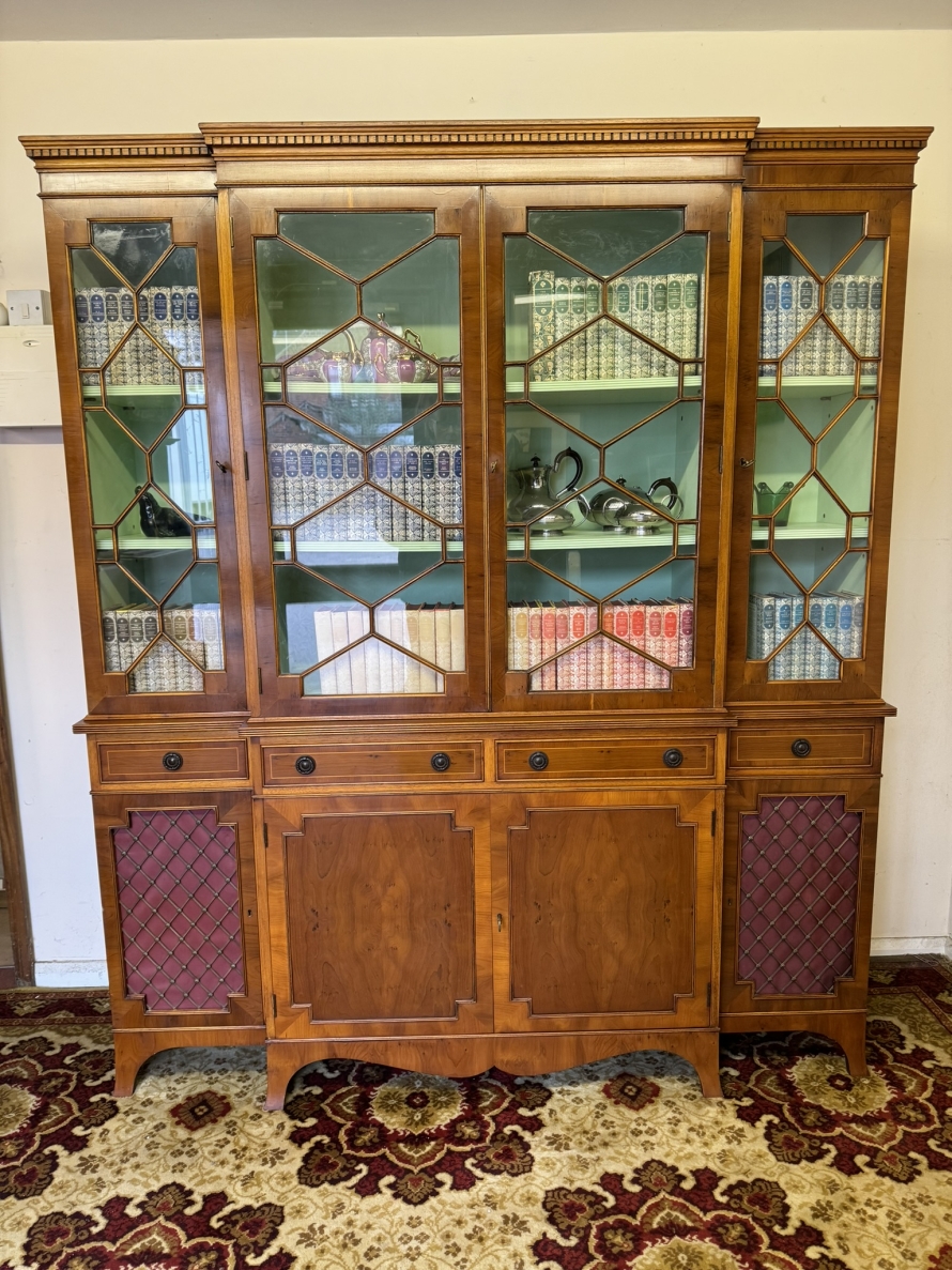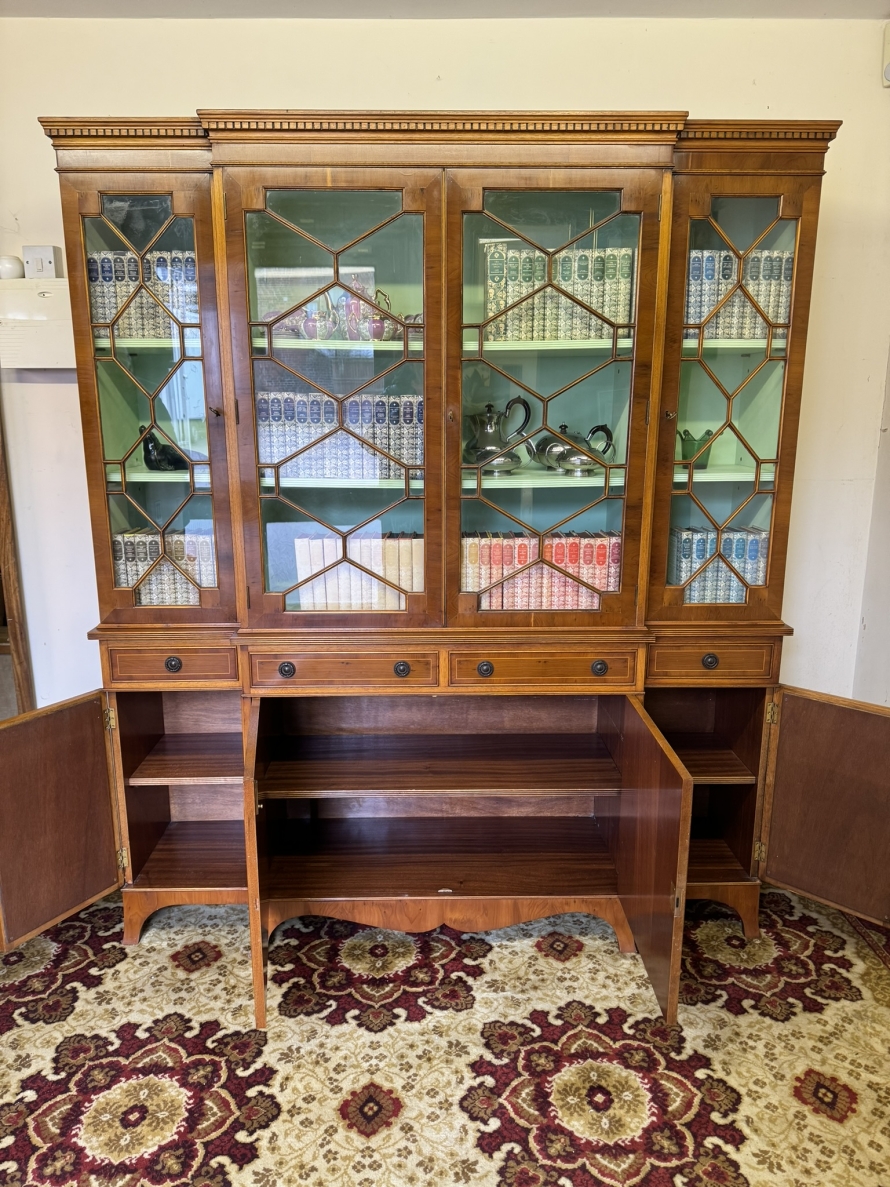 The oversailing top has dental decoration to the front, below are four lockable glazed doors, the doors have astral glazed wood barring. The central pair of doors are brakefront the doors open to reveal two adjustable and removable shelves, below are four drawers, the drawers sit above four lockable cupboard doors,. The end two cupboard doors have metal grill decoration. The doors open to reveal removable shelves. This stunning bookcase stands on six out swept bracket feet.