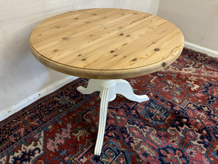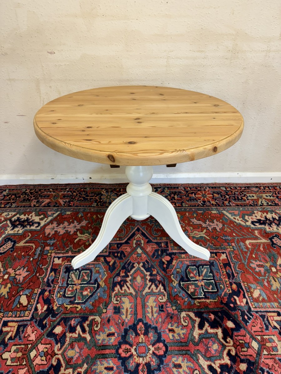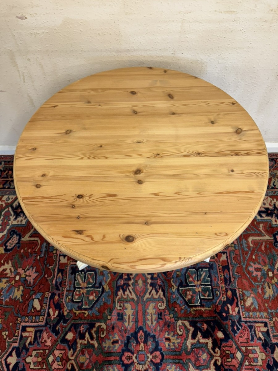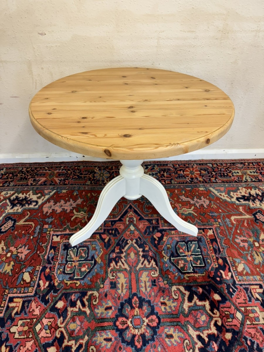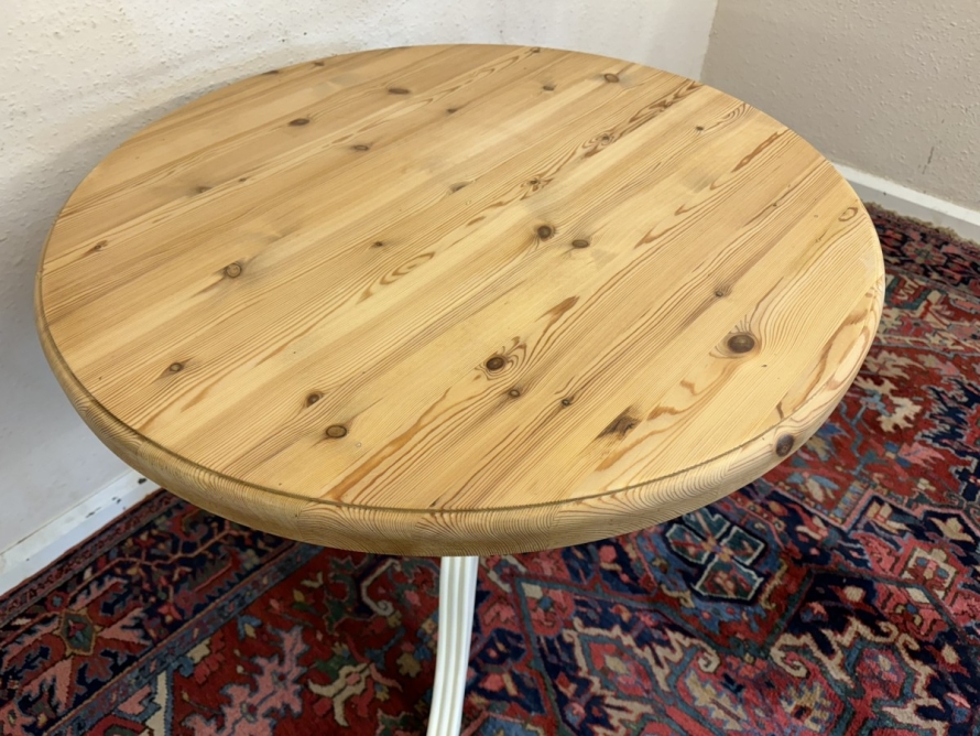 This neat sized round table is in excellent condition. The stripped pine top sits on a painted tripod base with out swept legs.