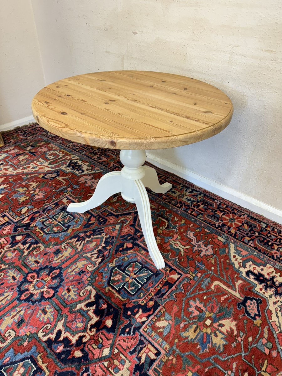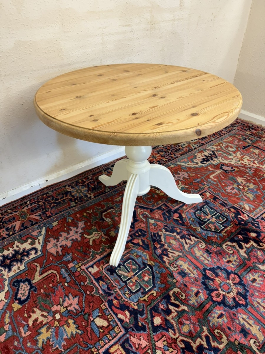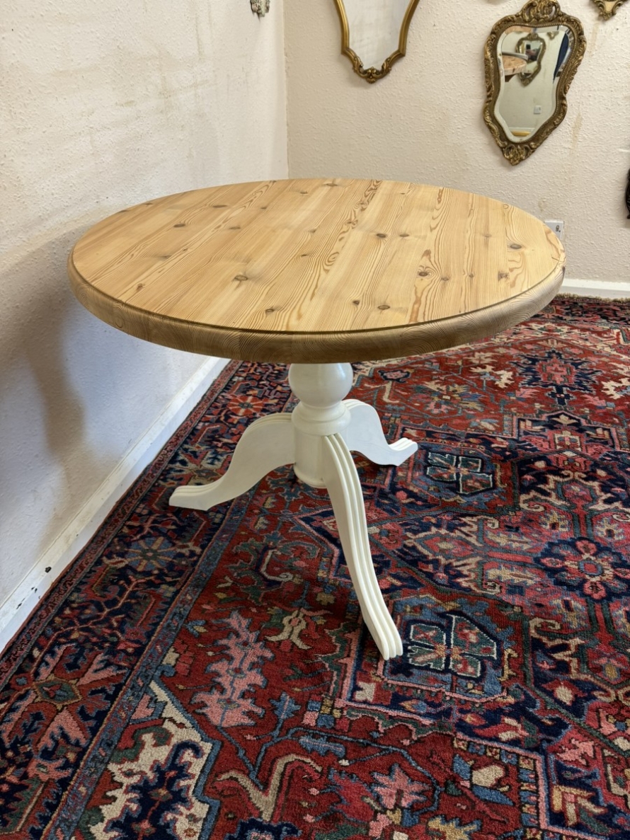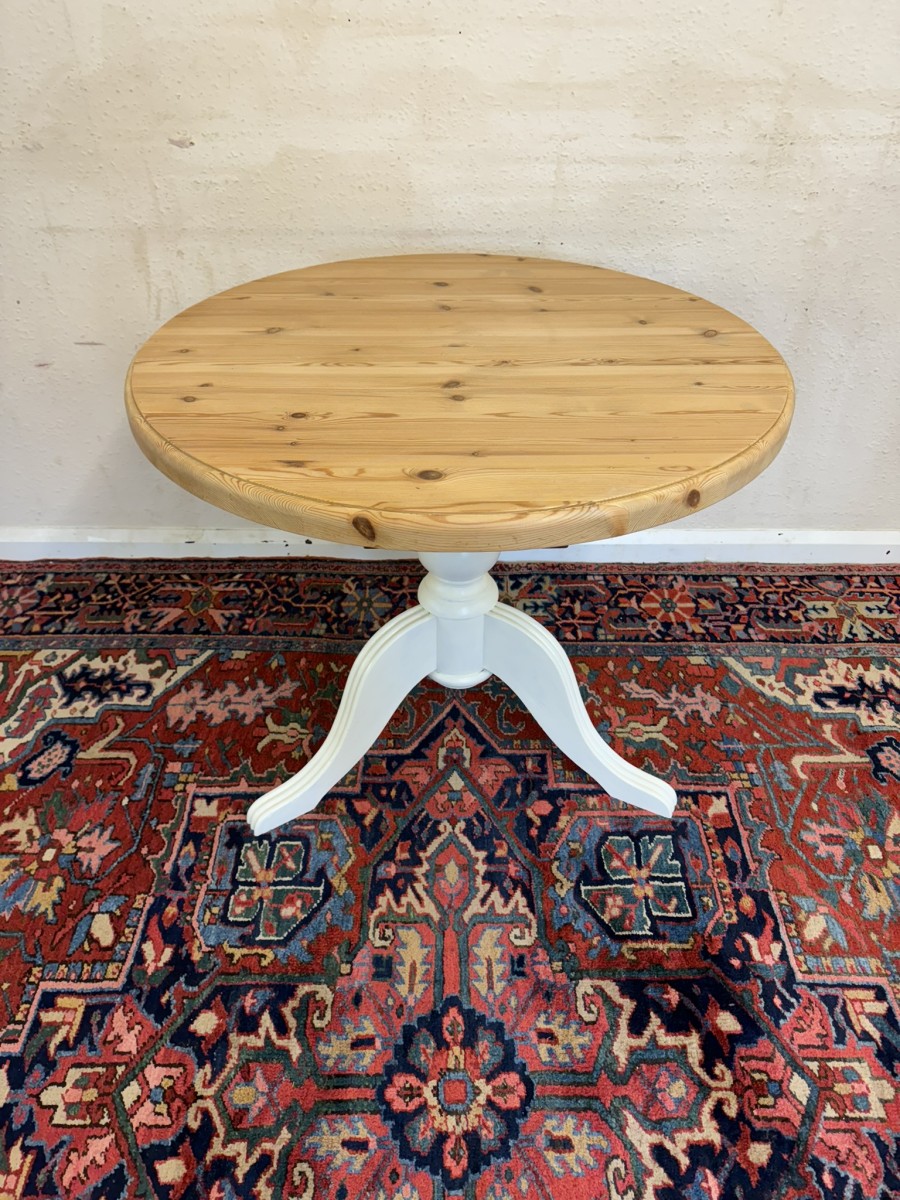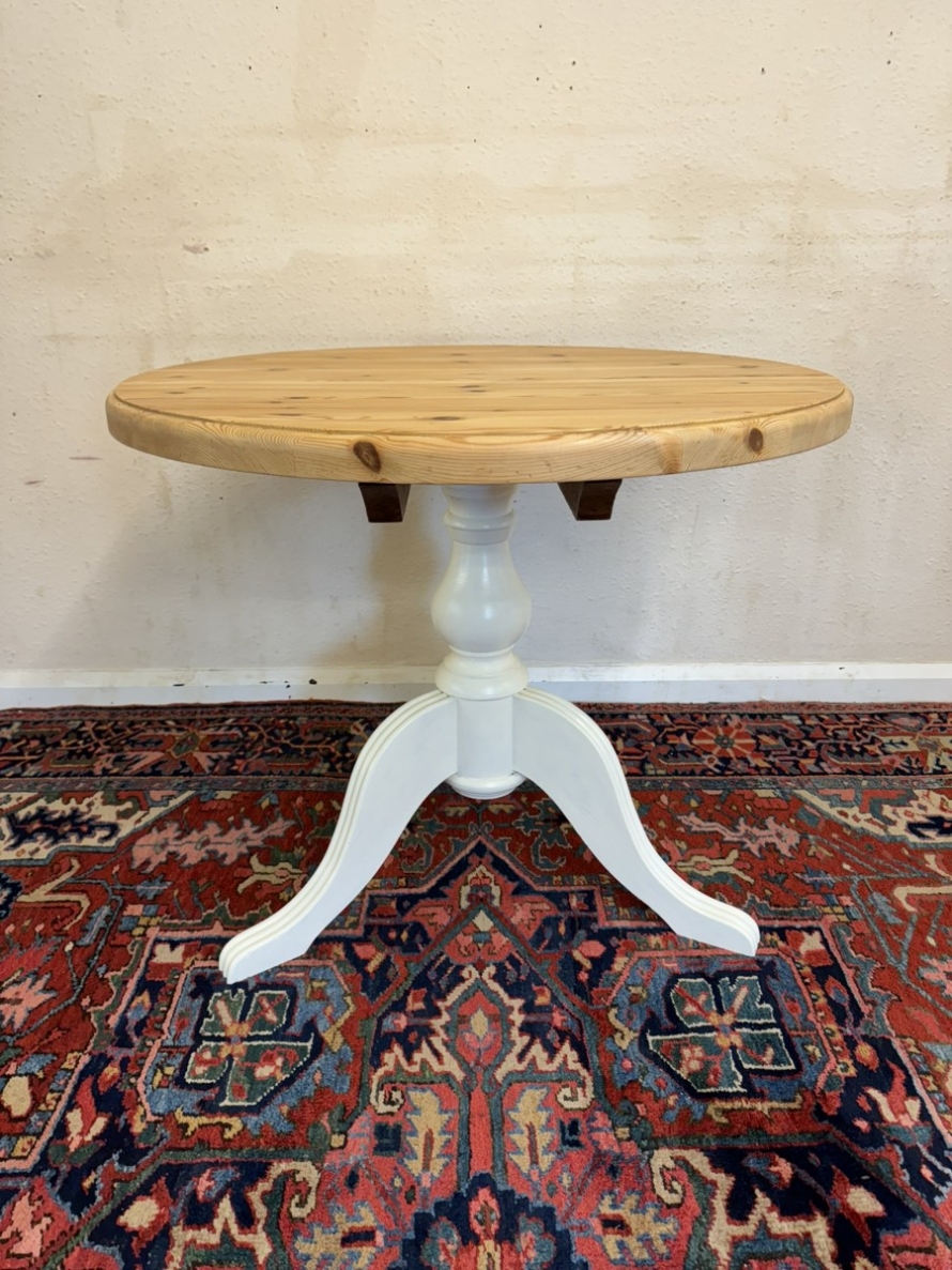 This neat sized round table is in excellent condition. The stripped pine top sits on a painted tripod base with out swept legs.