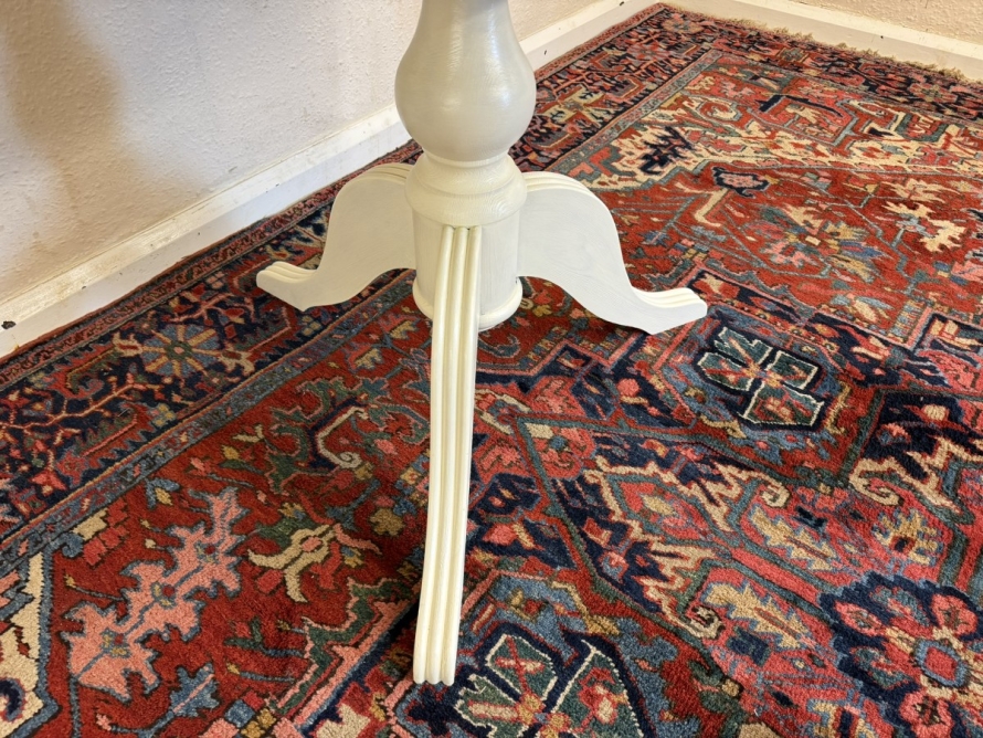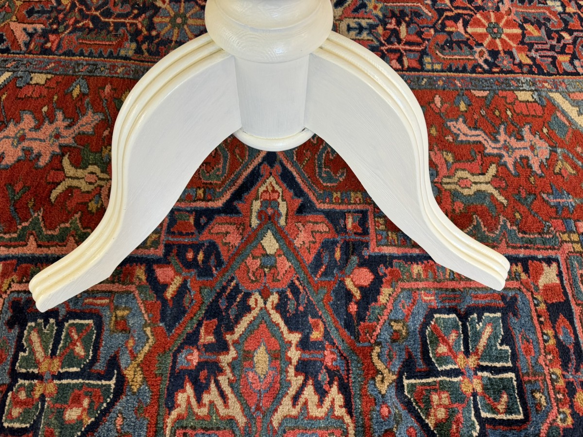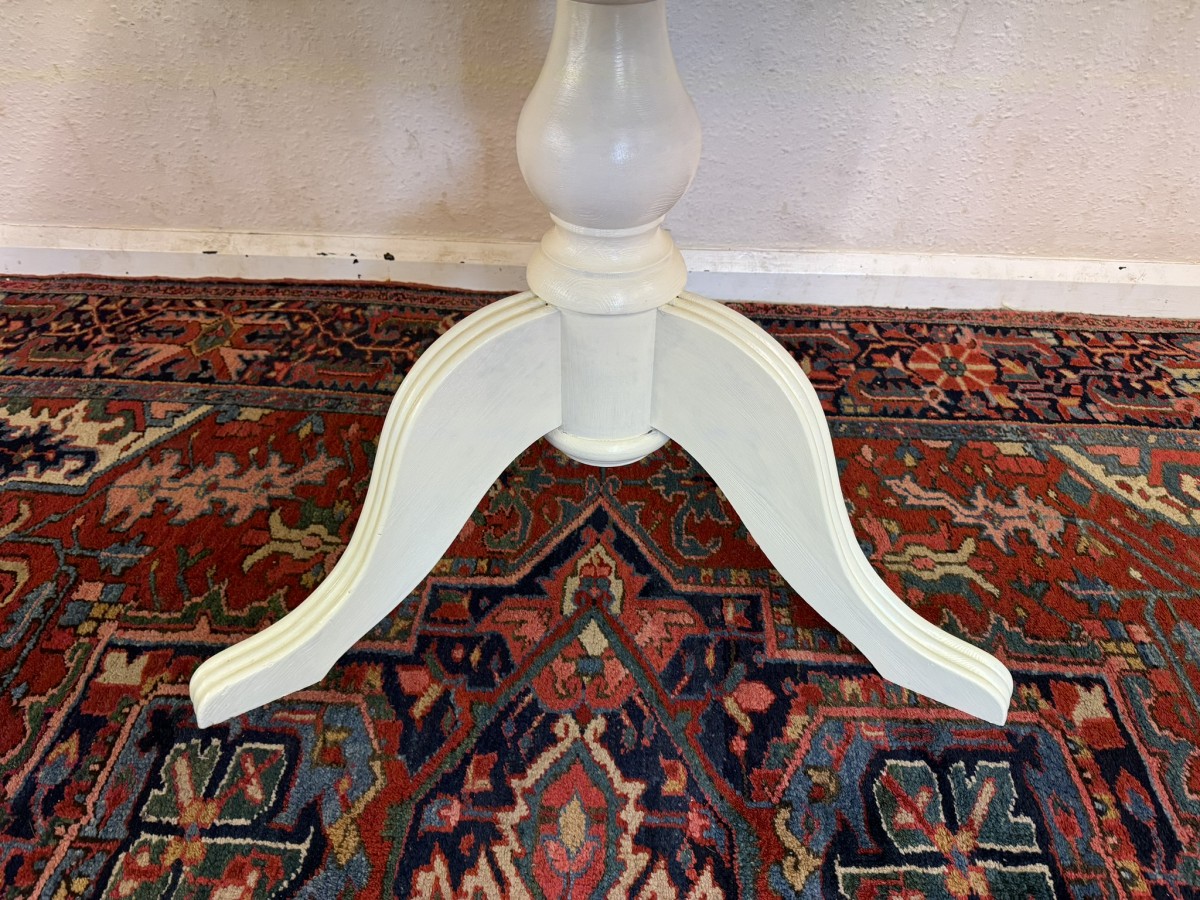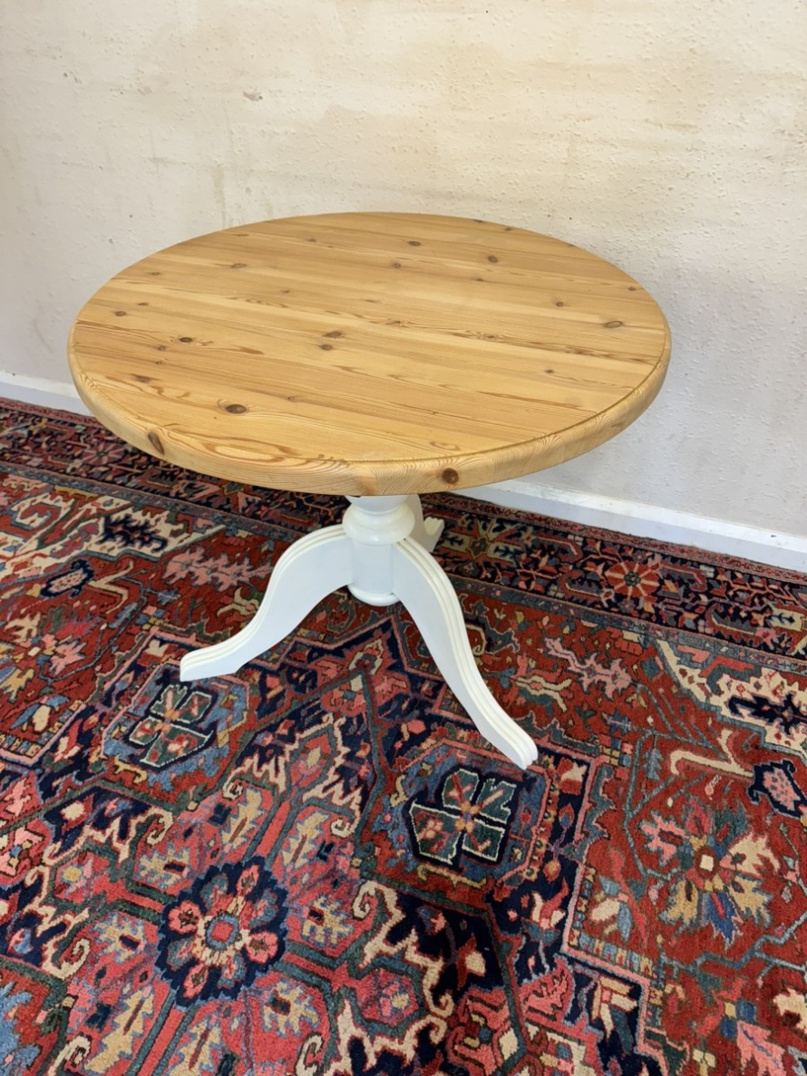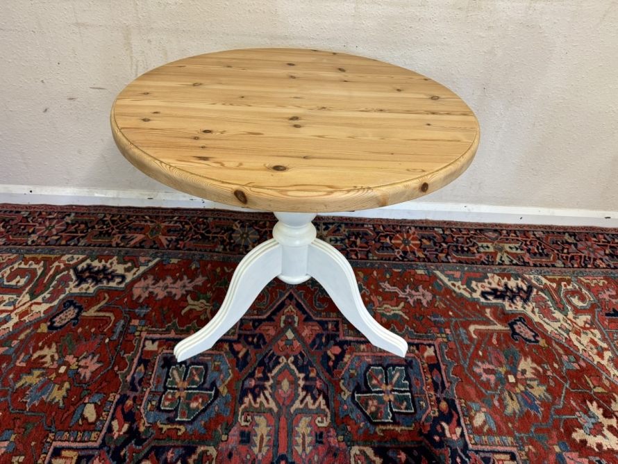 This neat sized round table is in excellent condition. The stripped pine top sits on a painted tripod base with out swept legs.