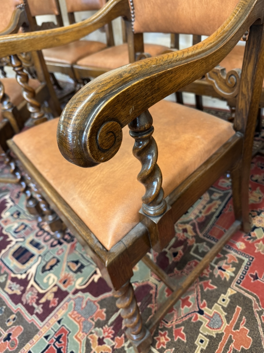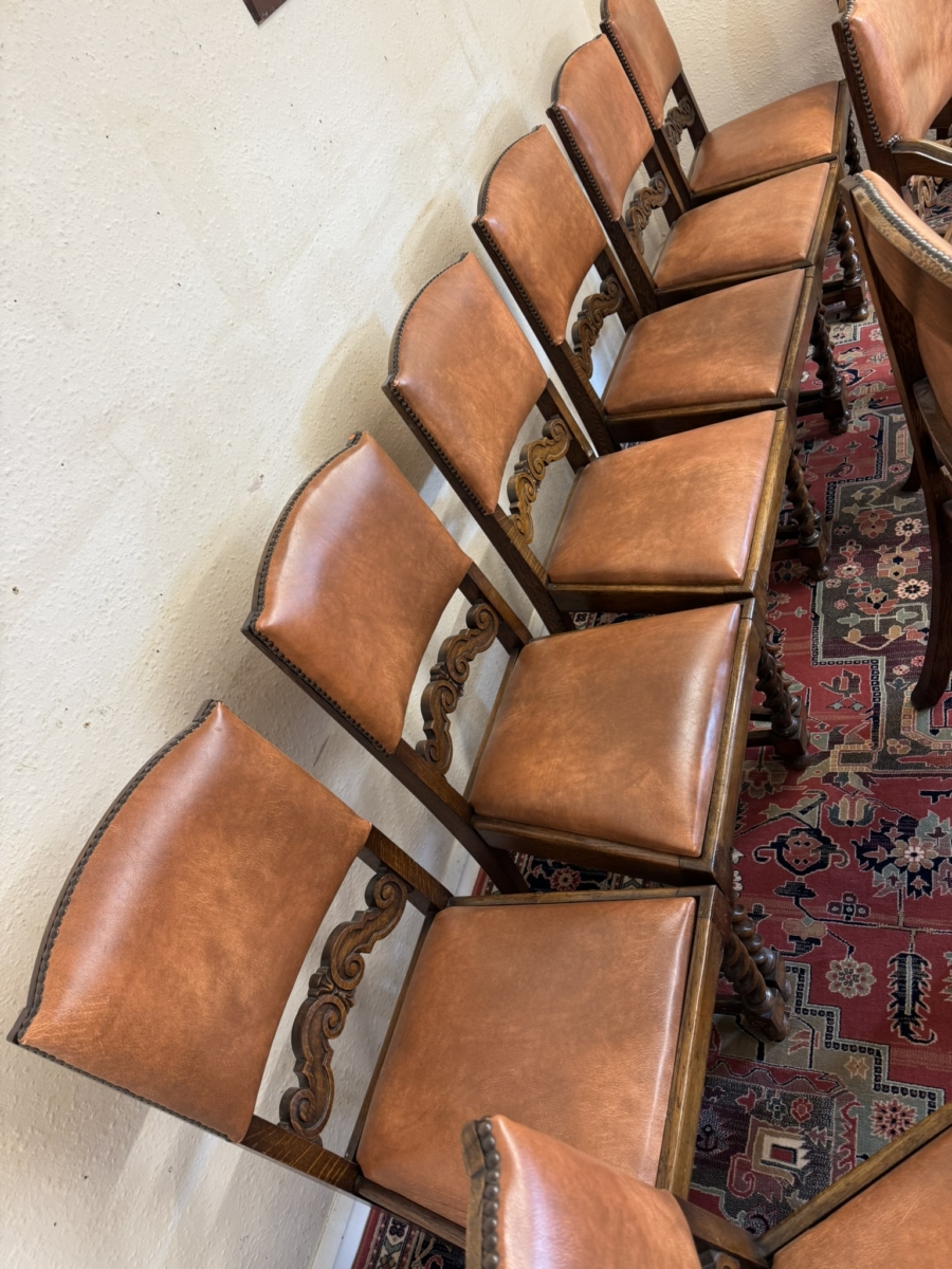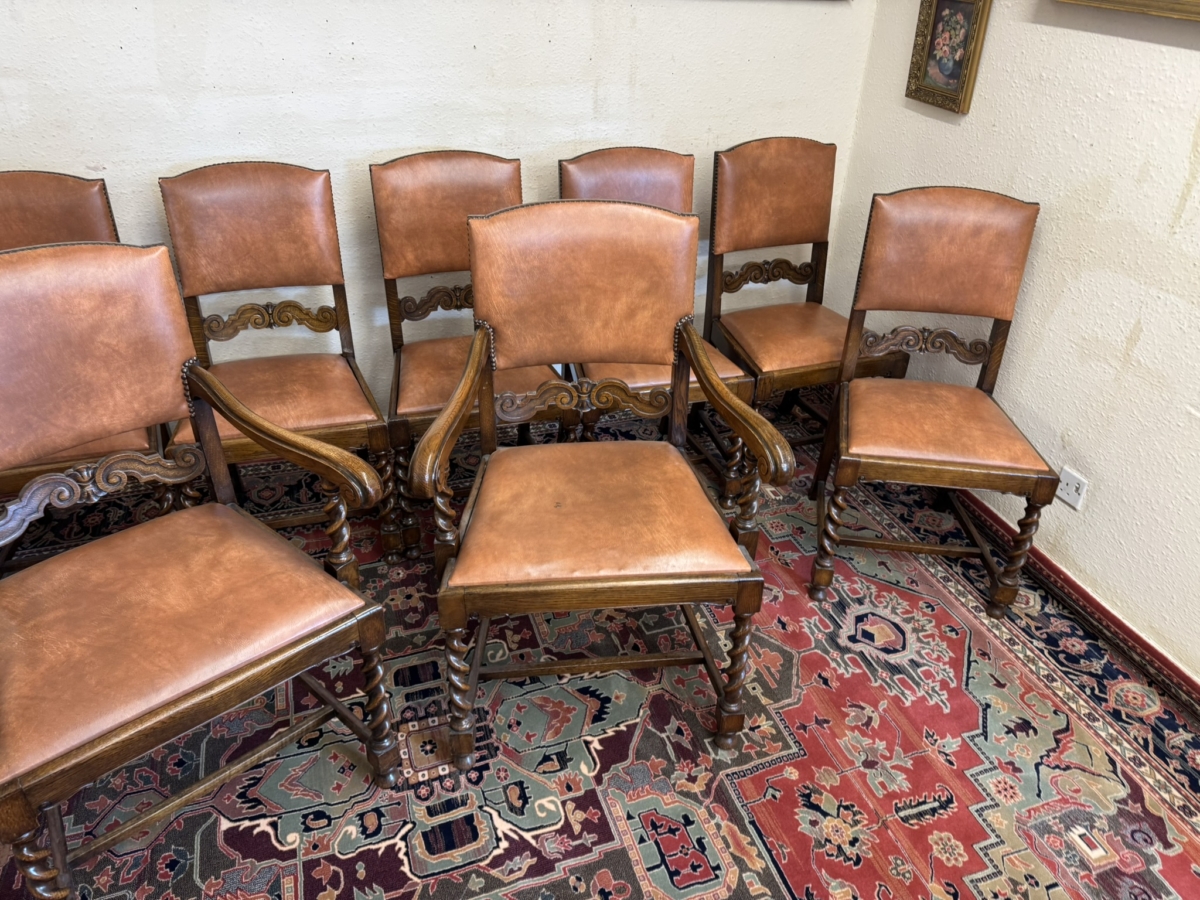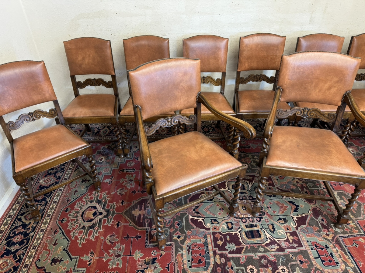 This is a rare set of ten chairs which date circa 1920 and are in excellent condition. The set consists of two armchairs and eight single chairs. Each chair is upholstered in a caramel coloured leather. Cushioned removable seat pad and back, carved shaped splat, barley twist legs to the front, stretcher supports and standing on turned feet to the front. Each of the armchairs having scroll arms with barley twist support.