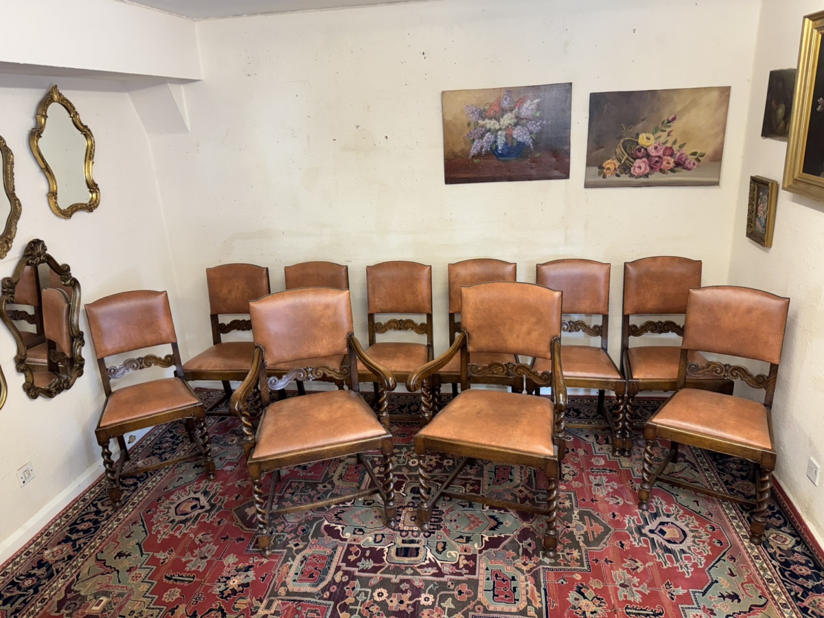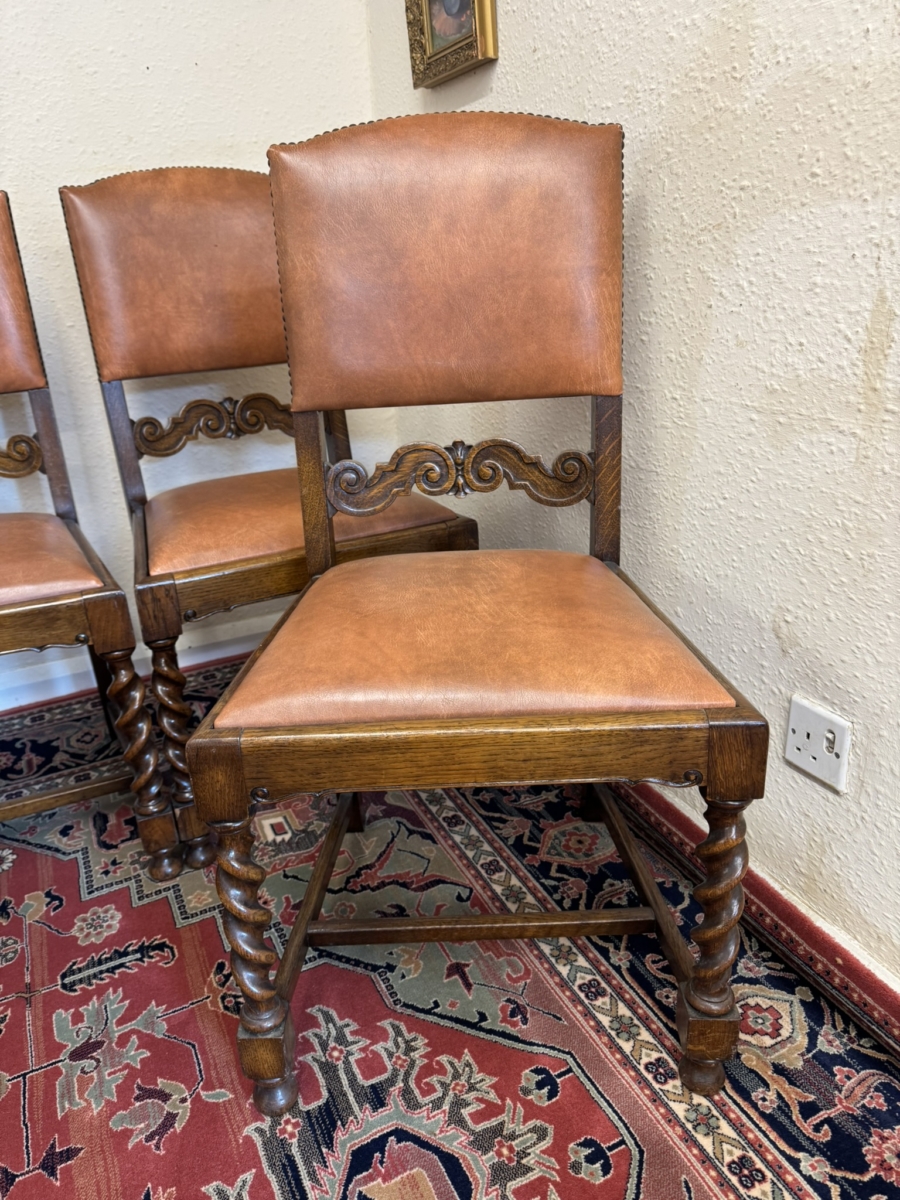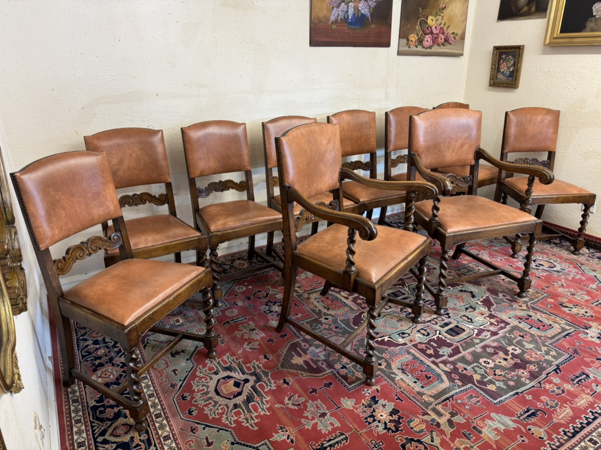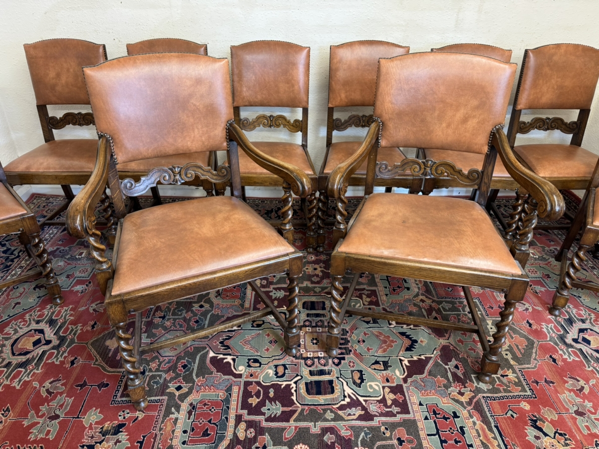 This is a rare set of ten chairs which date circa 1920 and are in excellent condition. The set consists of two armchairs and eight single chairs. Each chair is upholstered in a caramel coloured leather. Cushioned removable seat pad and back, carved shaped splat, barley twist legs to the front, stretcher supports and standing on turned feet to the front. Each of the armchairs having scroll arms with barley twist support.