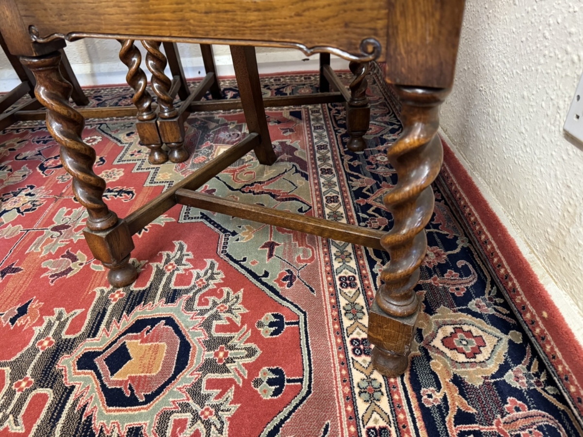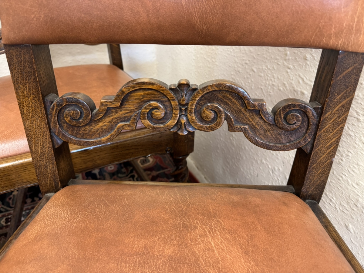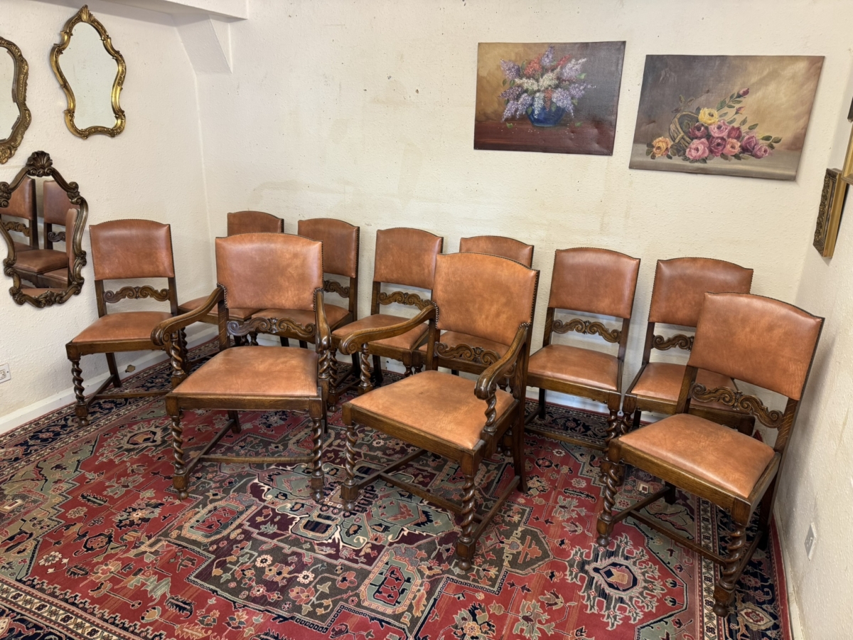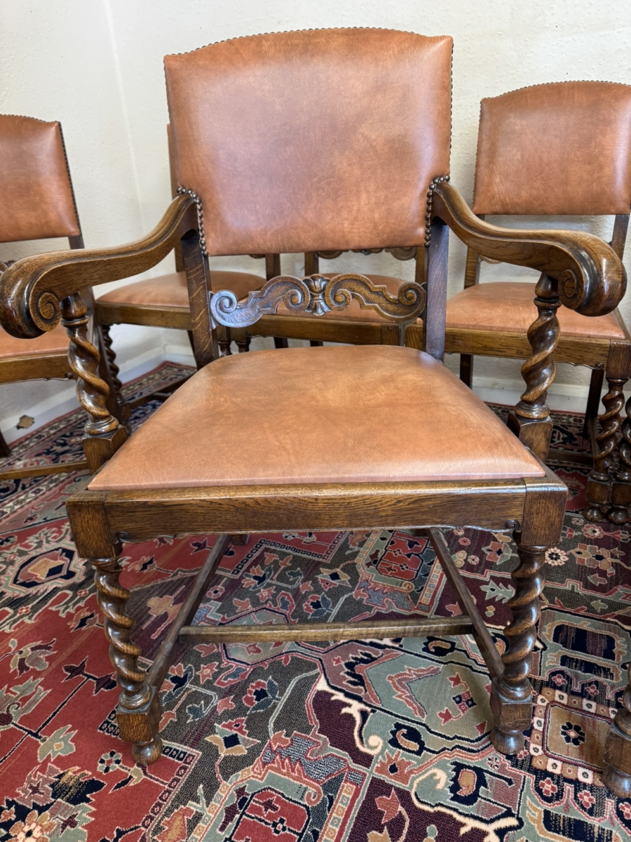 This is a rare set of ten chairs which date circa 1920 and are in excellent condition. The set consists of two armchairs and eight single chairs. Each chair is upholstered in a caramel coloured leather. Cushioned removable seat pad and back, carved shaped splat, barley twist legs to the front, stretcher supports and standing on turned feet to the front. Each of the armchairs having scroll arms with barley twist support.