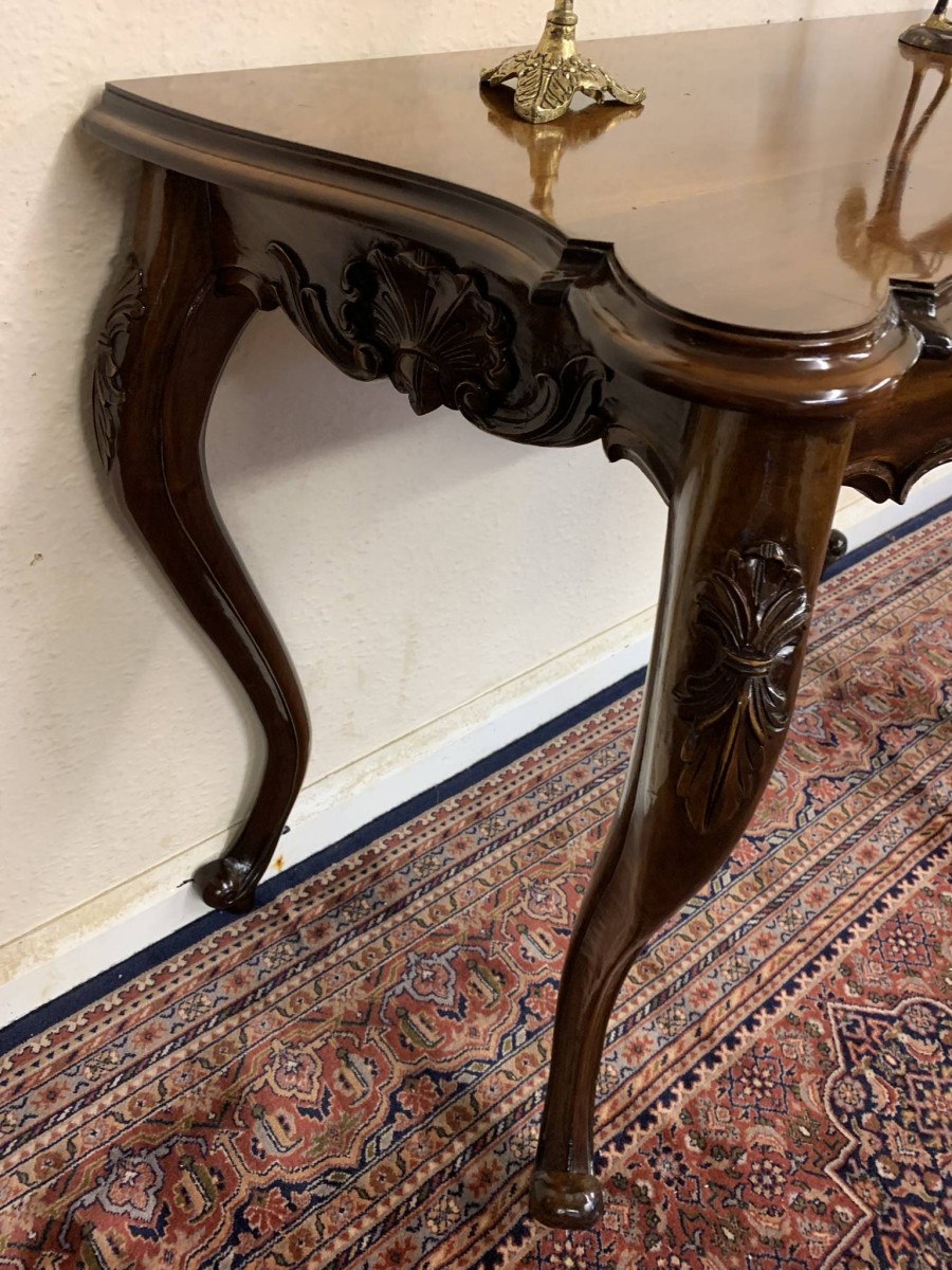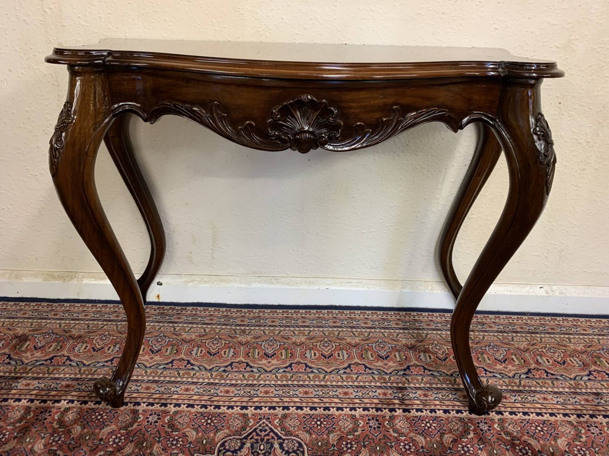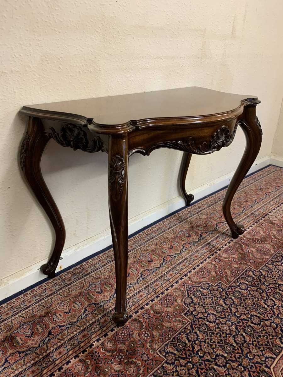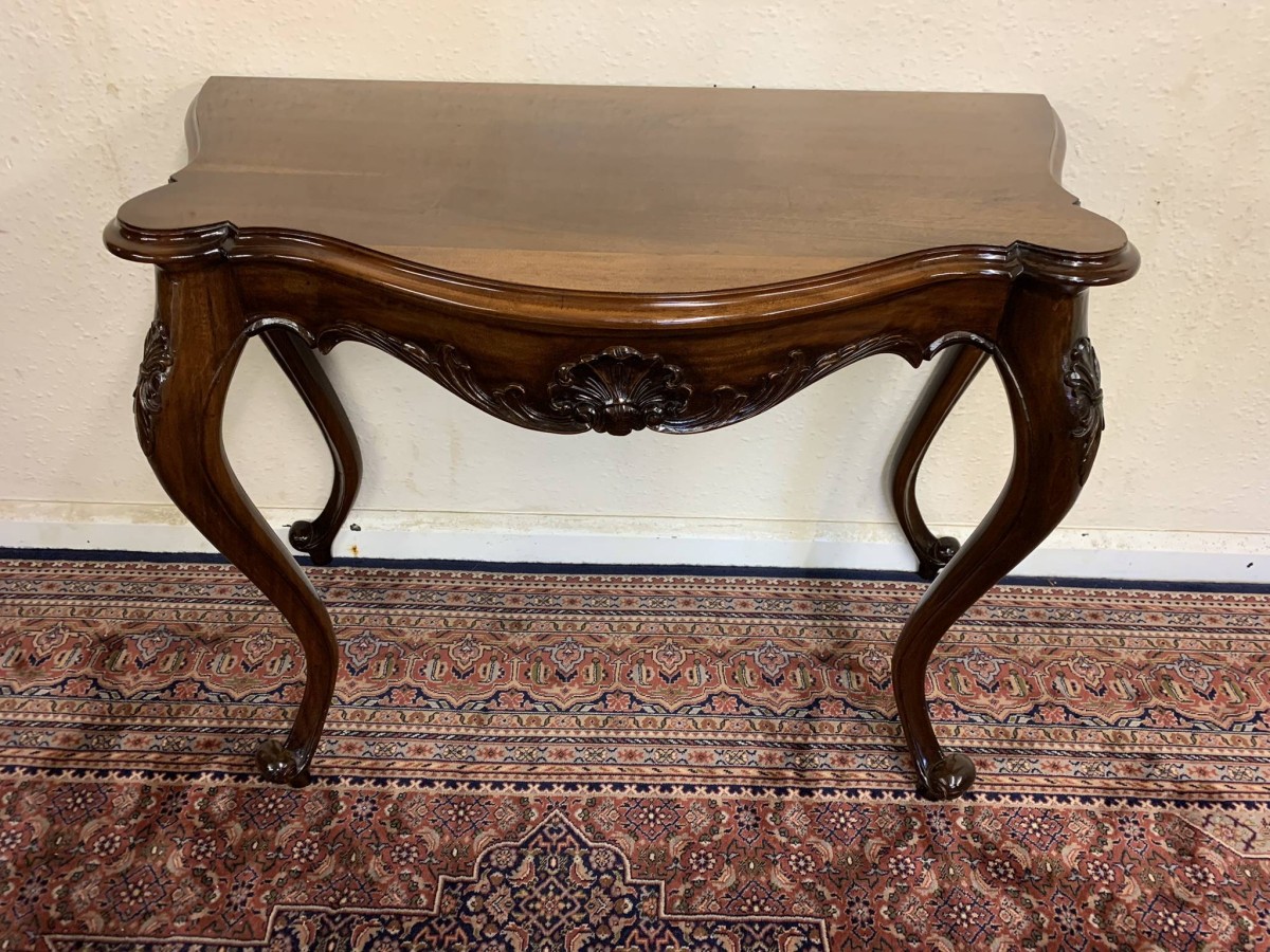 The shaped table top has a shaped carved frieze below. This attractive console table stands on four carved cabriole shaped legs.