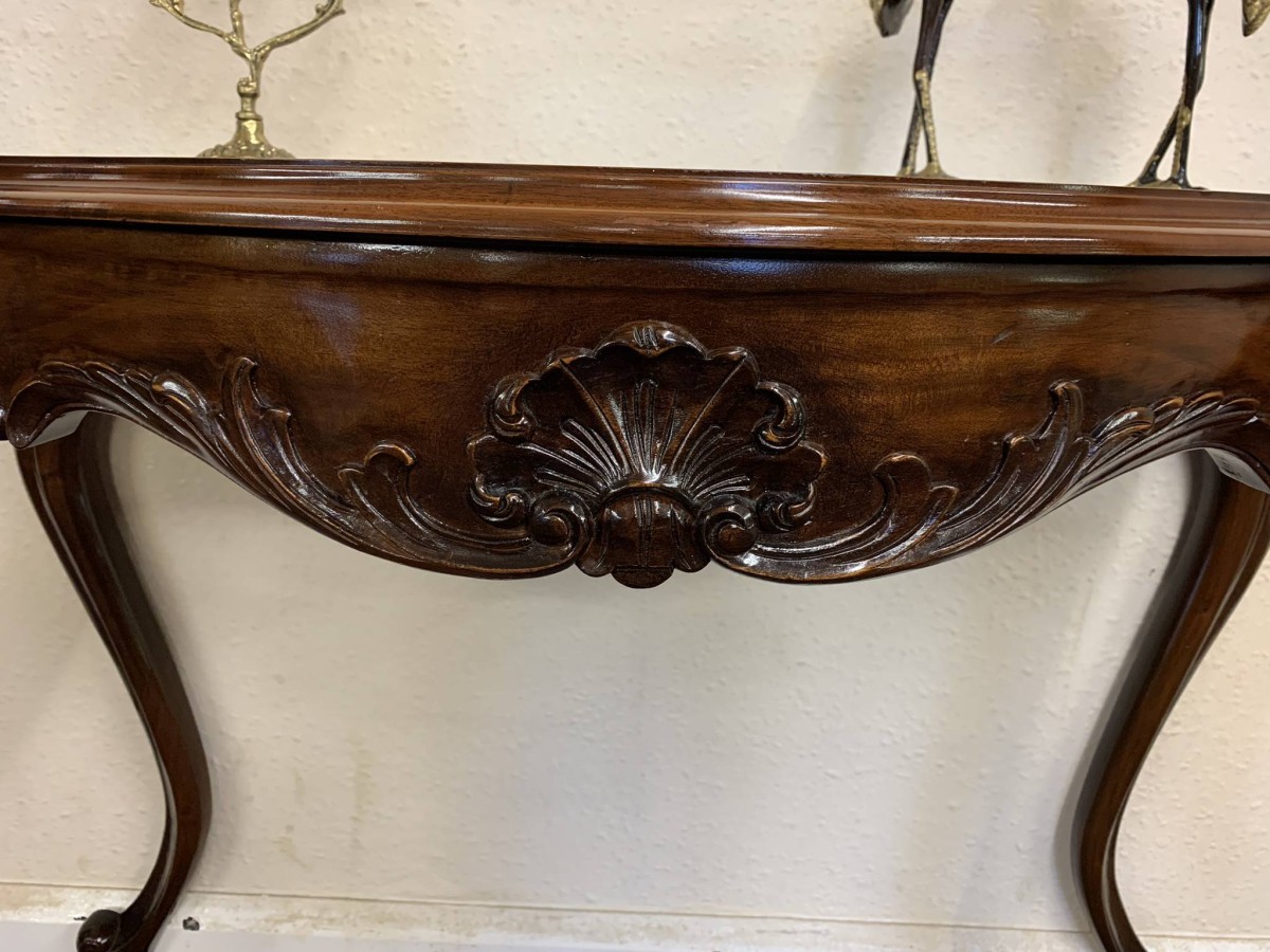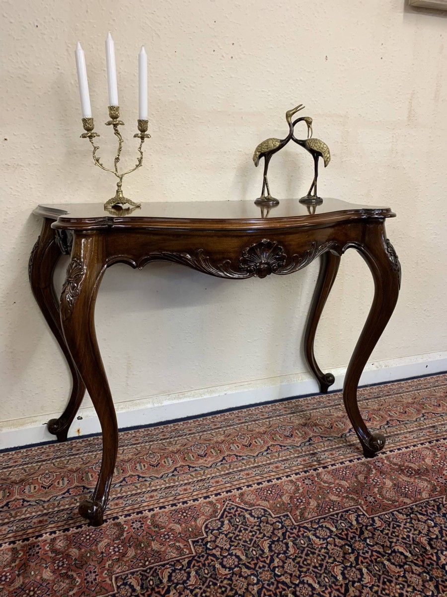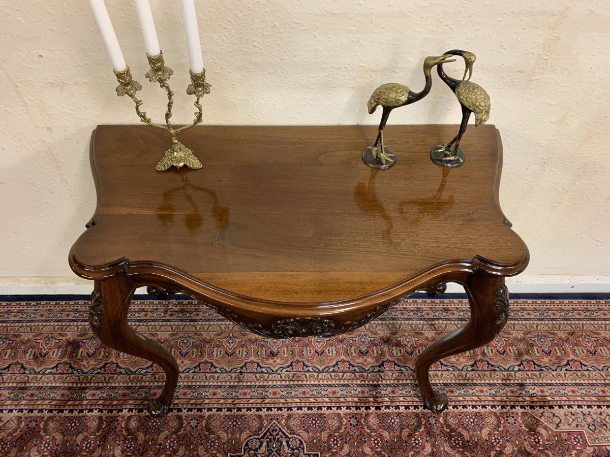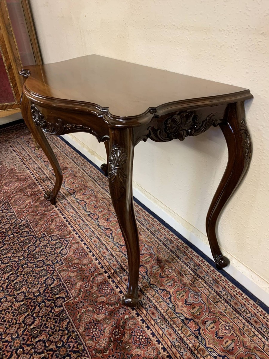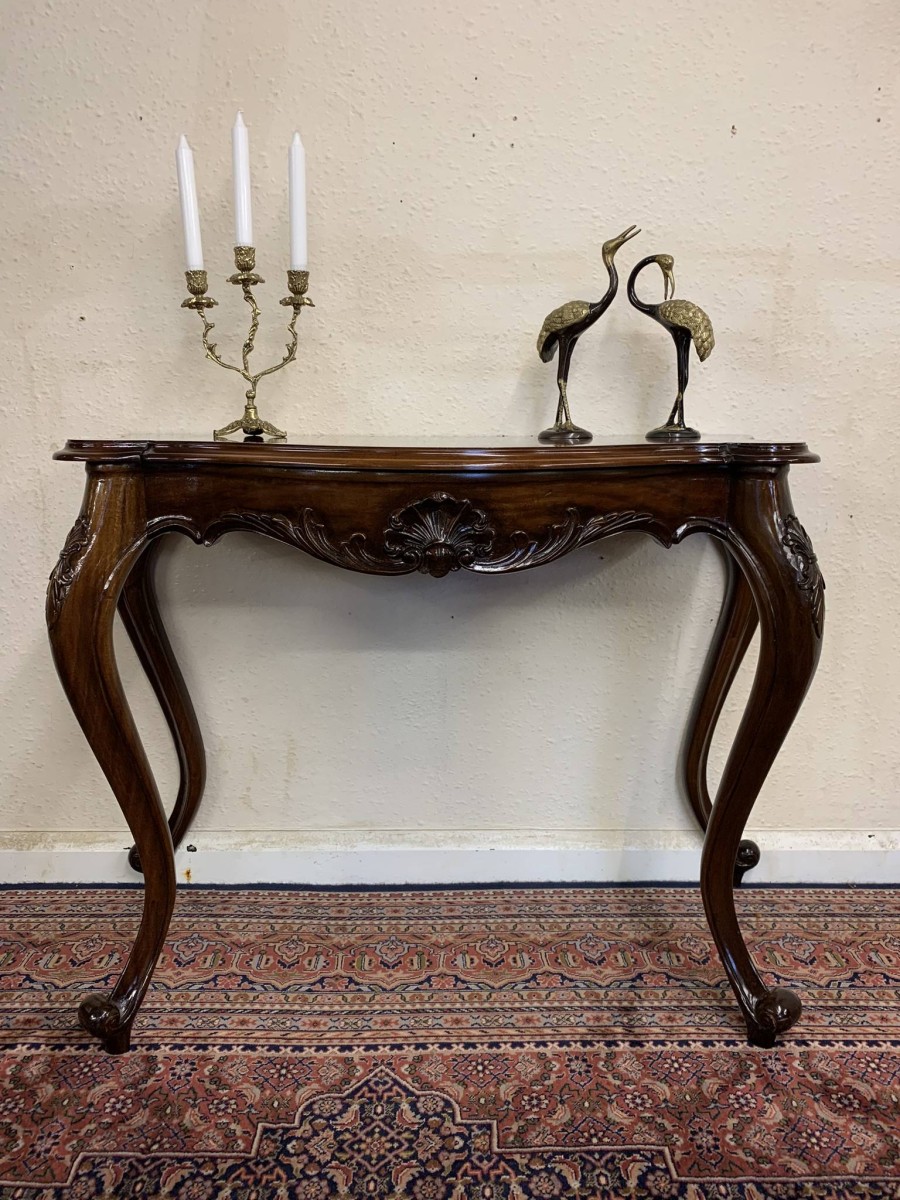 The shaped table top has a shaped carved frieze below. This attractive console table stands on four carved cabriole shaped legs.