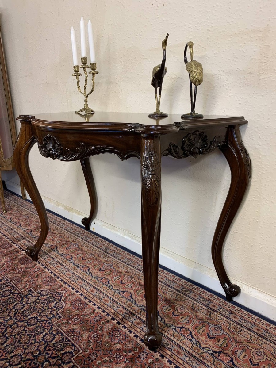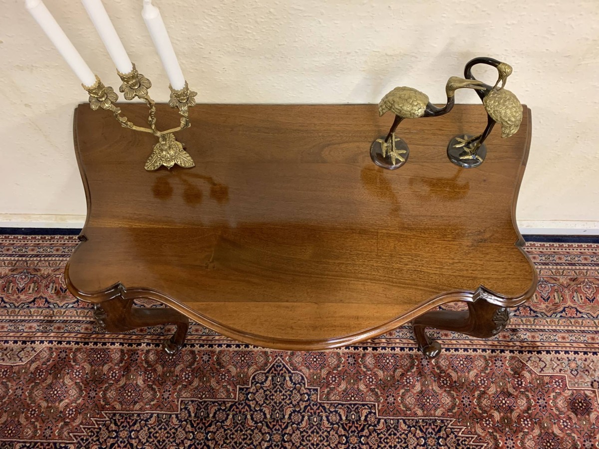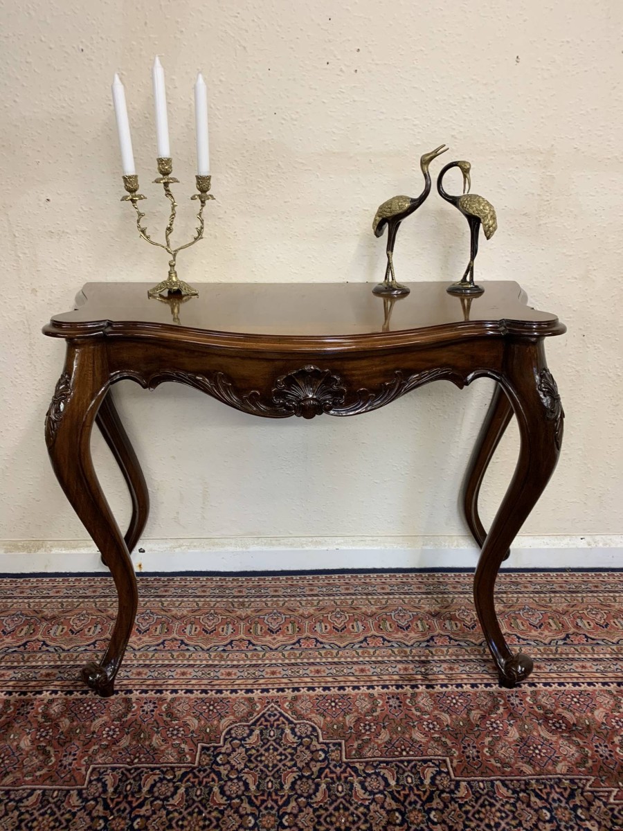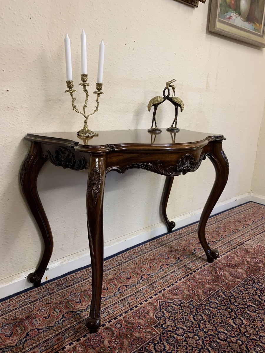 The shaped table top has a shaped carved frieze below. This attractive console table stands on four carved cabriole shaped legs.