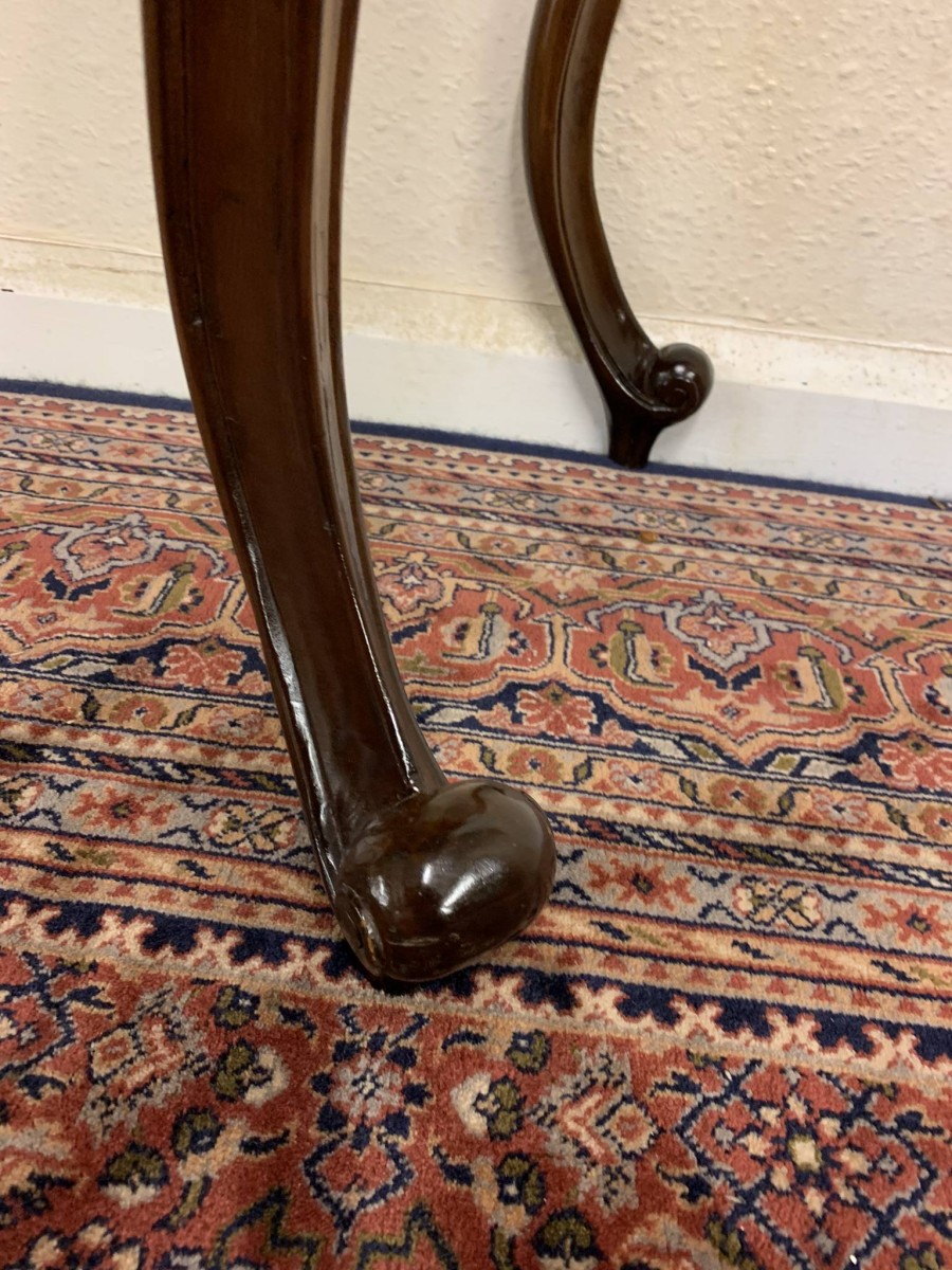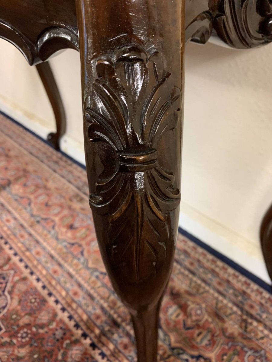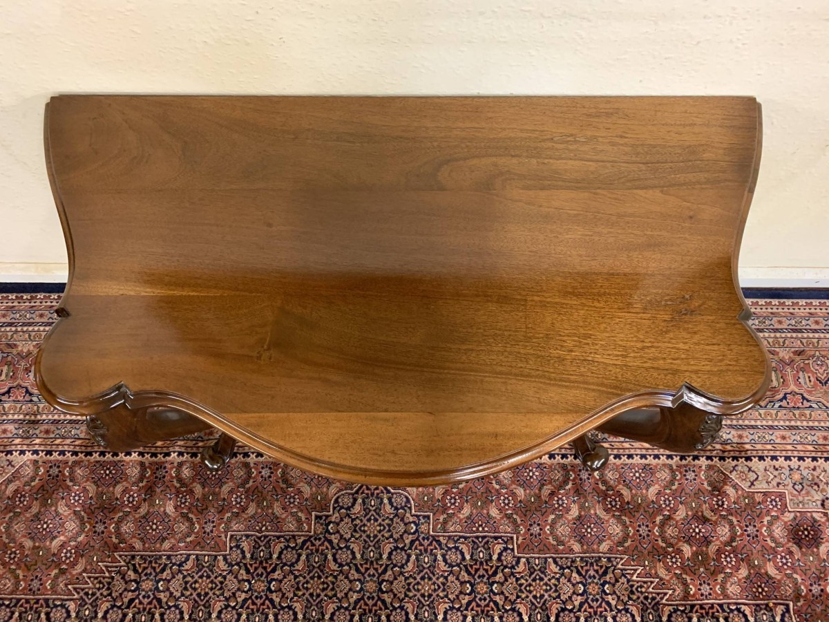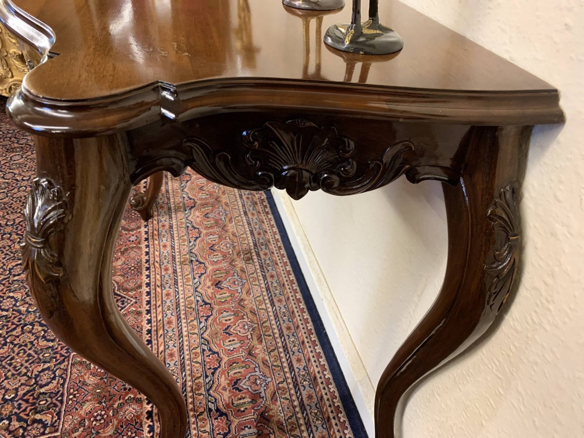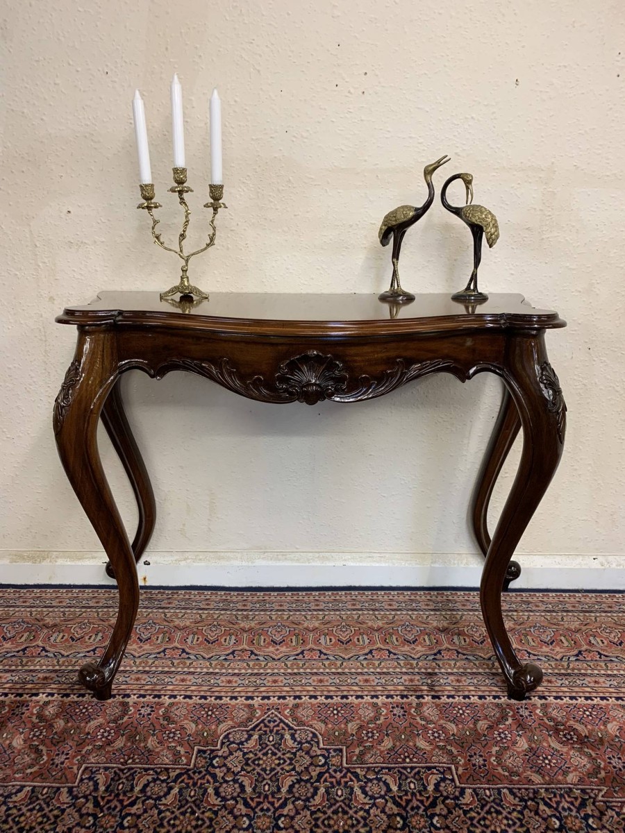 The shaped table top has a shaped carved frieze below. This attractive console table stands on four carved cabriole shaped legs.