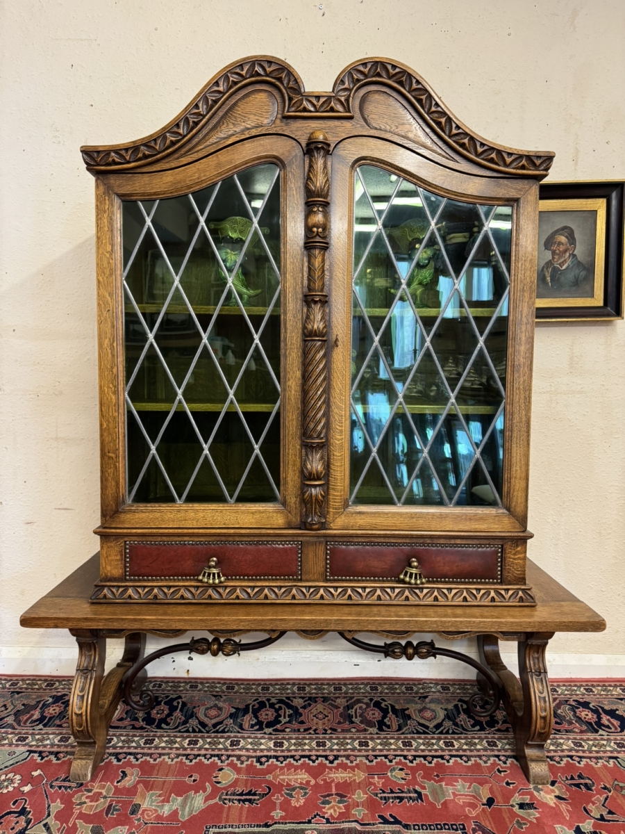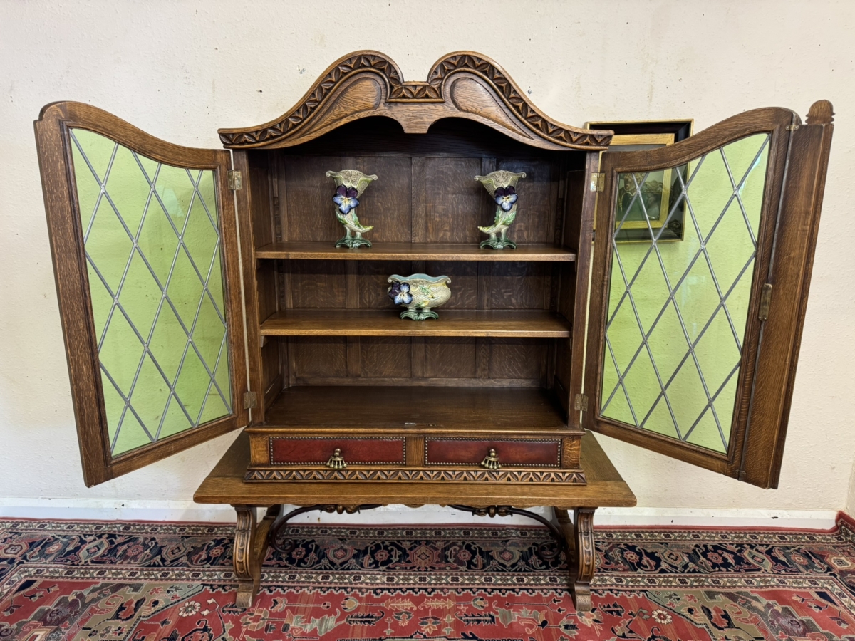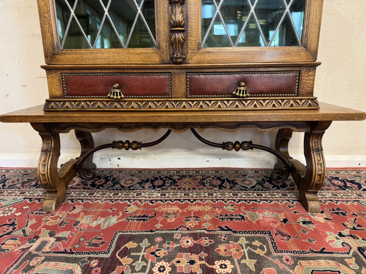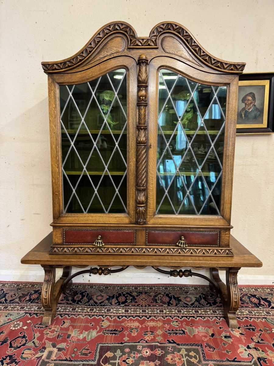 This super original Spanish glazed cabinet dates circa 1950. Shaped carved top sits above a pair of green glass lockable doors, the doors have a central carved column between them. The doors open to reveal two adjustable removable shelves, below are two drawers, the drawers have vibrant red leather fronts asn brass studded decoration with unusual brass handles. Silhouette carved bass with ornate curved metal stretcher supports.