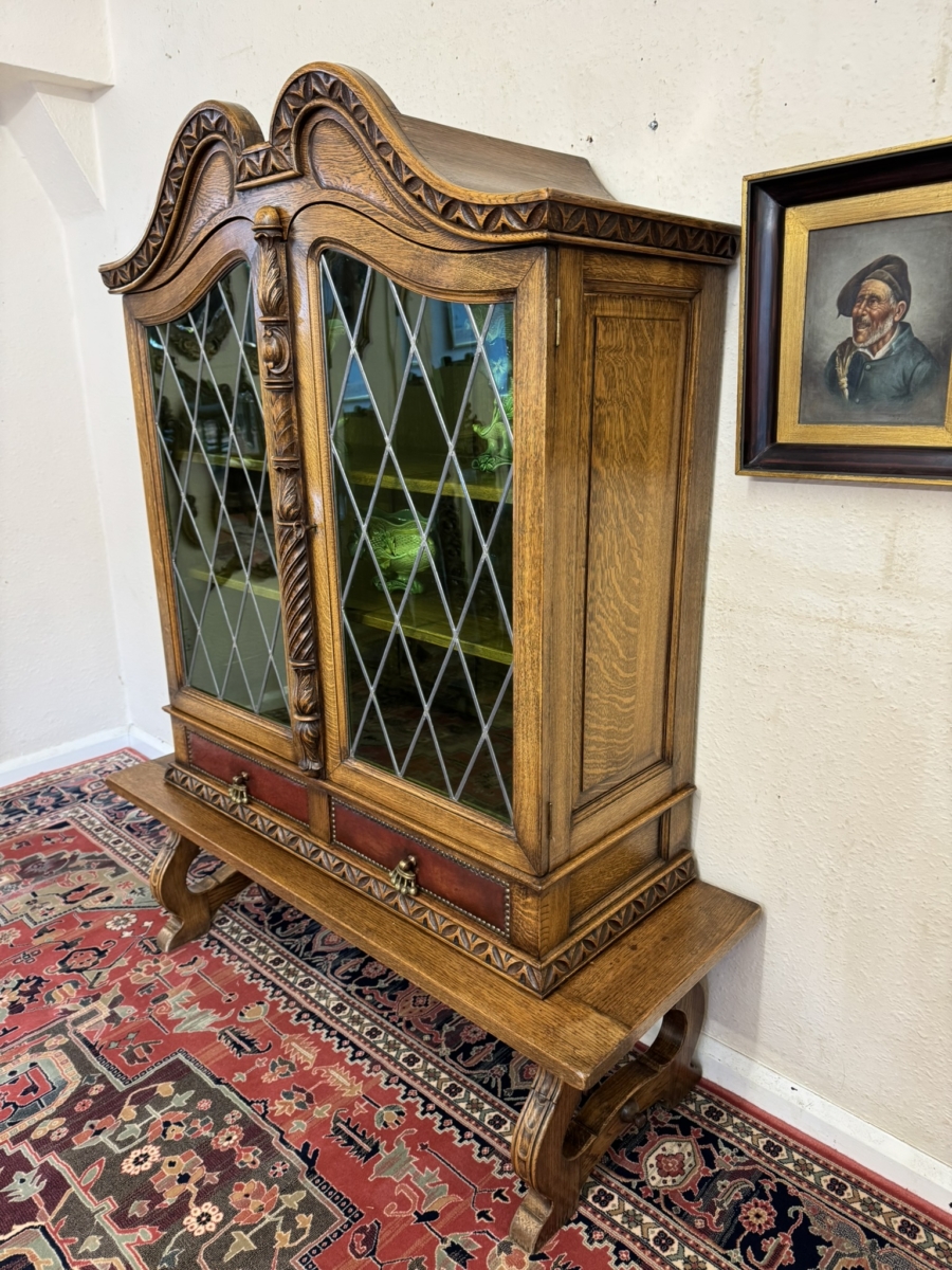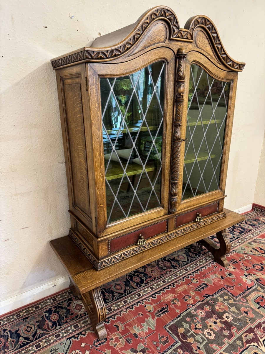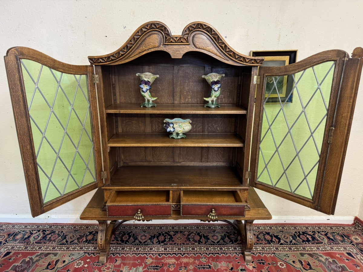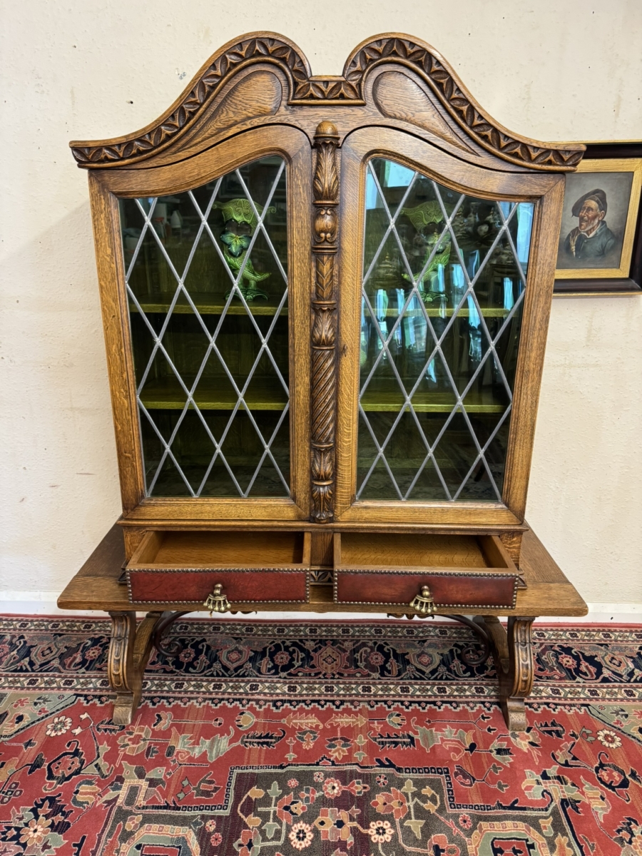 This super original Spanish glazed cabinet dates circa 1950. Shaped carved top sits above a pair of green glass lockable doors, the doors have a central carved column between them. The doors open to reveal two adjustable removable shelves, below are two drawers, the drawers have vibrant red leather fronts asn brass studded decoration with unusual brass handles. Silhouette carved bass with ornate curved metal stretcher supports.