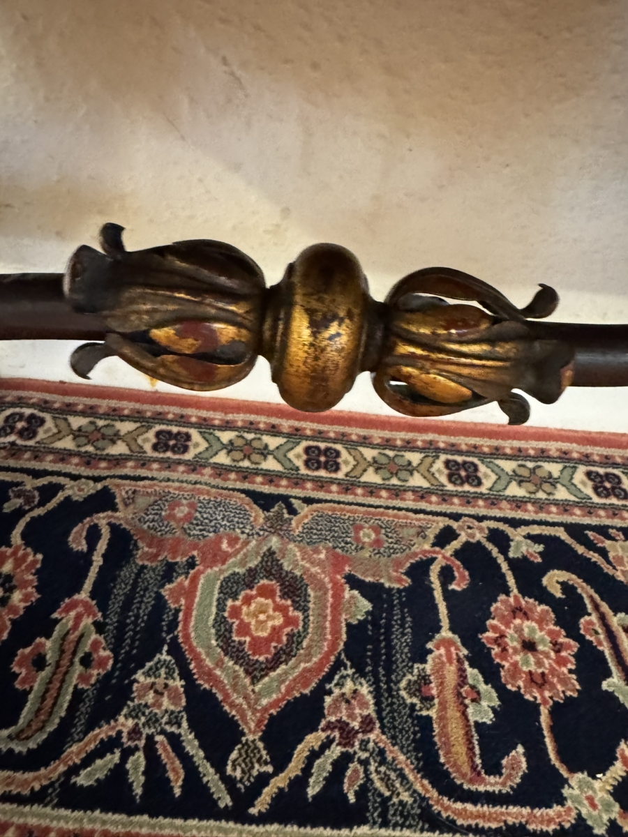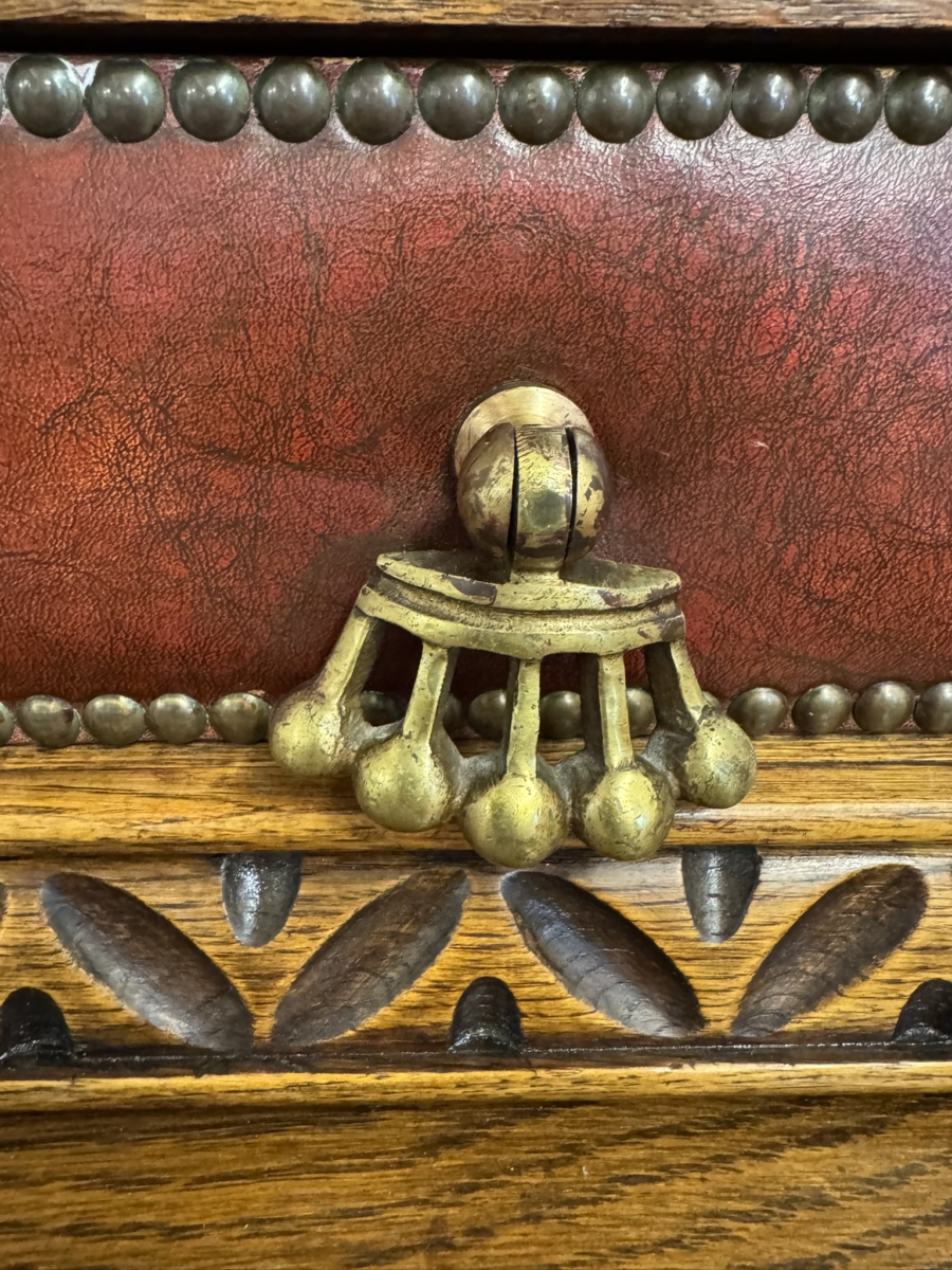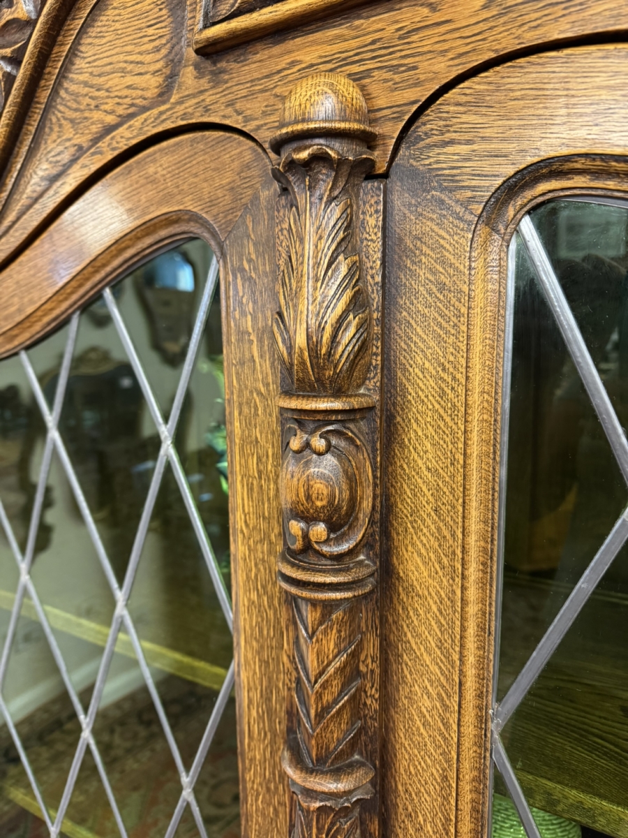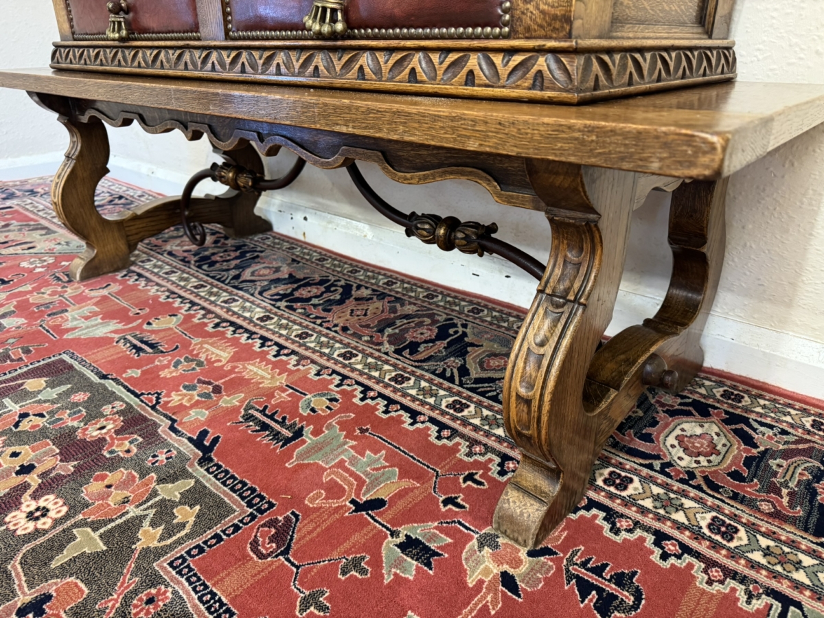 This super original Spanish glazed cabinet dates circa 1950. Shaped carved top sits above a pair of green glass lockable doors, the doors have a central carved column between them. The doors open to reveal two adjustable removable shelves, below are two drawers, the drawers have vibrant red leather fronts asn brass studded decoration with unusual brass handles. Silhouette carved bass with ornate curved metal stretcher supports.