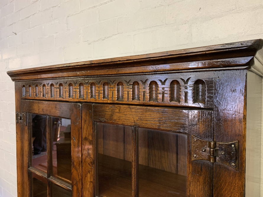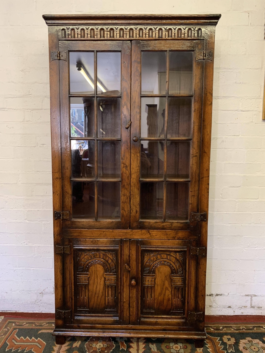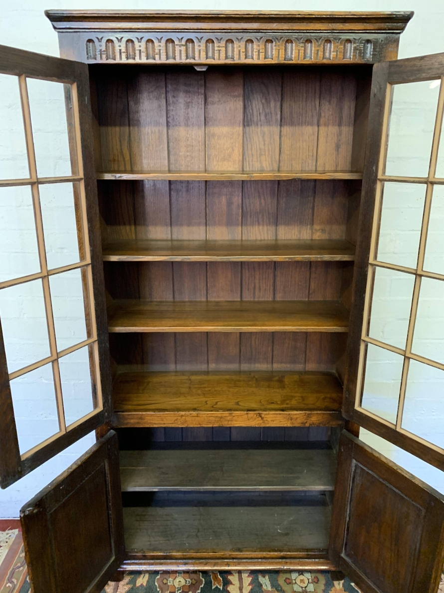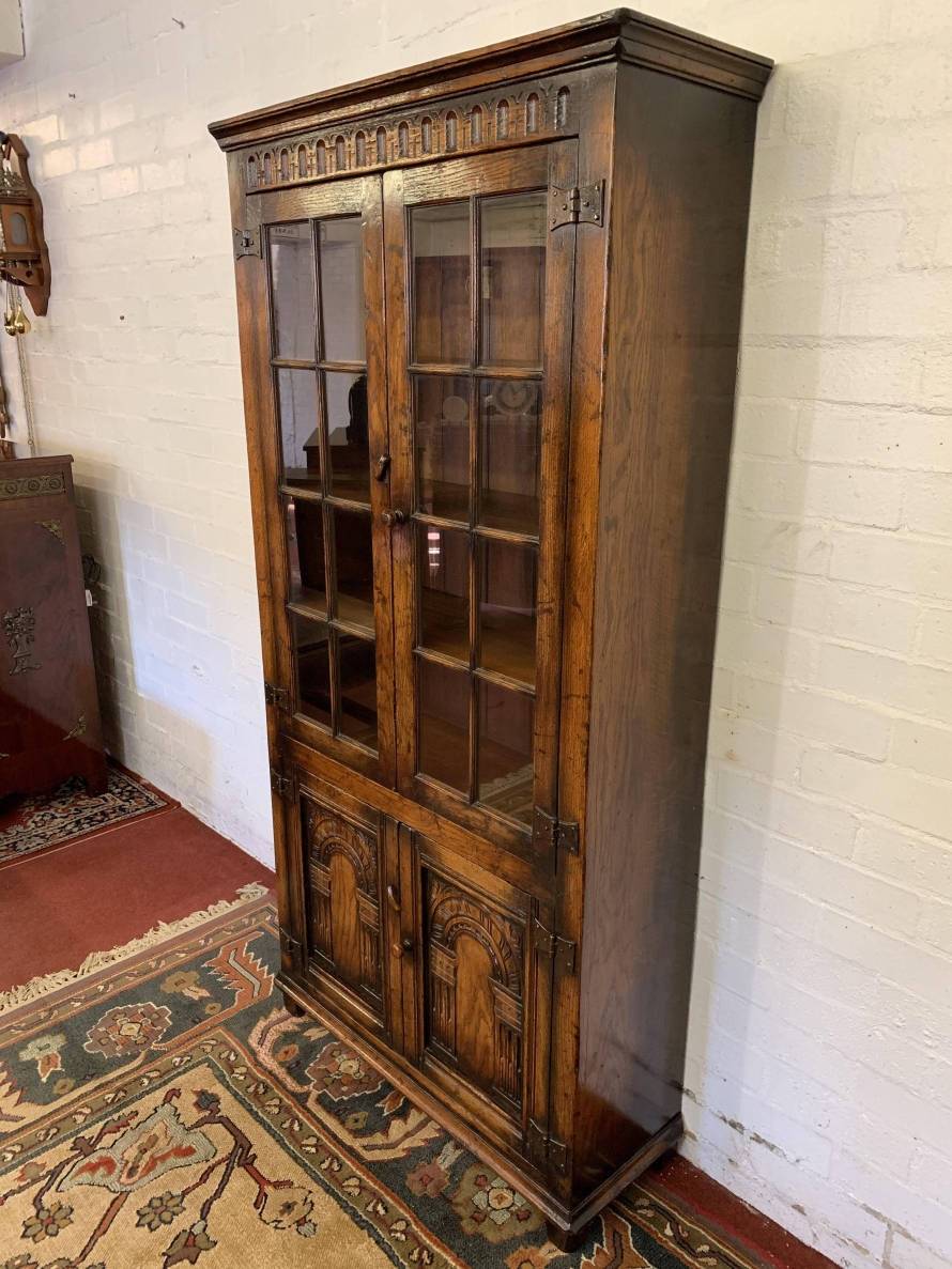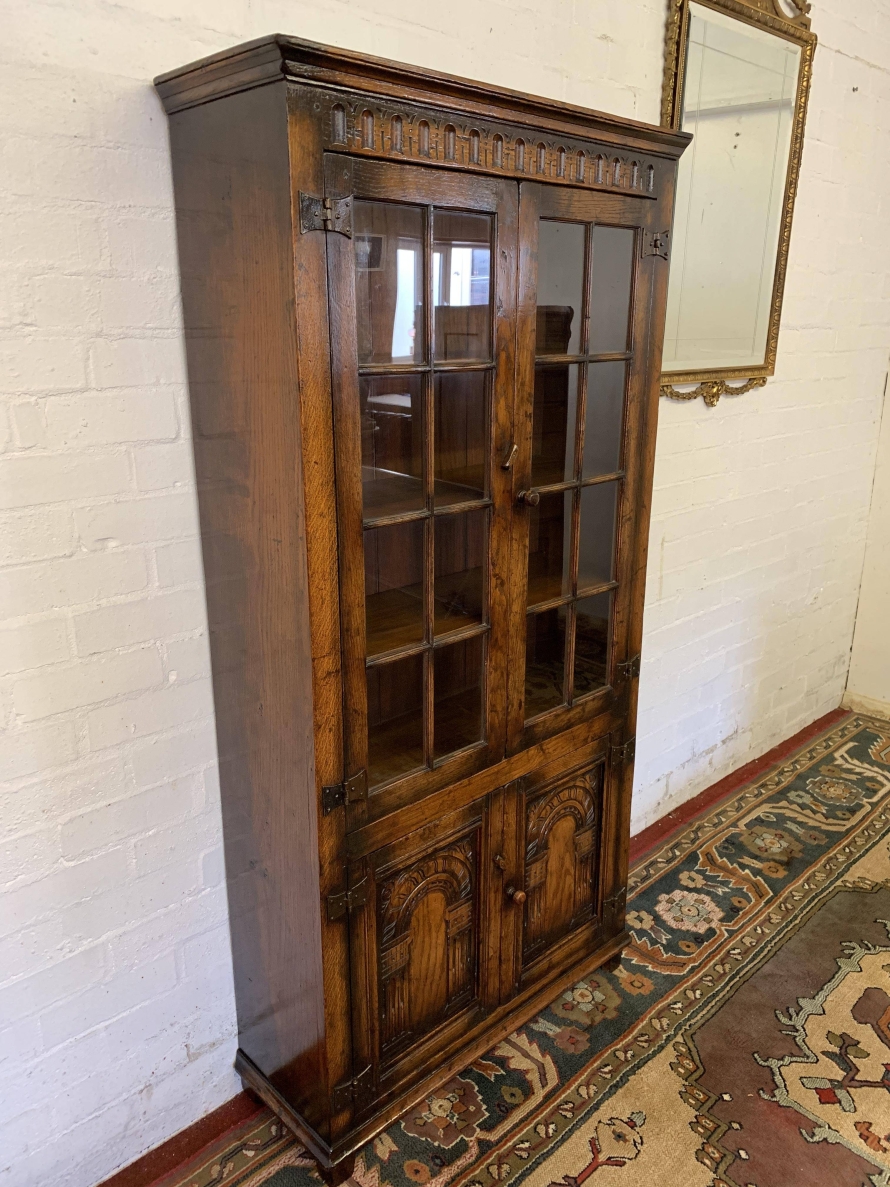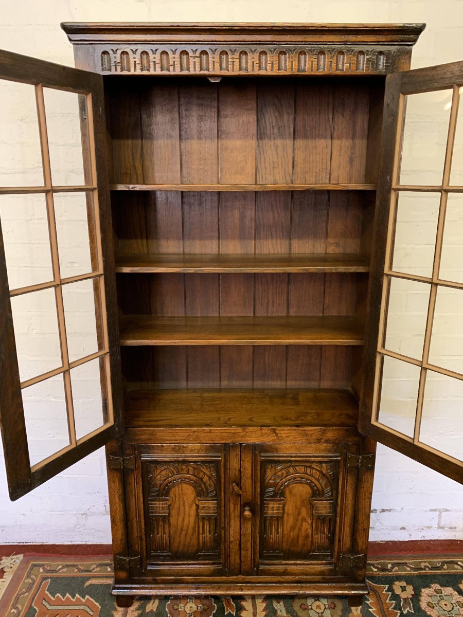 We are delighted to offer this outstanding quality oak bookcase produced by the renowned furniture company Titchmarsh & Goodwin. The over sailing top has decorative carving below. A pair of glazed doors with turned knob handle and locking latch , the doors open to reveal three removable shelves. Below are a pair of carved cupboard doors, the doors open to reveal a removable shelf. All four doors have primitive hinges. The bookcase stands on block feet. A stunning item of furniture which oozes quality.