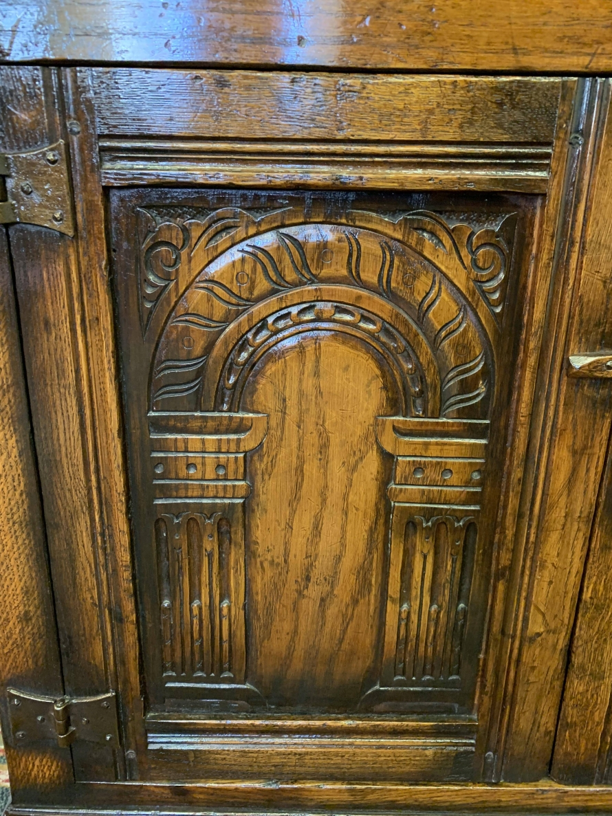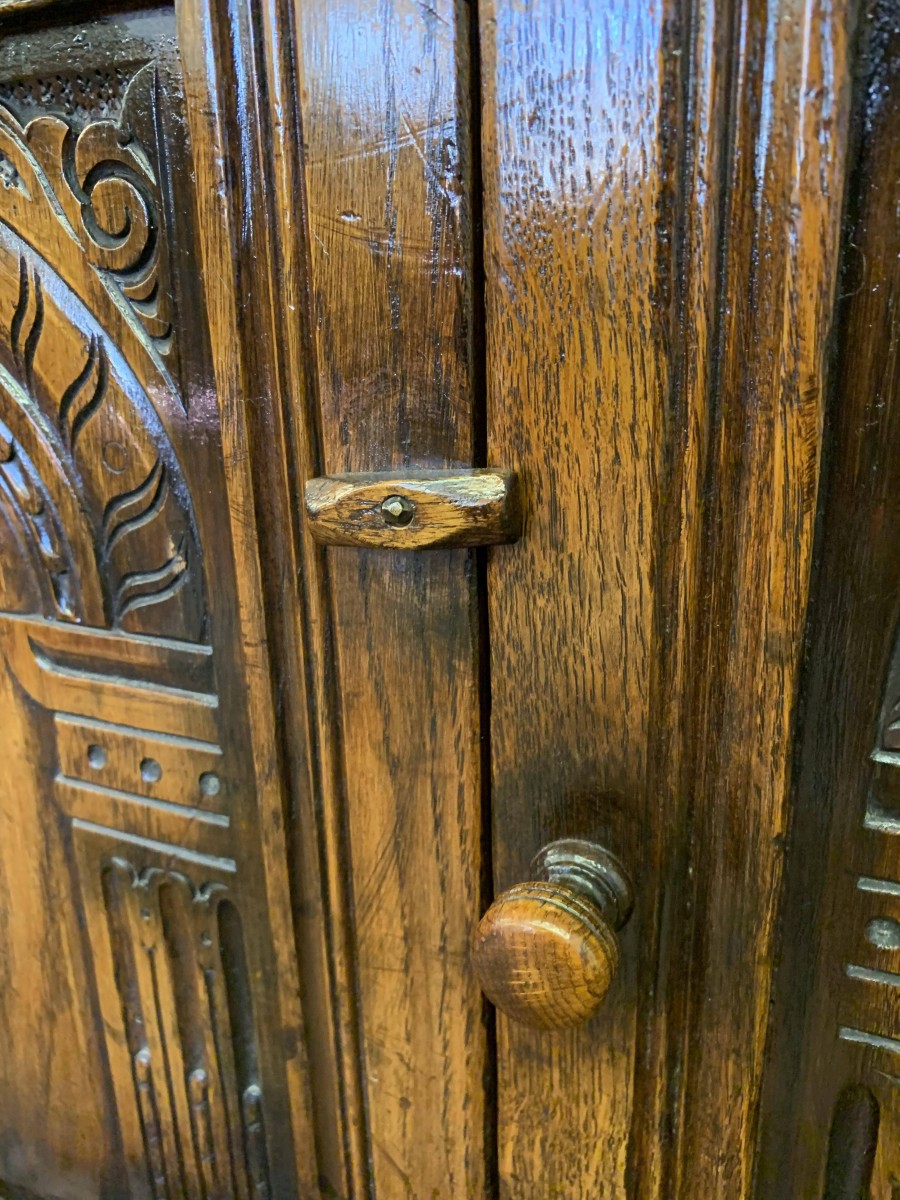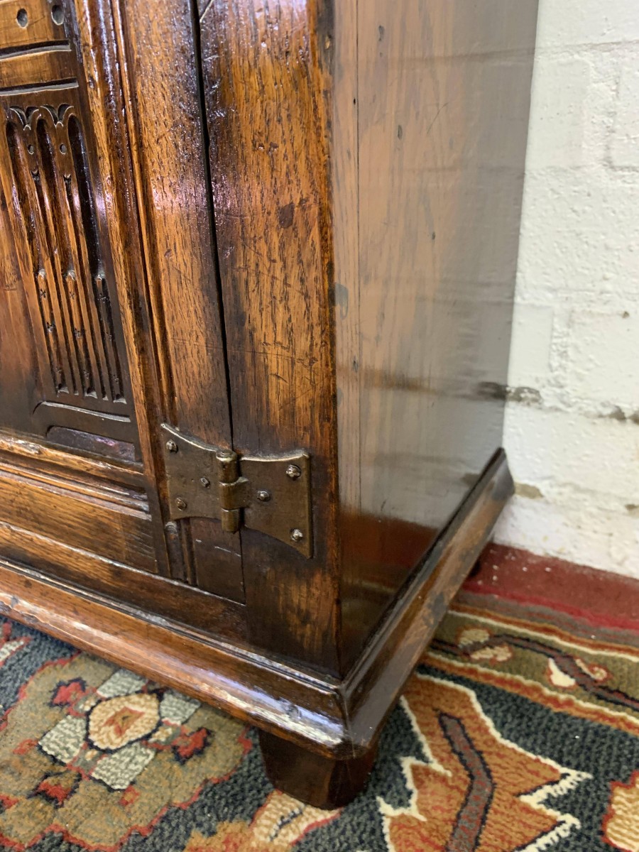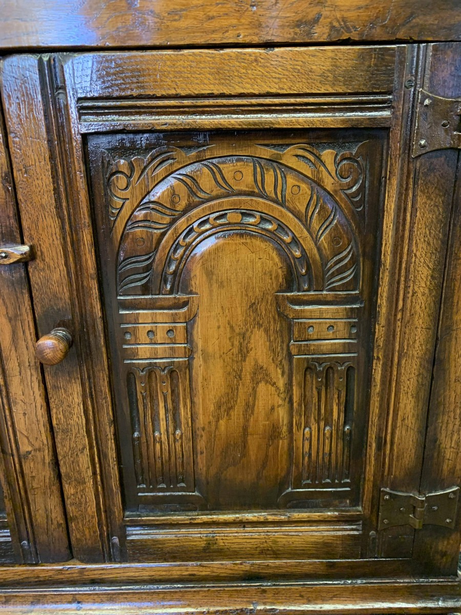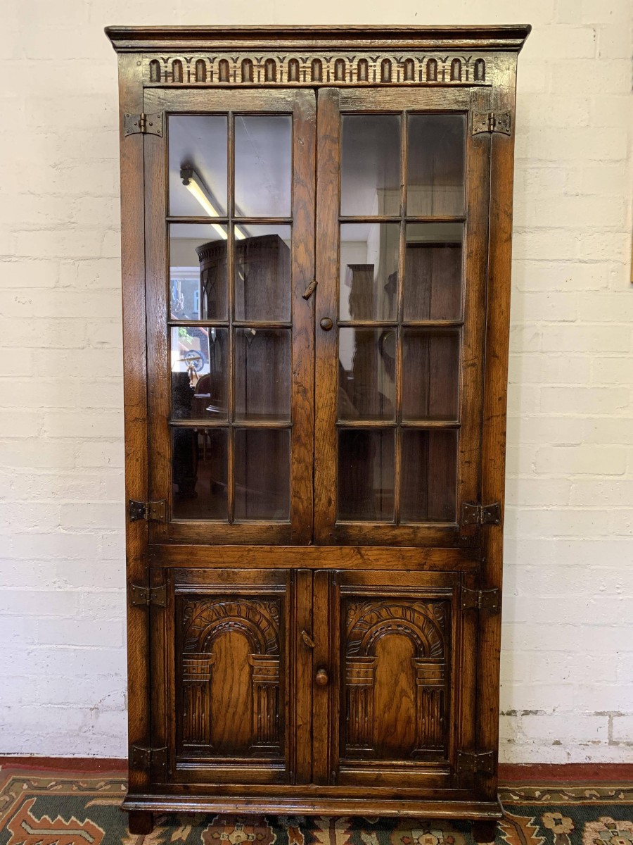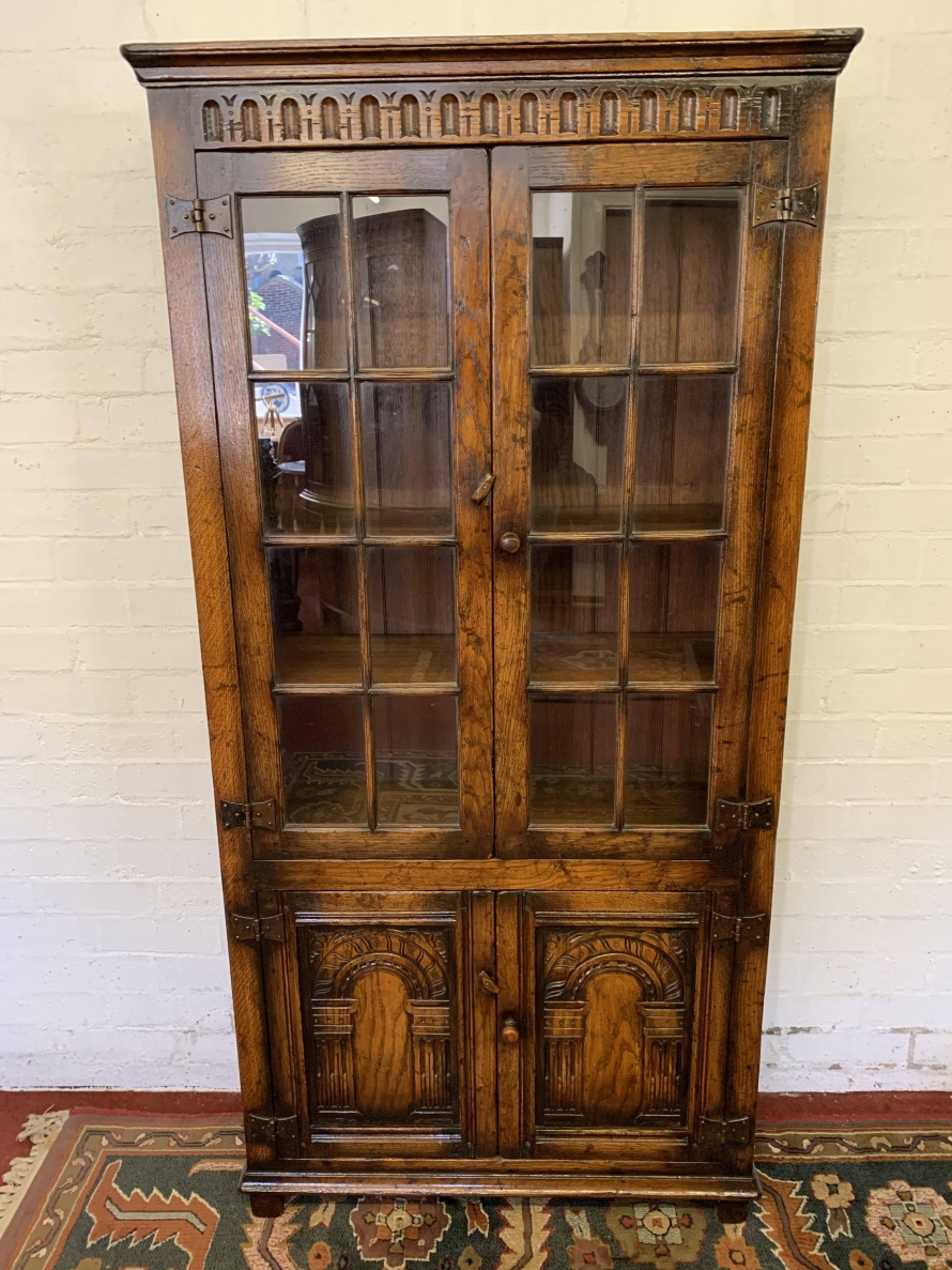 We are delighted to offer this outstanding quality oak bookcase produced by the renowned furniture company Titchmarsh & Goodwin. The over sailing top has decorative carving below. A pair of glazed doors with turned knob handle and locking latch , the doors open to reveal three removable shelves. Below are a pair of carved cupboard doors, the doors open to reveal a removable shelf. All four doors have primitive hinges. The bookcase stands on block feet. A stunning item of furniture which oozes quality.