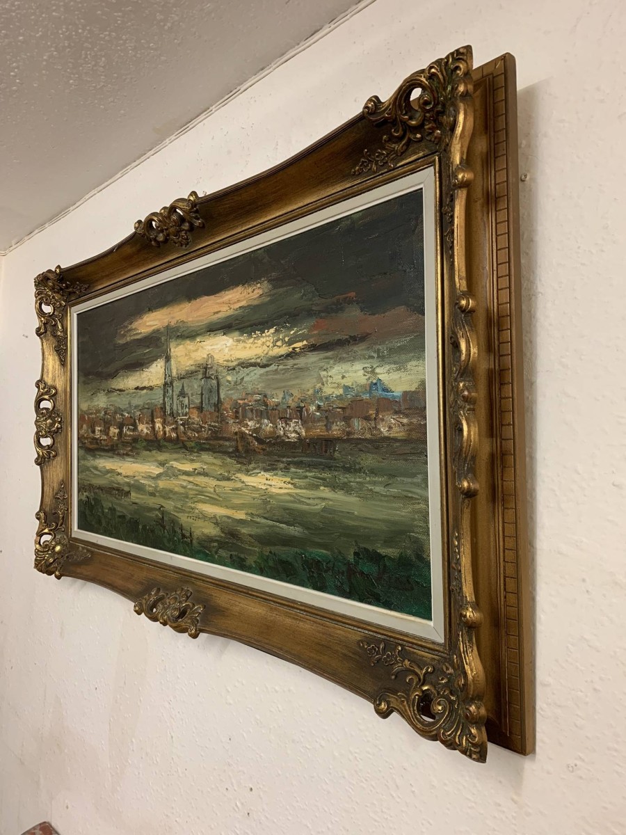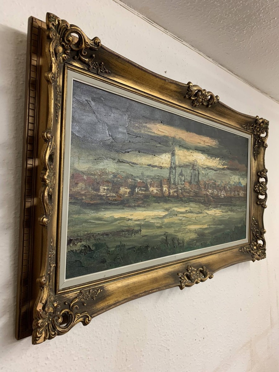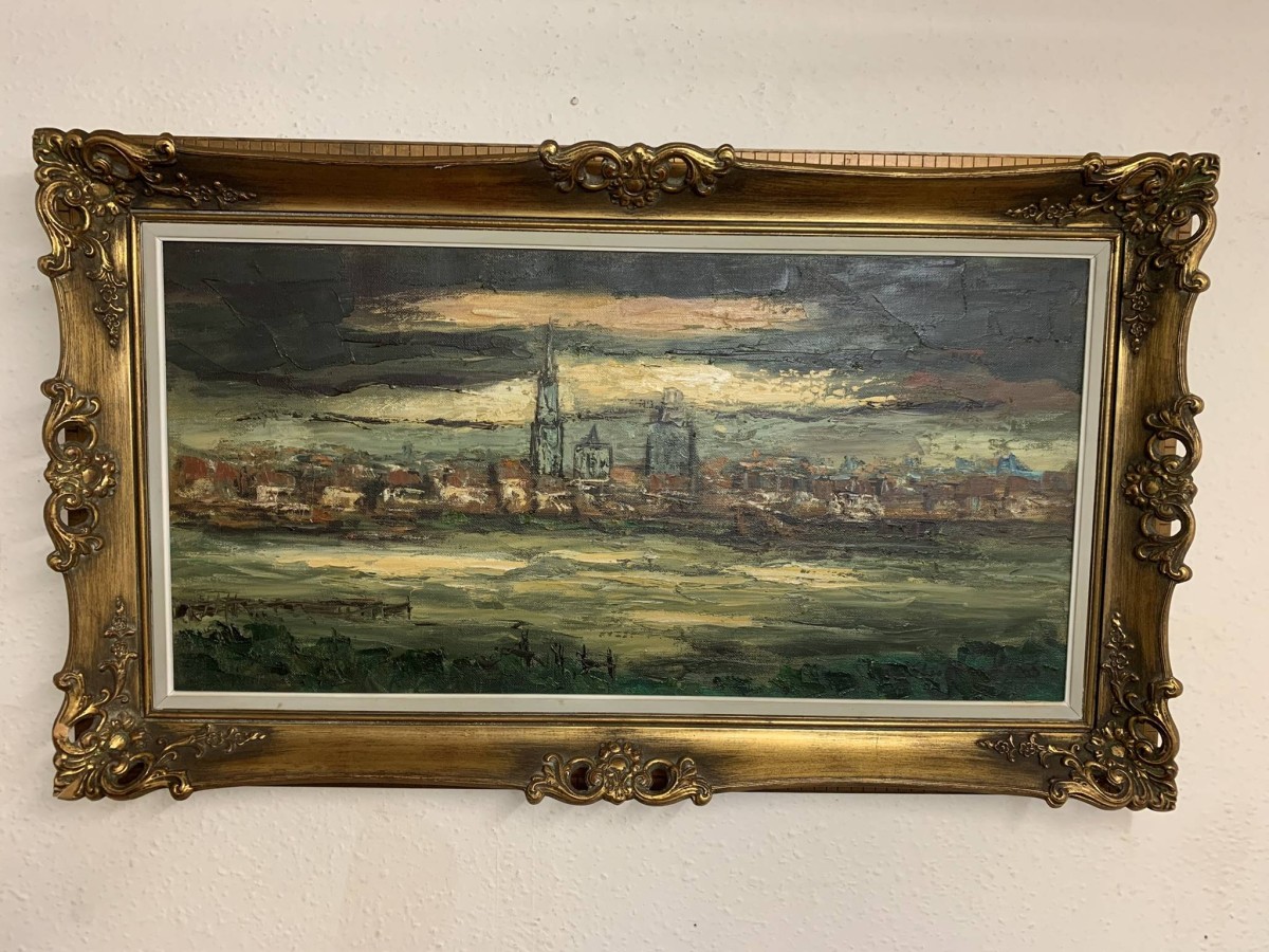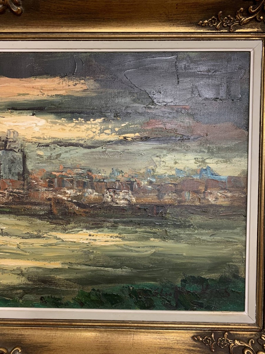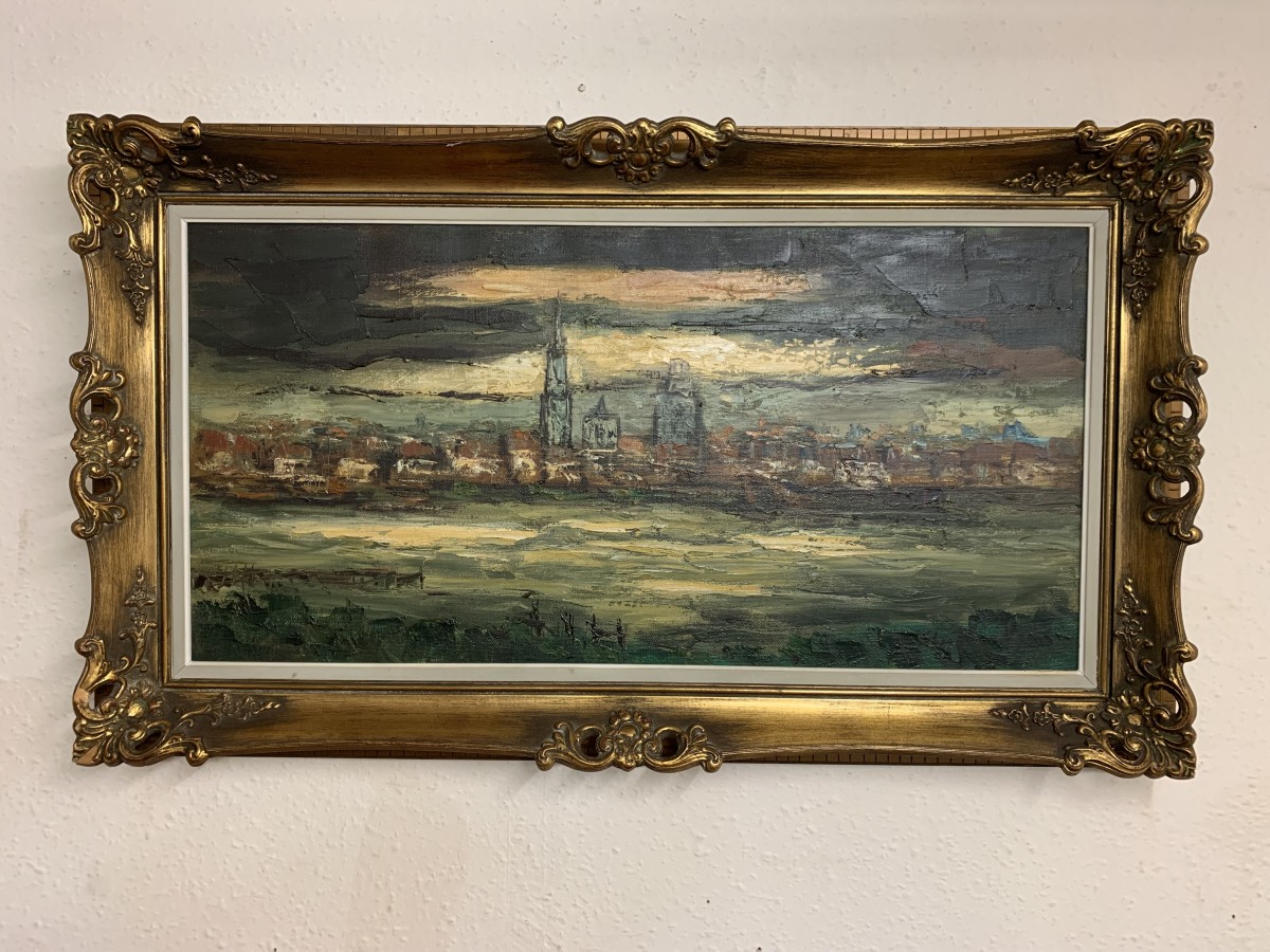 This beautiful oil painting sits in a fabulous carved gilt frame. The oil on canvas depicts a town seen. A beautiful picture.