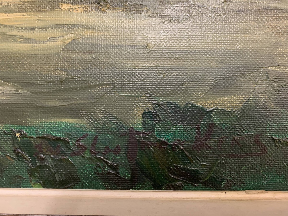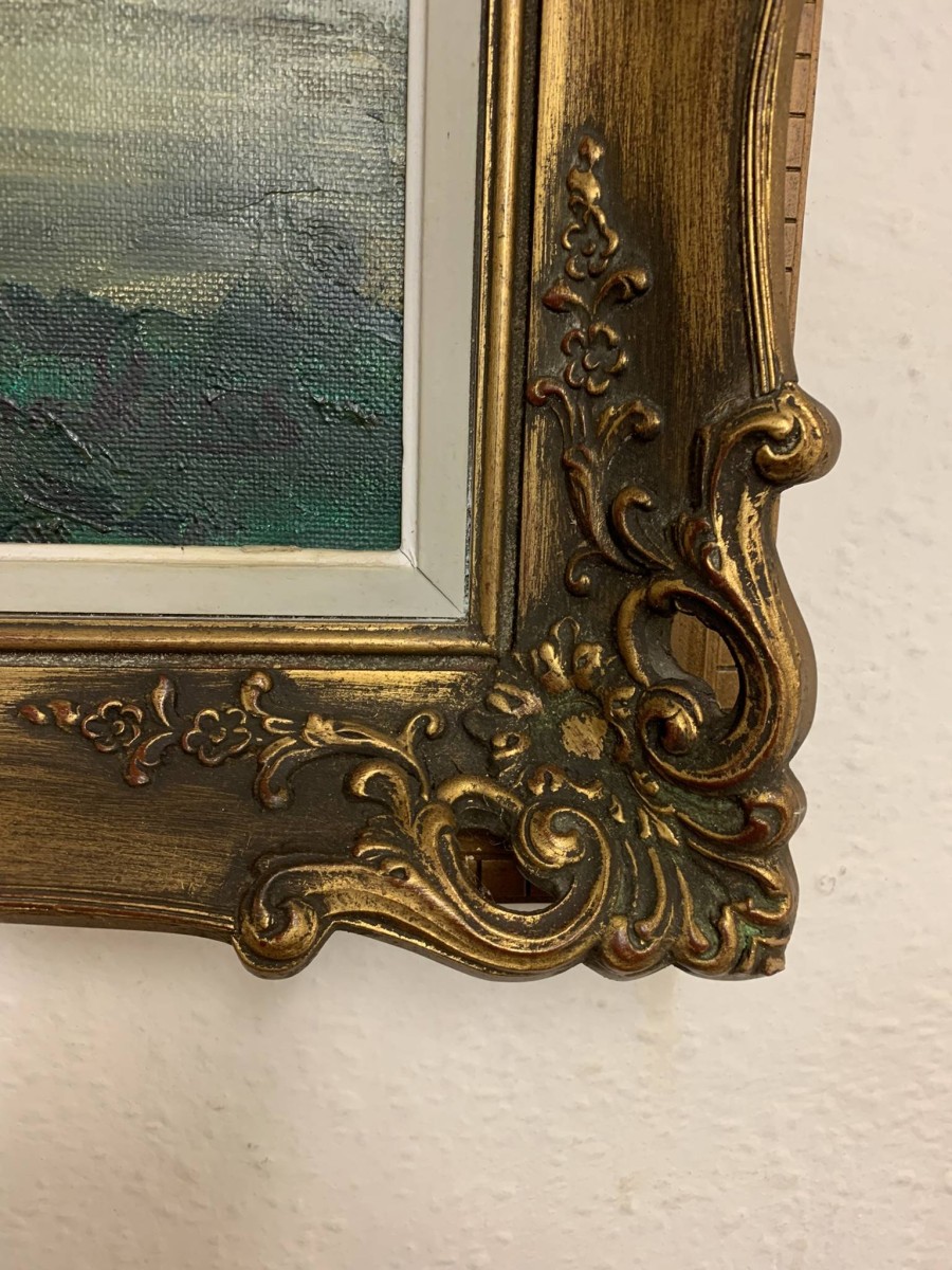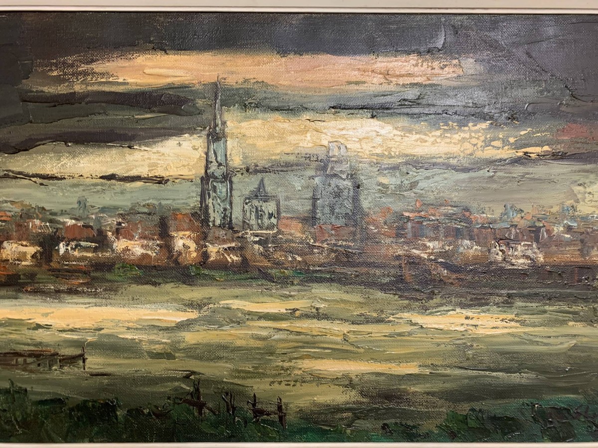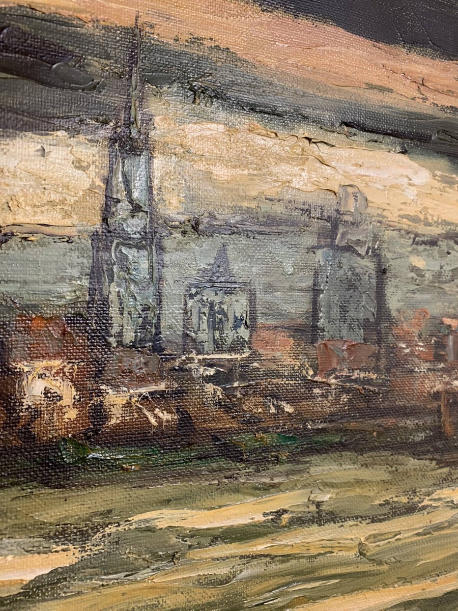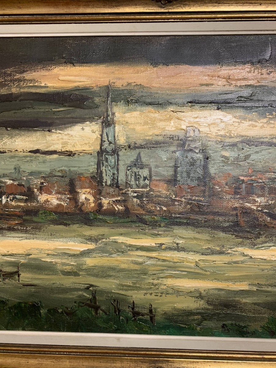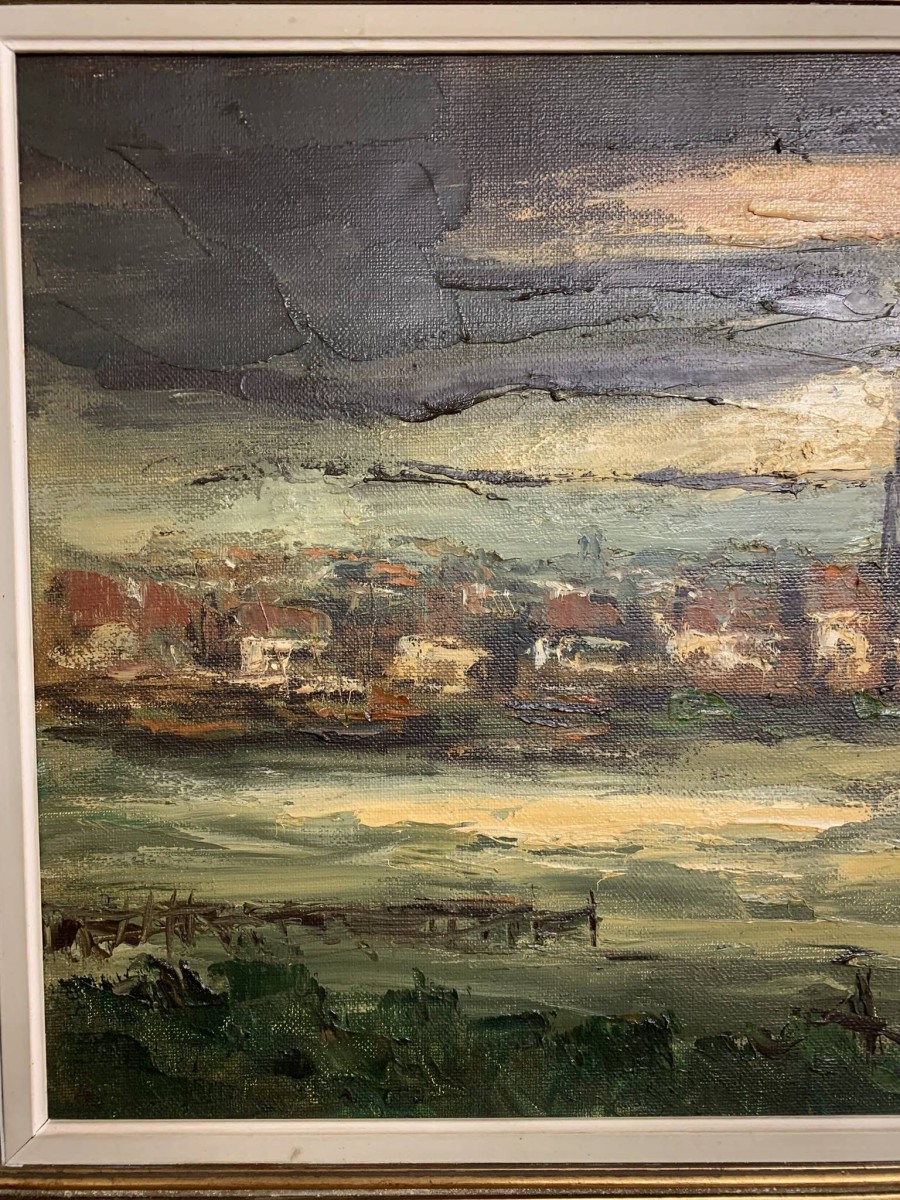 This beautiful oil painting sits in a fabulous carved gilt frame. The oil on canvas depicts a town seen. A beautiful picture.