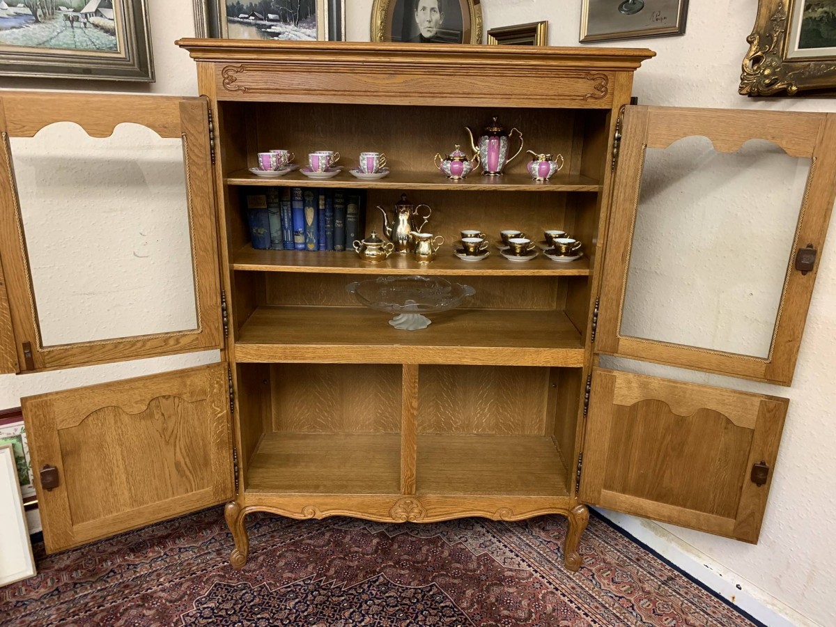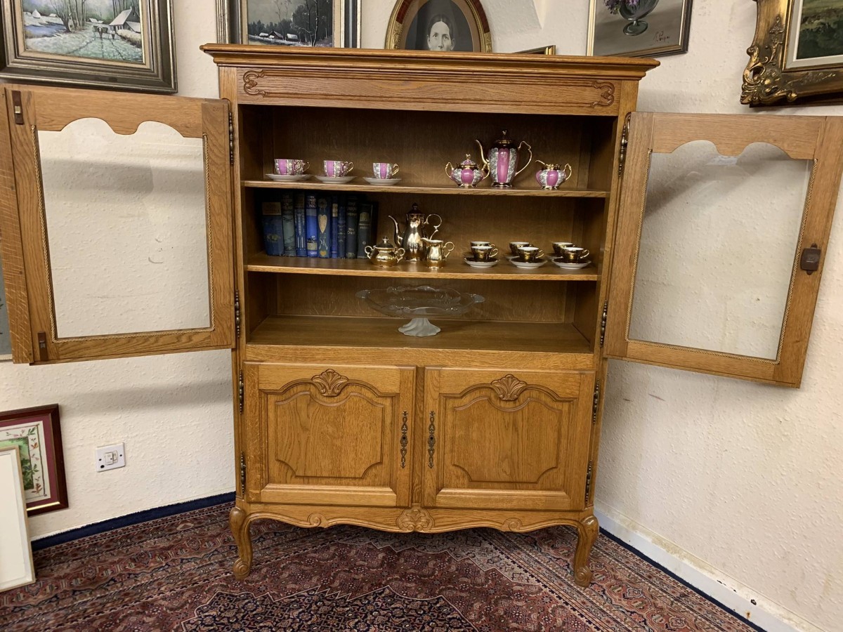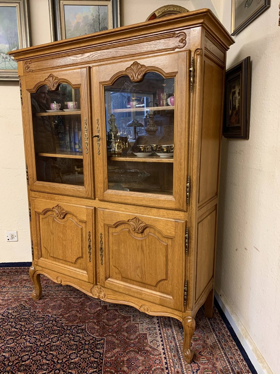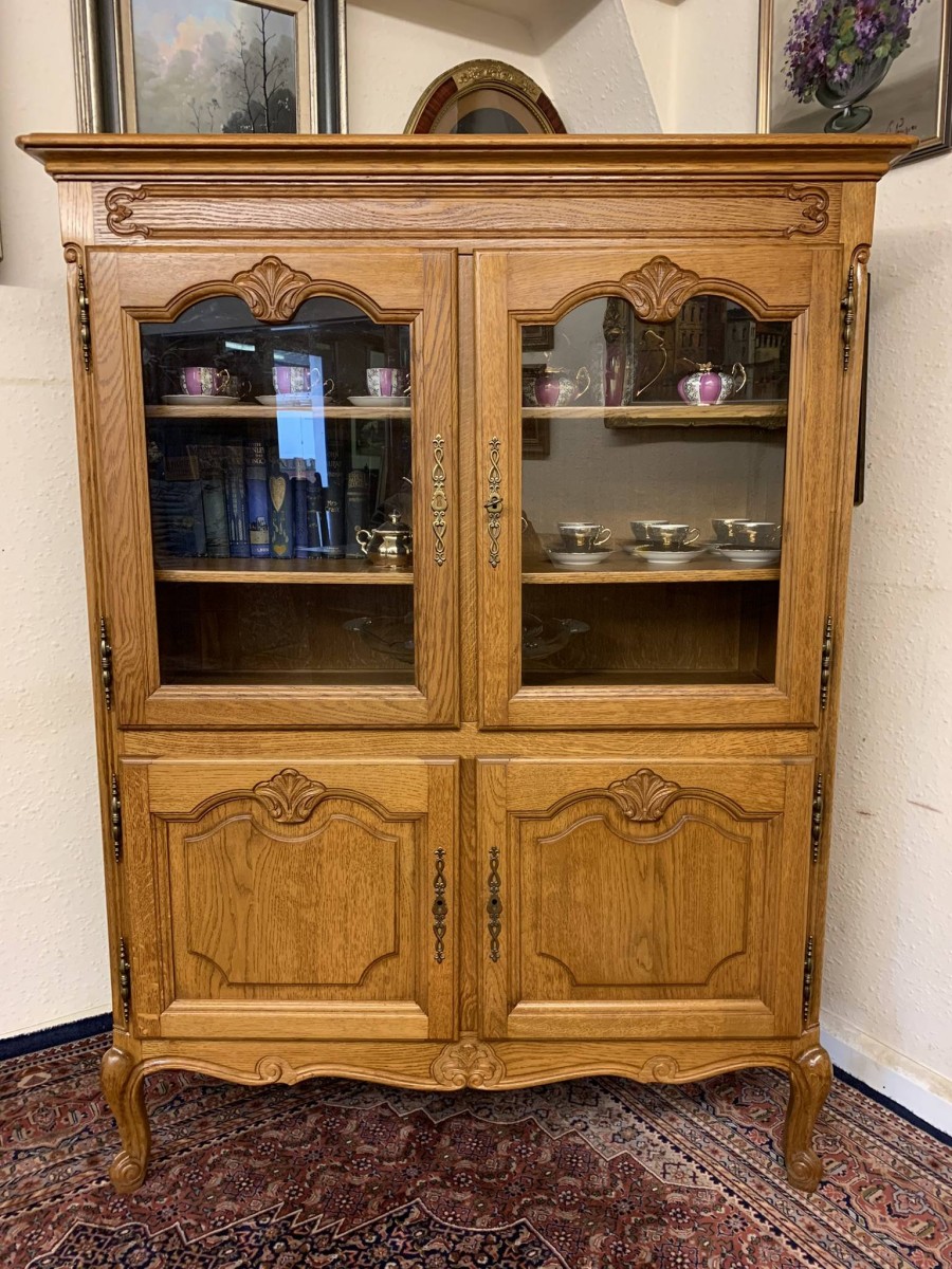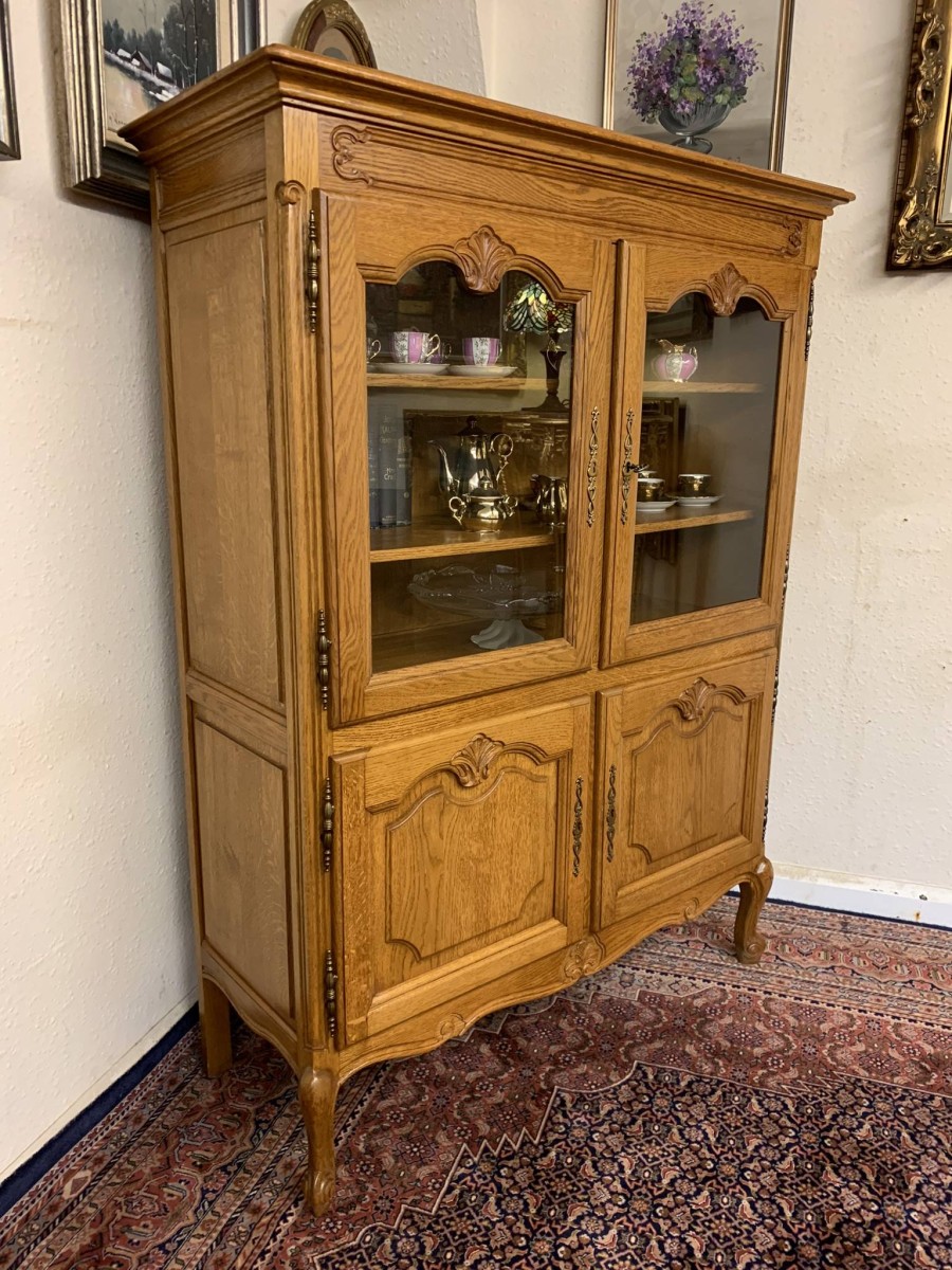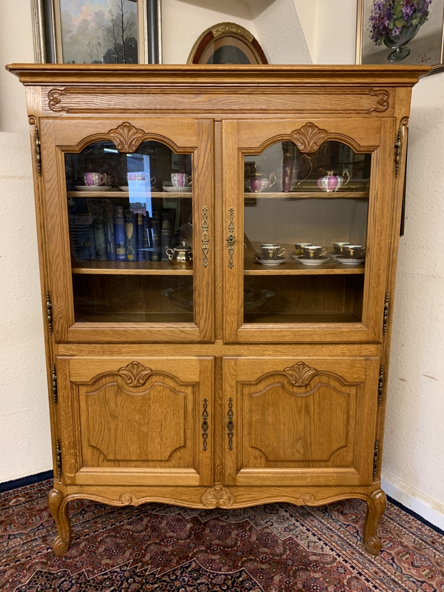The cabinet is made in glorious oak and is in excellent condition. The oversailing top sits above a pair of glazed lockable doors, each door having brass hinges, brass escutcheons and carvings to the top. The doors open to reveal two removable shelves. Below are a pair of shaped recessed panelled lockable doors, each door having brass hinges, brass escutcheons and carvings to the top of the doors. Recessed panel sides, shaped skirt with central carving this fantastic item of French furniture stands on two carved cabriole legs to the front.