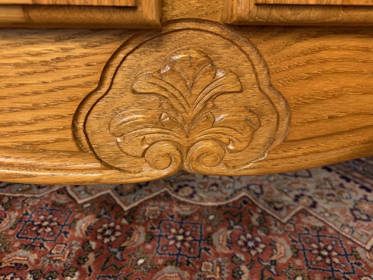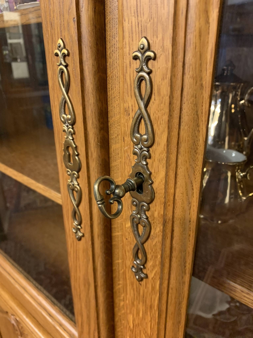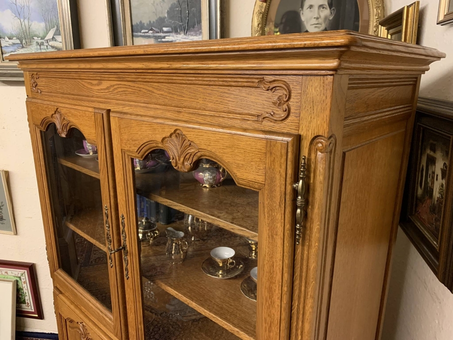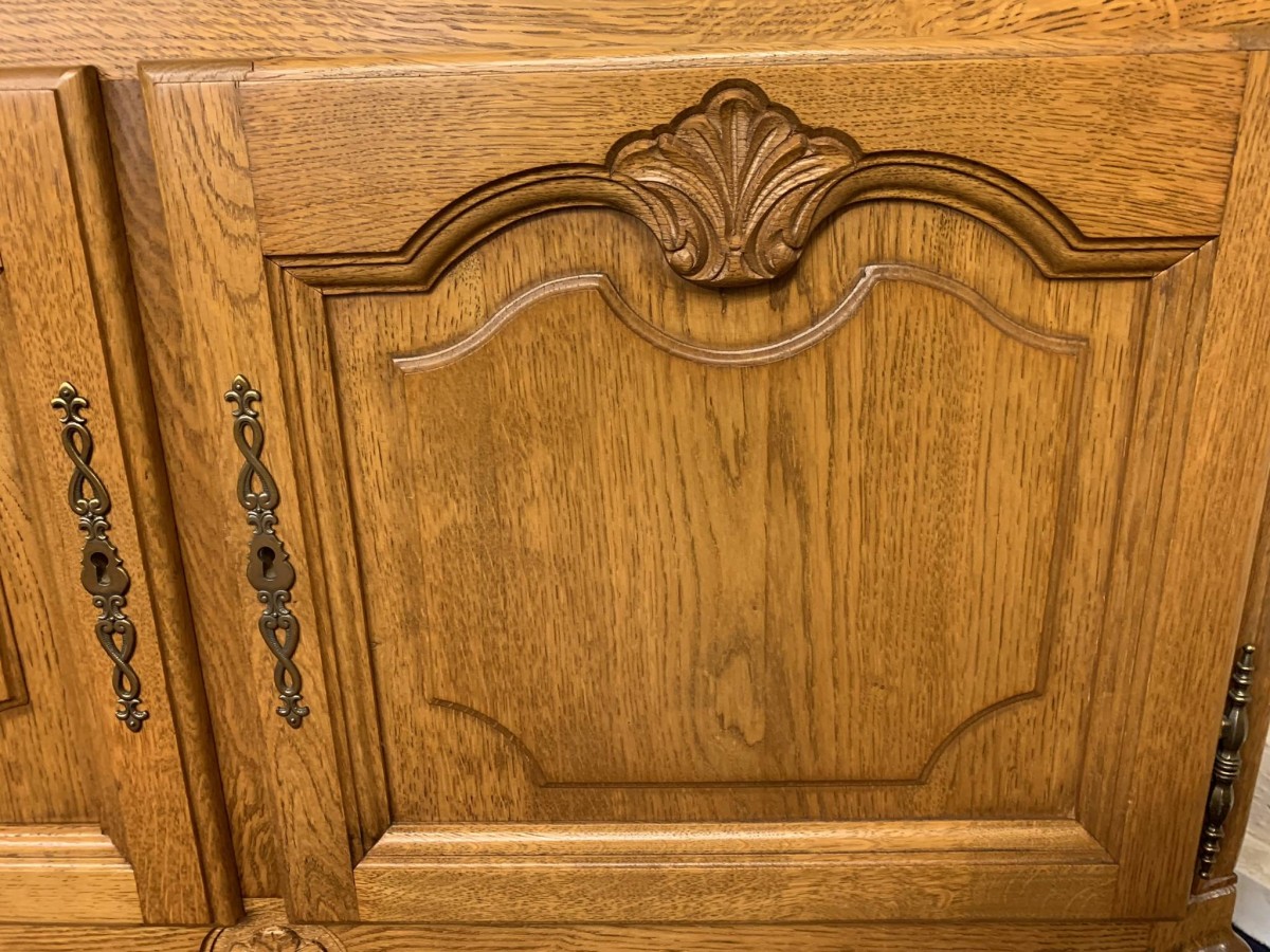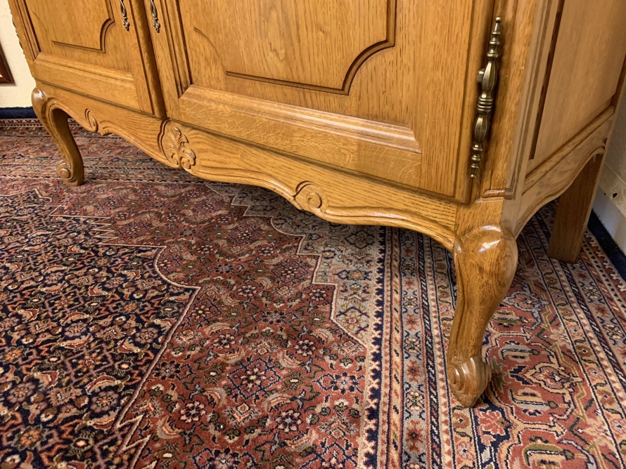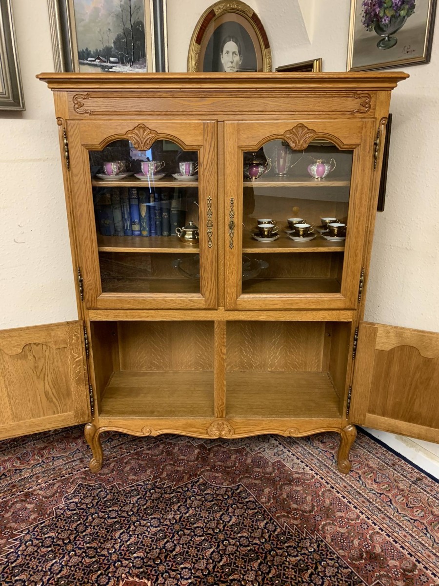 The cabinet is made in glorious oak and is in excellent condition. The oversailing top sits above a pair of glazed lockable doors, each door having brass hinges, brass escutcheons and carvings to the top. The doors open to reveal two removable shelves. Below are a pair of shaped recessed panelled lockable doors, each door having brass hinges, brass escutcheons and carvings to the top of the doors. Recessed panel sides, shaped skirt with central carving this fantastic item of French furniture stands on two carved cabriole legs to the front.