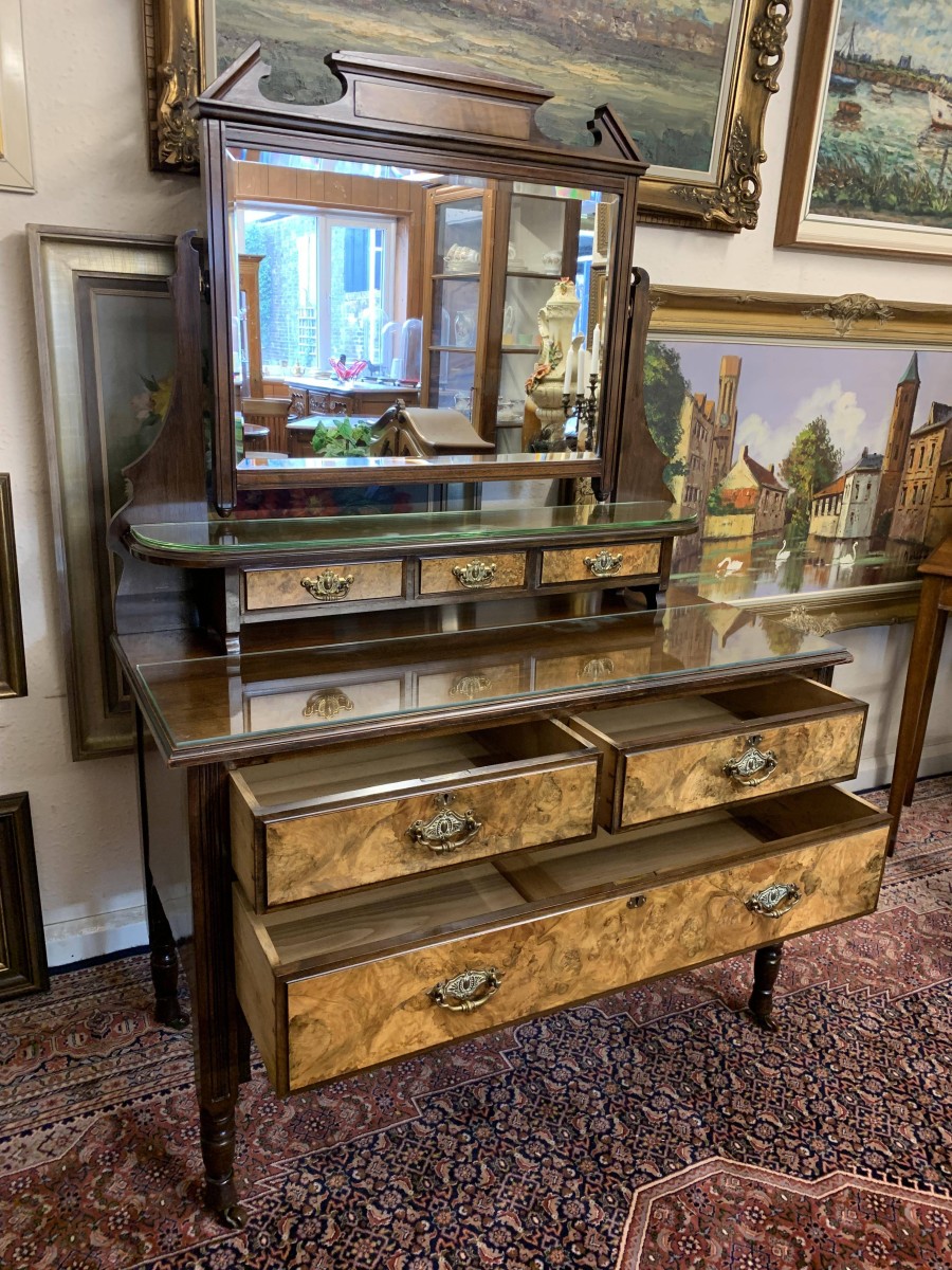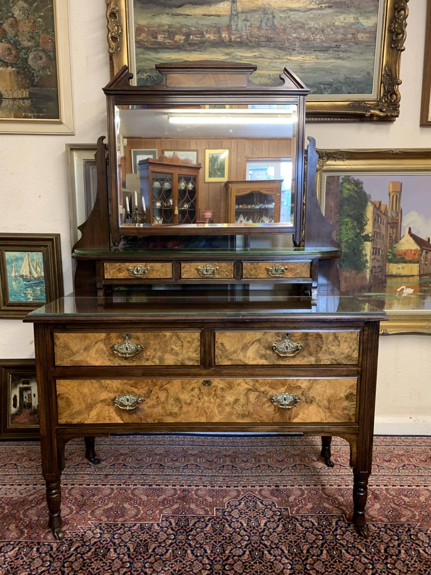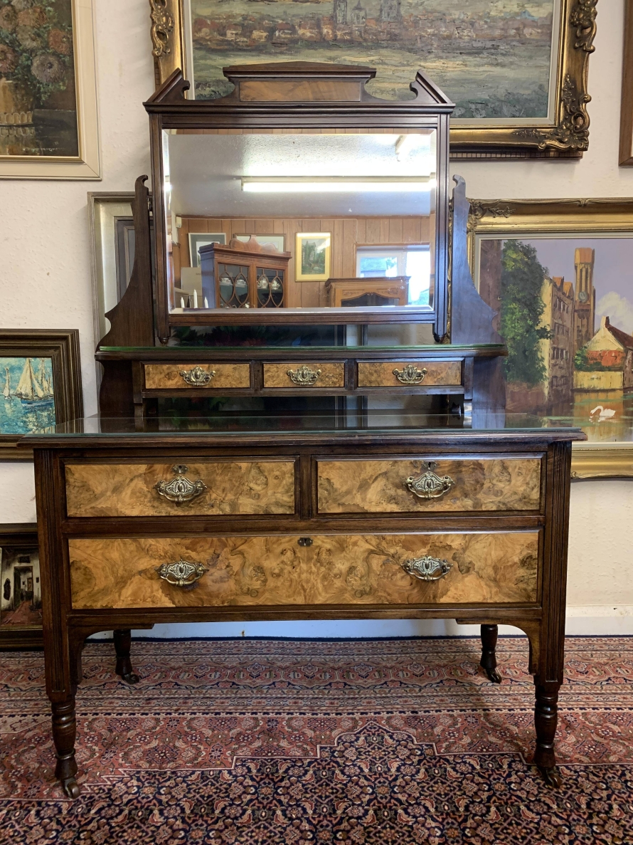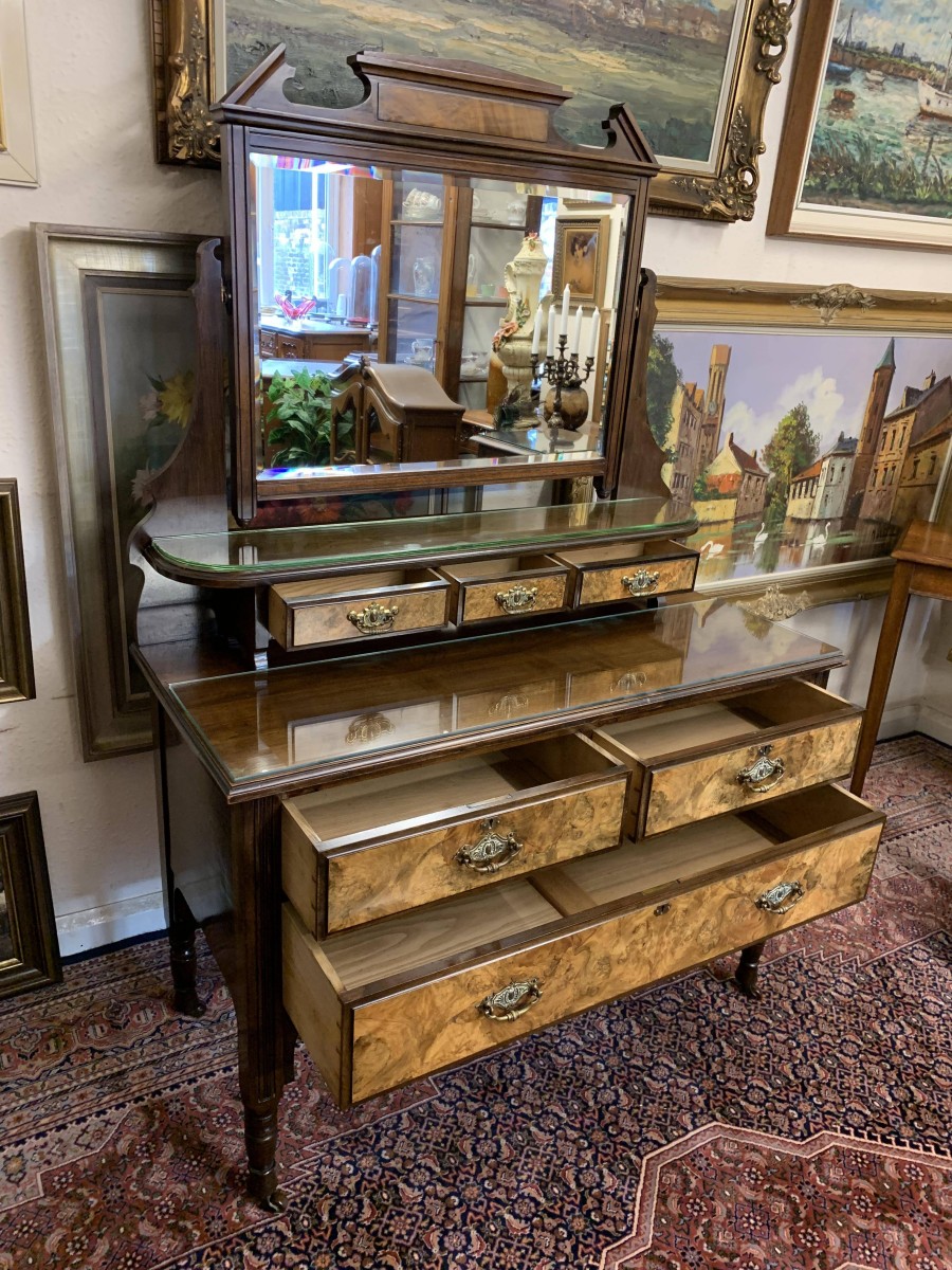 This super burr walnut dressing table dates circa 1910. The dressing table has a mirror which sits above a shelf, the shelf having three drawers, each drawer having an ornate brass handle. The shelf has a removable glass protector. Below are two short above one long drawers, the short drawers having an ornate brass handle and the longer drawer having a pair of ornate brass handles. This elegant dressing table stands on four turned legs on four original brass casters.