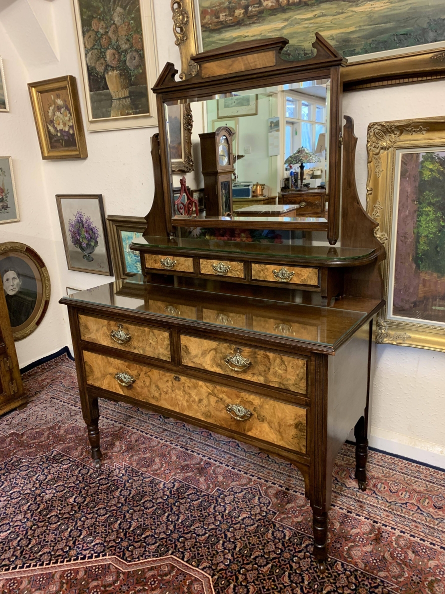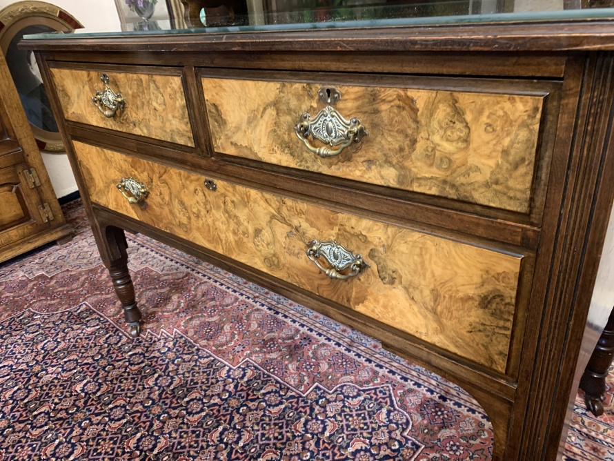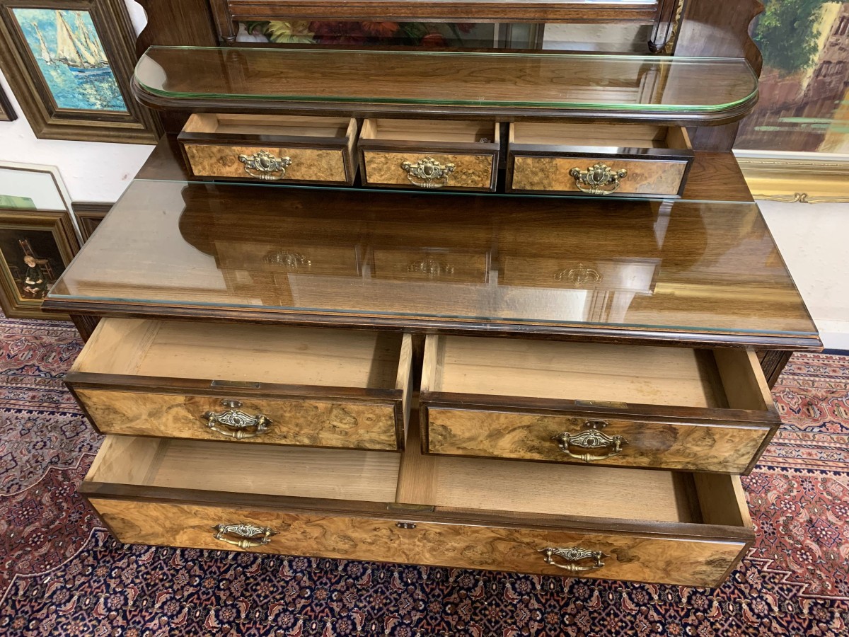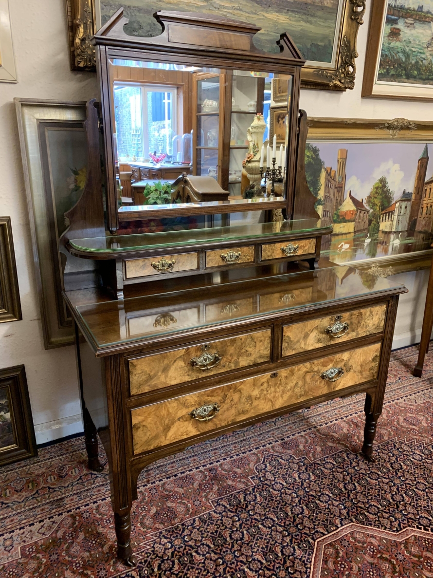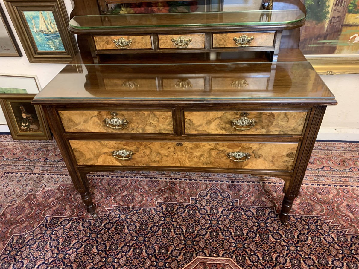 This super burr walnut dressing table dates circa 1910. The dressing table has a mirror which sits above a shelf, the shelf having three drawers, each drawer having an ornate brass handle. The shelf has a removable glass protector. Below are two short above one long drawers, the short drawers having an ornate brass handle and the longer drawer having a pair of ornate brass handles. This elegant dressing table stands on four turned legs on four original brass casters.