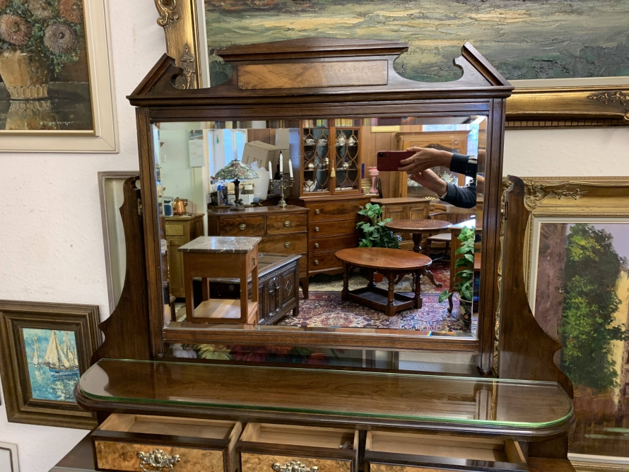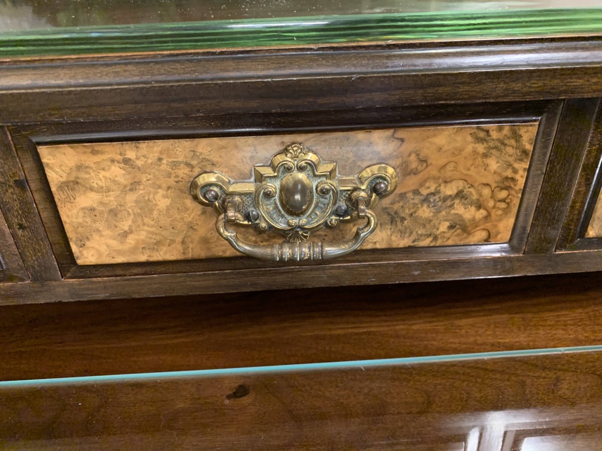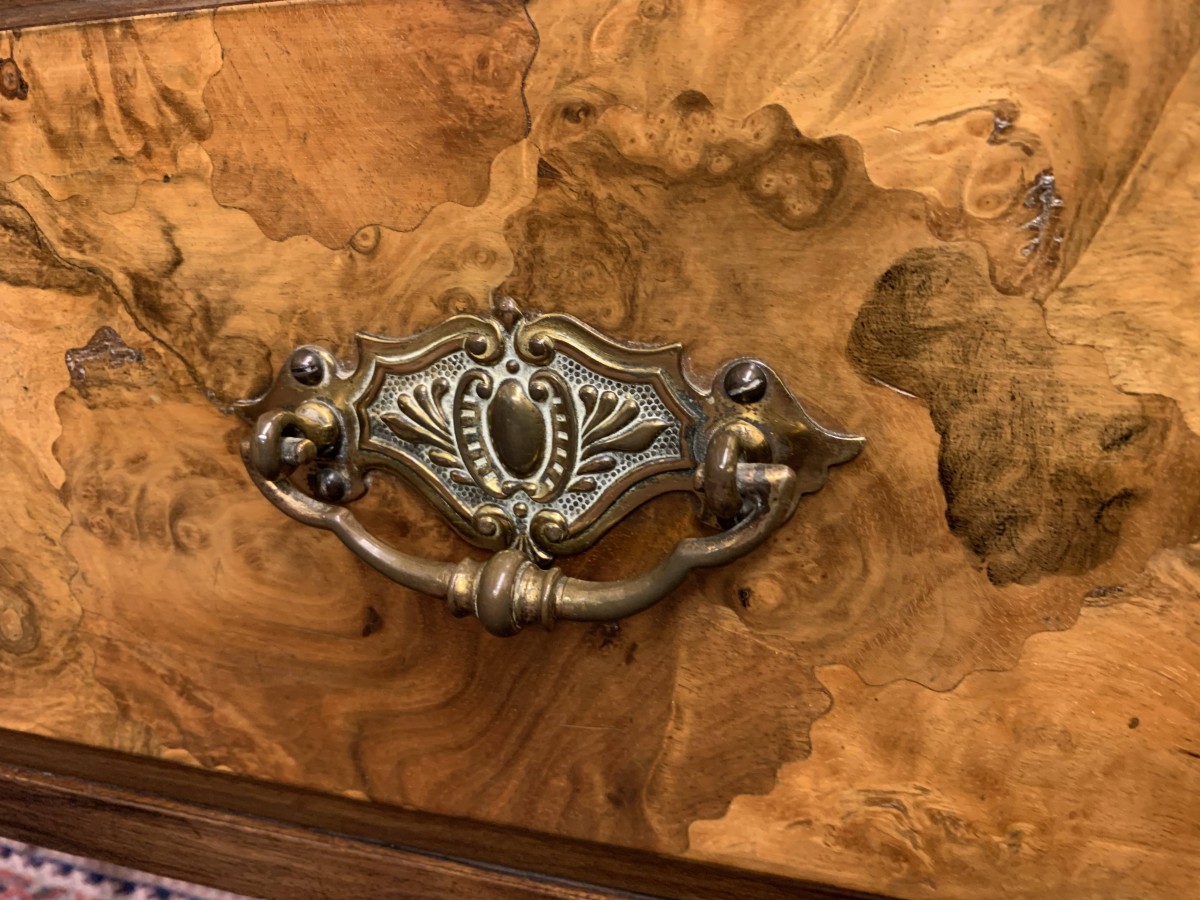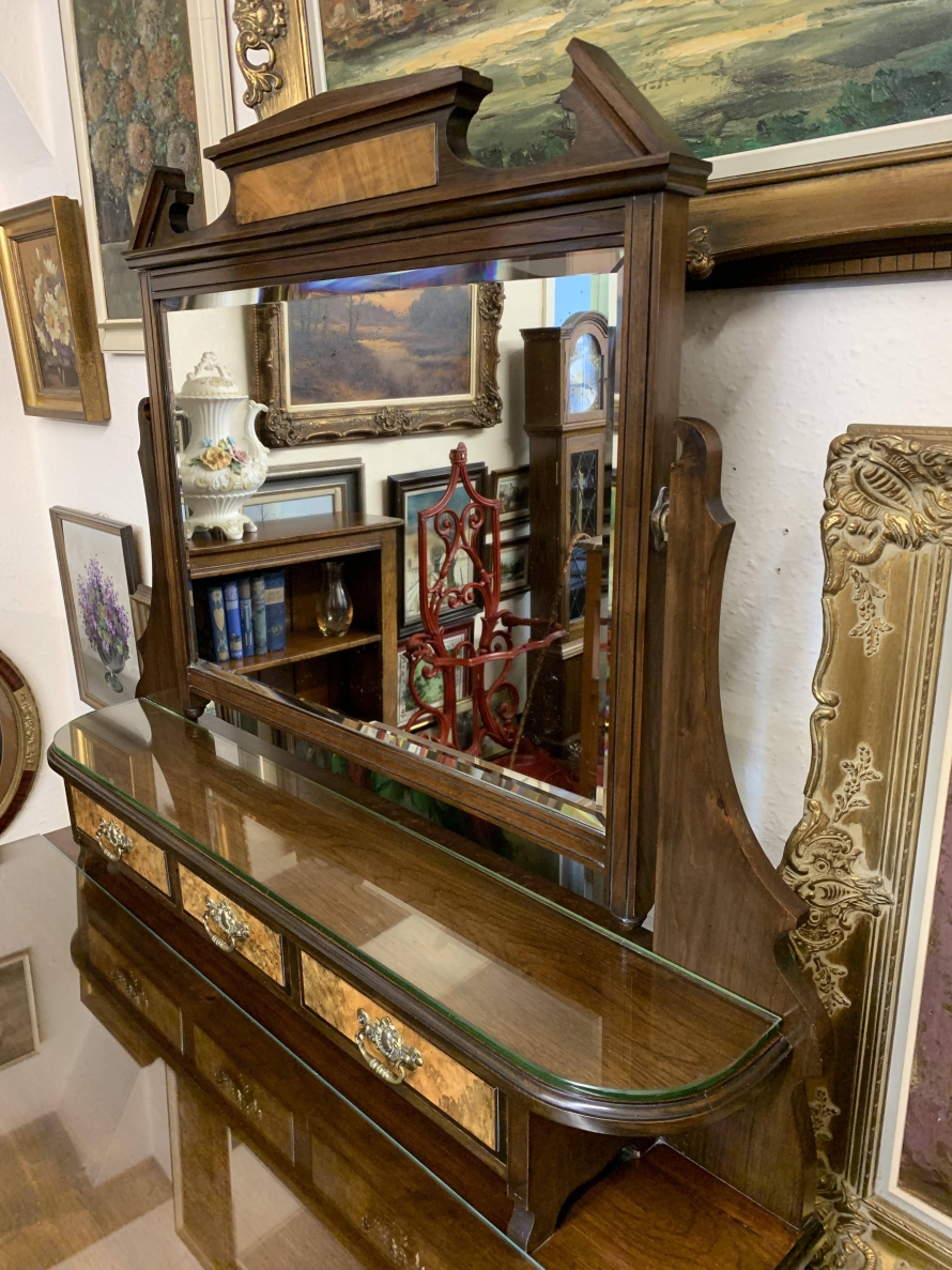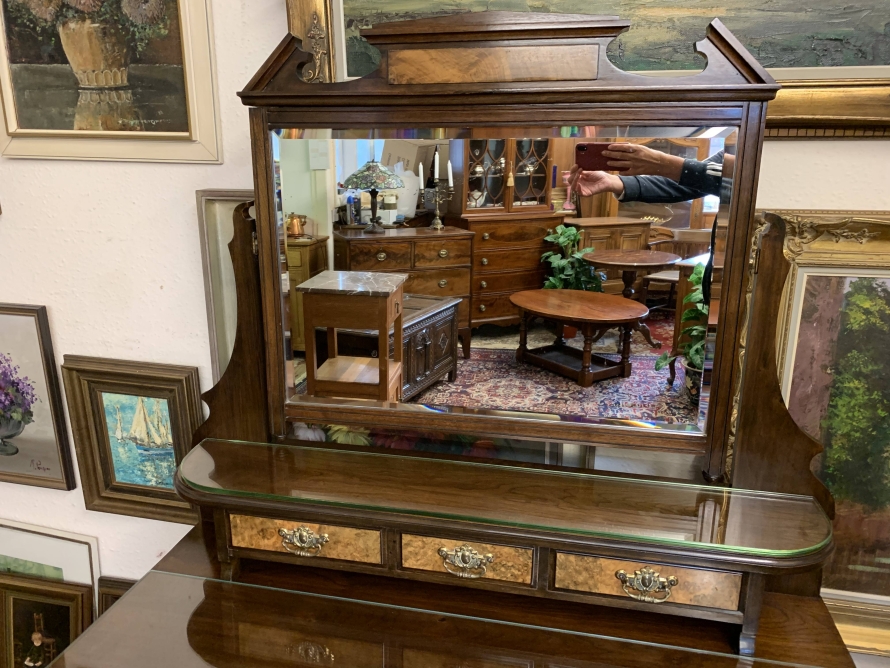 This super burr walnut dressing table dates circa 1910. The dressing table has a mirror which sits above a shelf, the shelf having three drawers, each drawer having an ornate brass handle. The shelf has a removable glass protector. Below are two short above one long drawers, the short drawers having an ornate brass handle and the longer drawer having a pair of ornate brass handles. This elegant dressing table stands on four turned legs on four original brass casters.