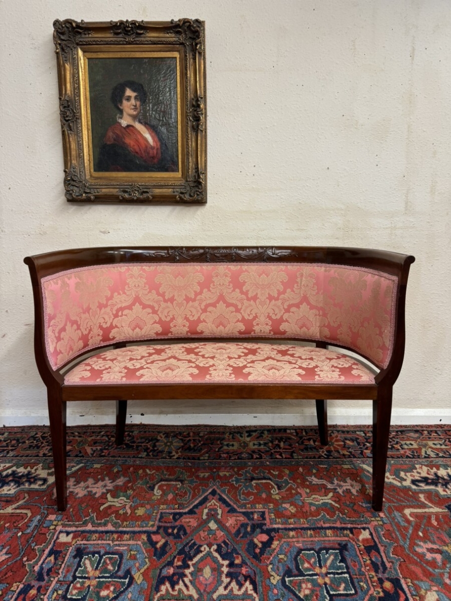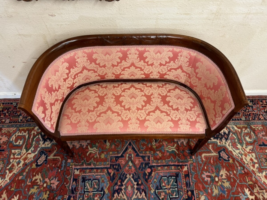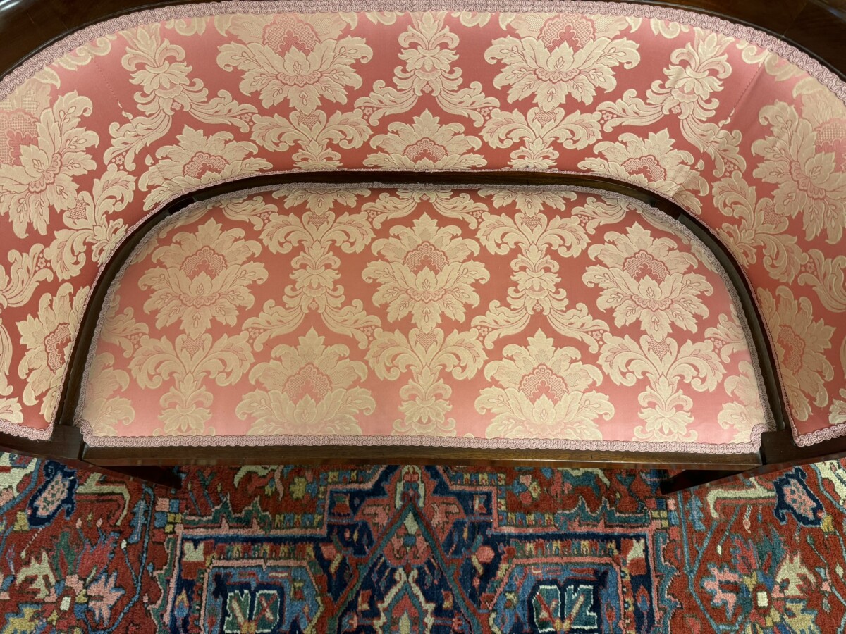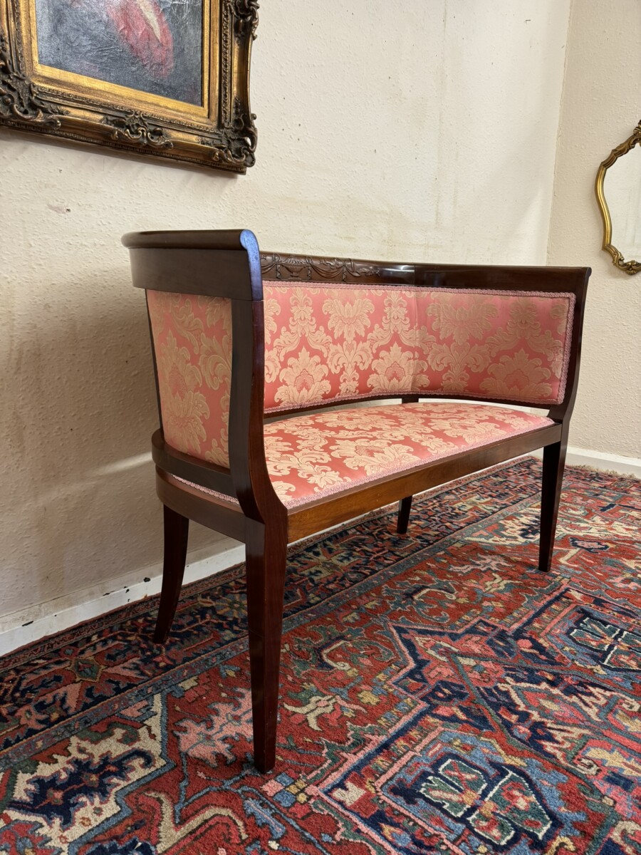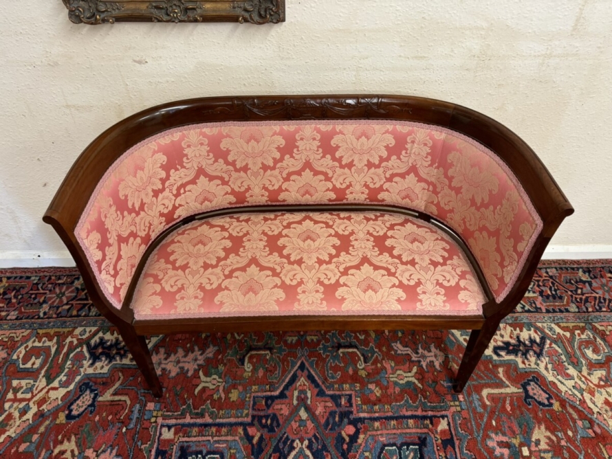 This fabulous seat dates circa 1910. The curved back having subtle carved decoration. Upholstered back rest and seat and standing on four tapered legs.