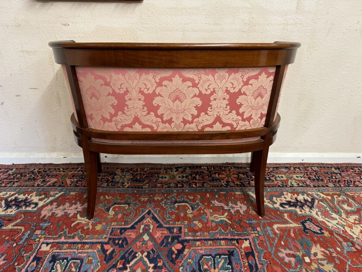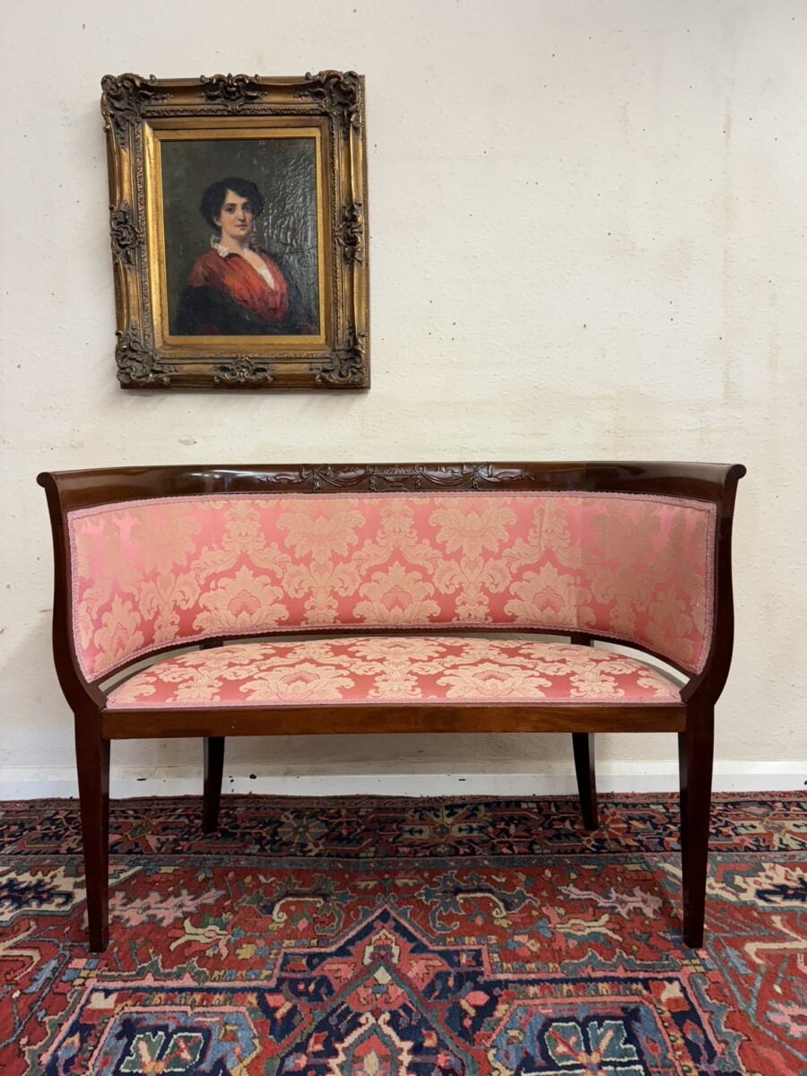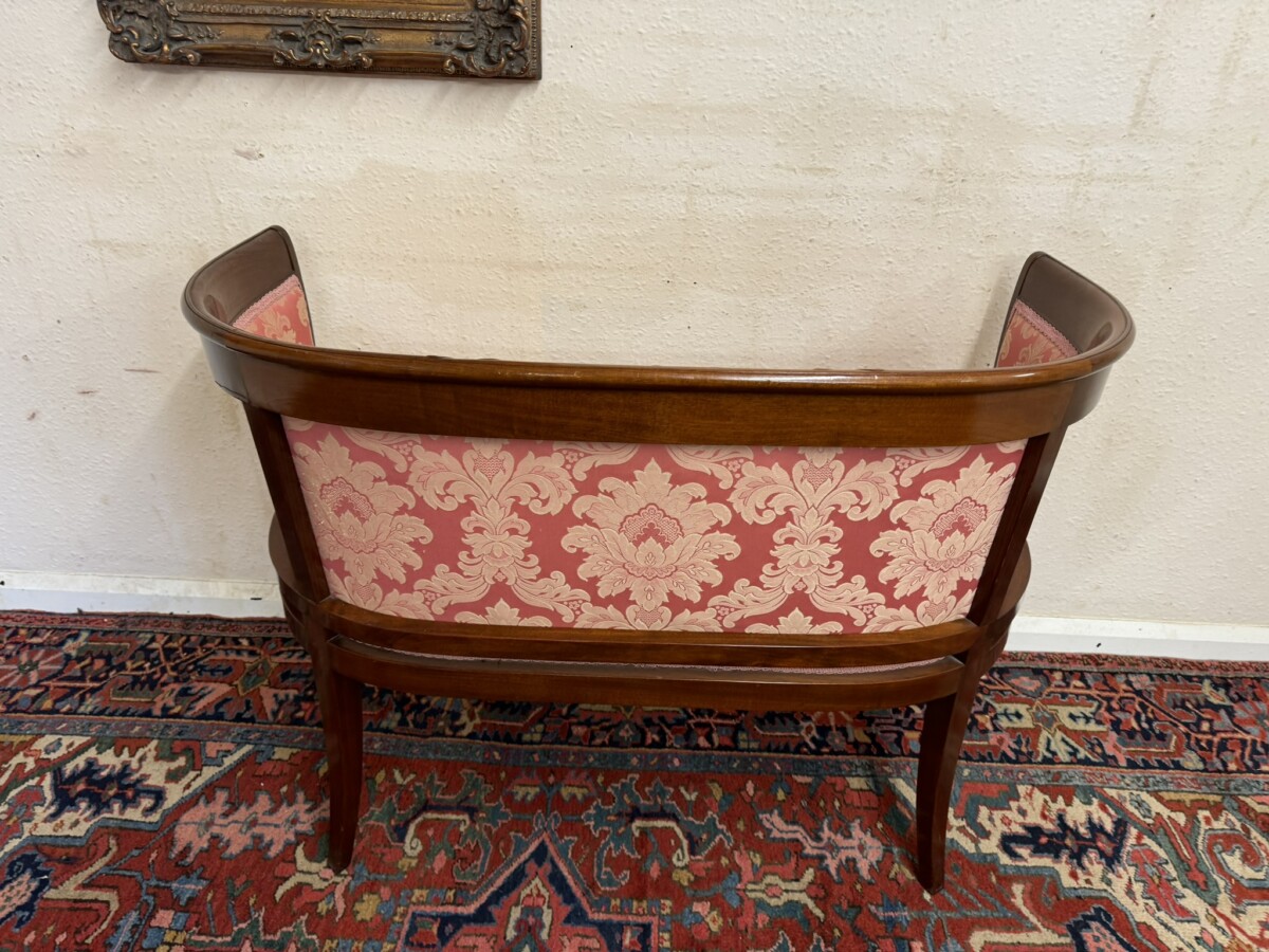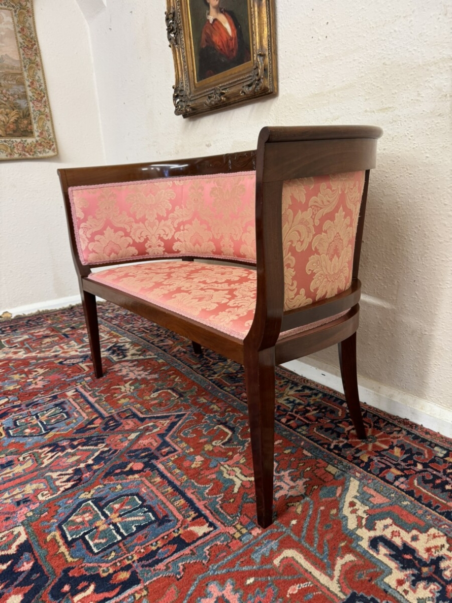 This fabulous seat dates circa 1910. The curved back having subtle carved decoration. Upholstered back rest and seat and standing on four tapered legs.