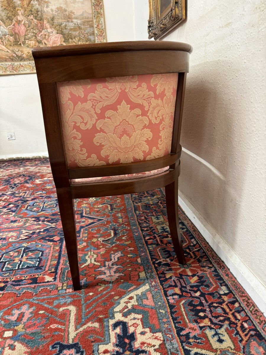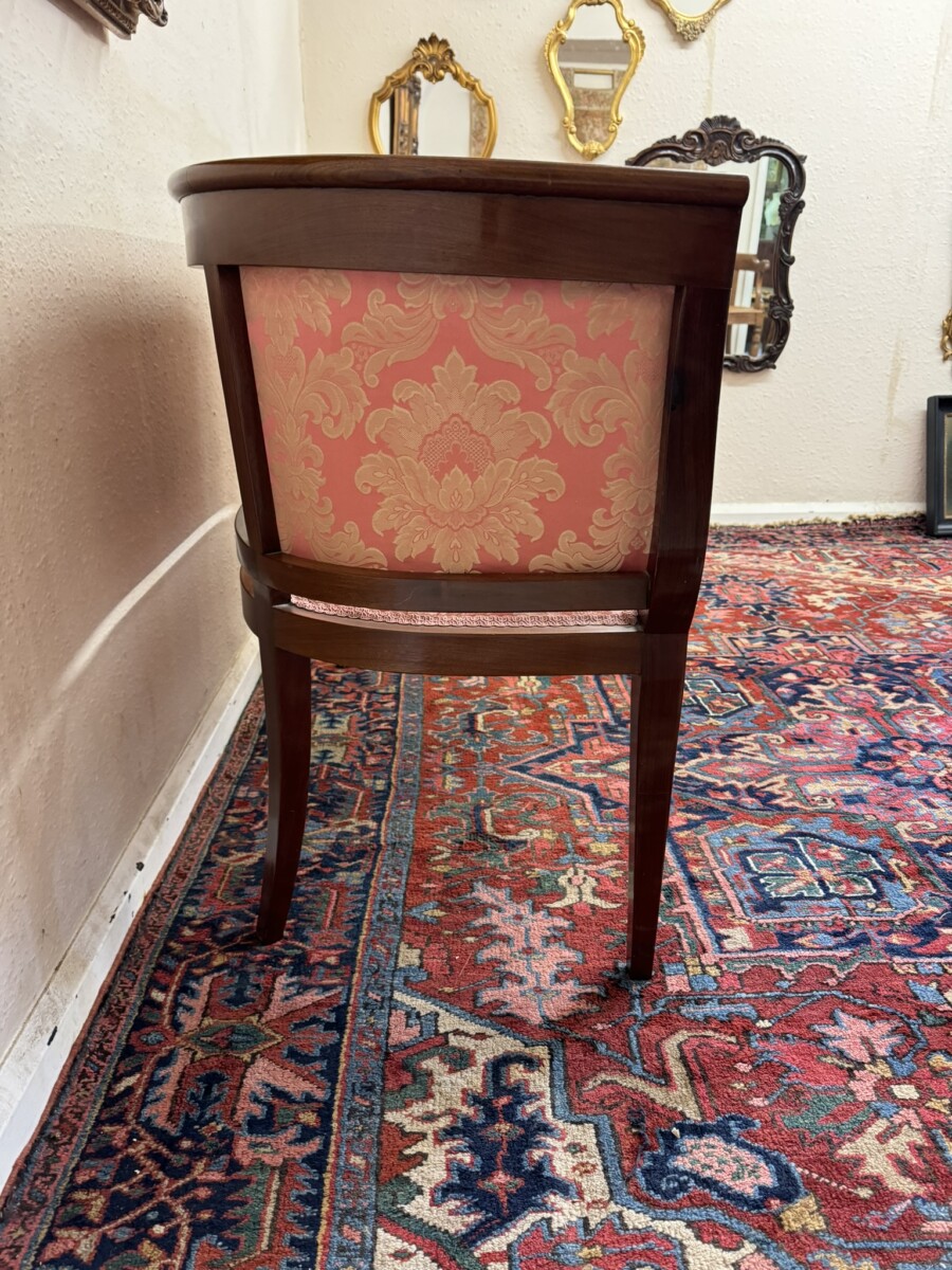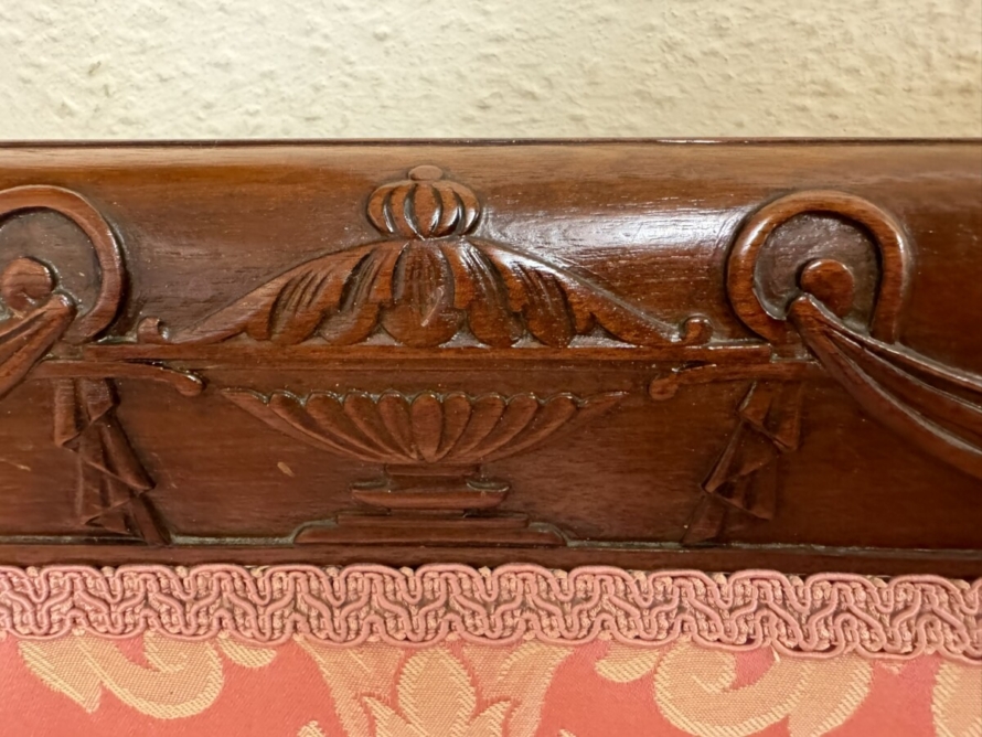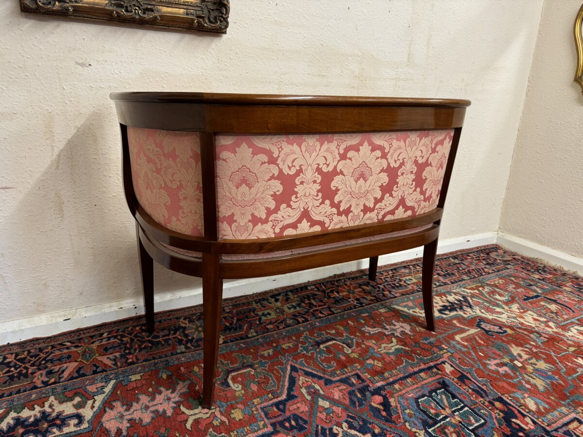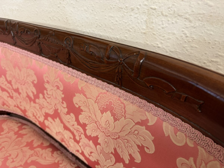 This fabulous seat dates circa 1910. The curved back having subtle carved decoration. Upholstered back rest and seat and standing on four tapered legs.