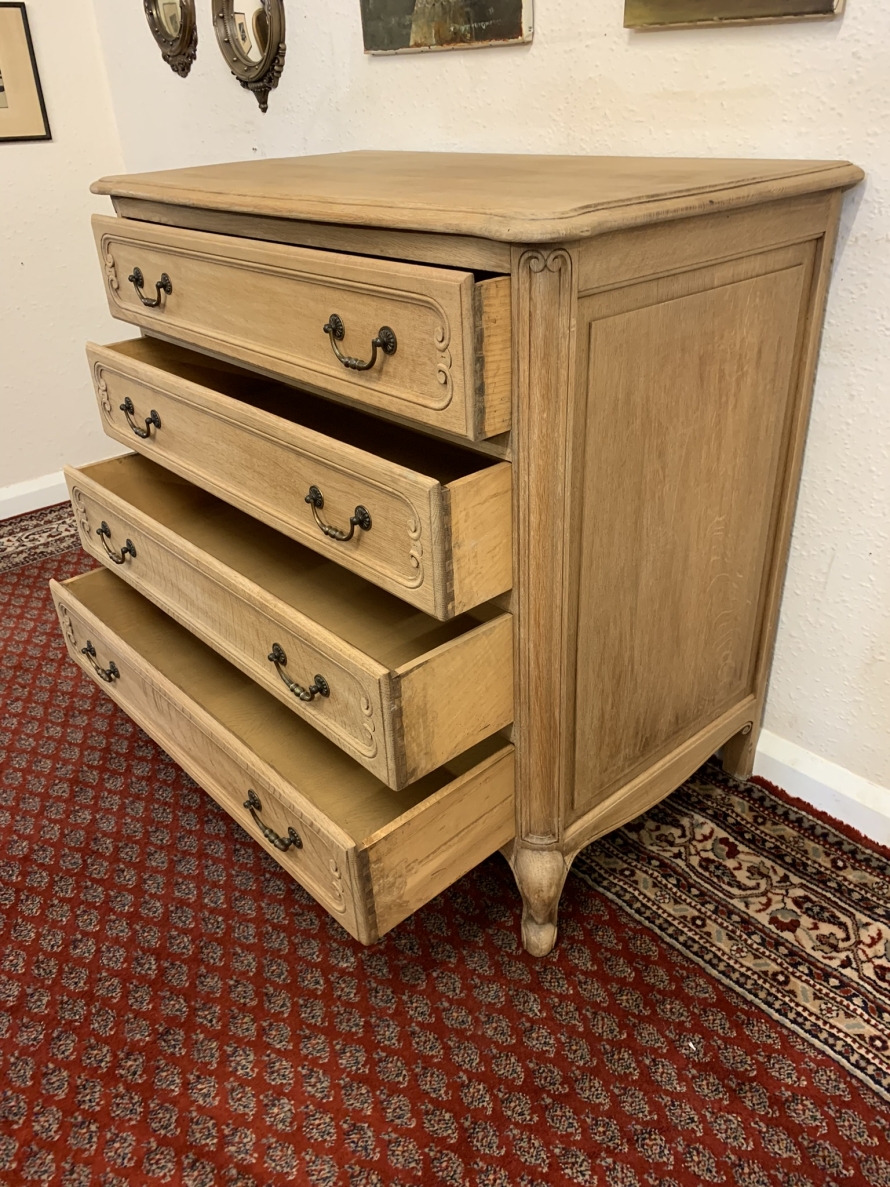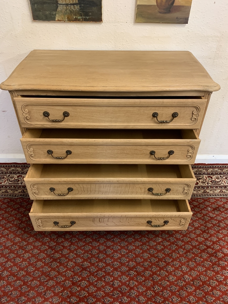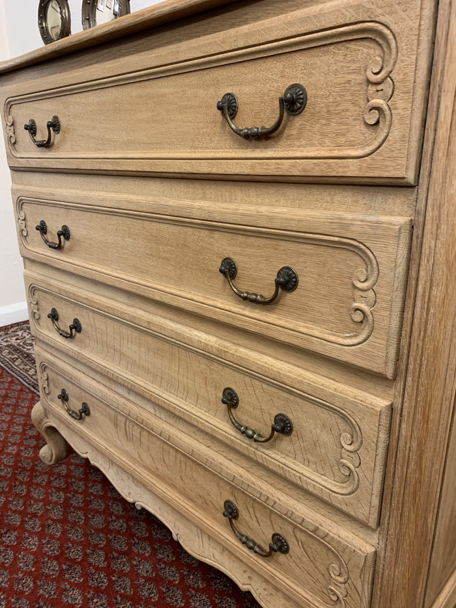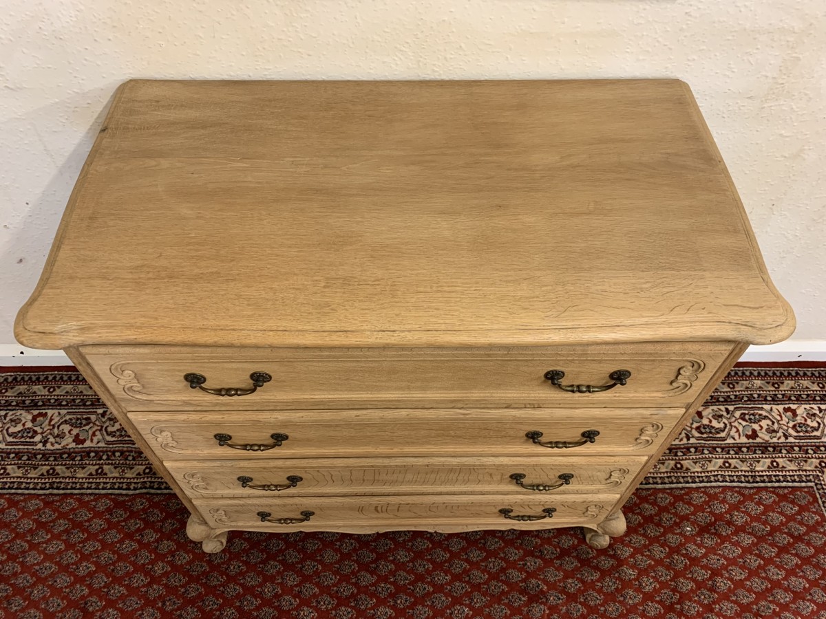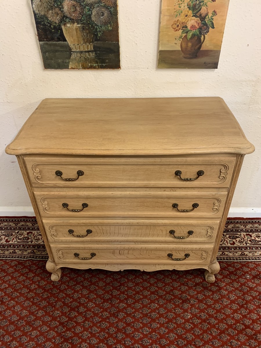This stylish raw oak chest has a shaped oversailing top which sits above four carved drawers, each drawer having a pair of drop handles. Recessed panelled sides, shaped carved skirt this fabulous chest of drawers stands on carved cabriole legs to the front.