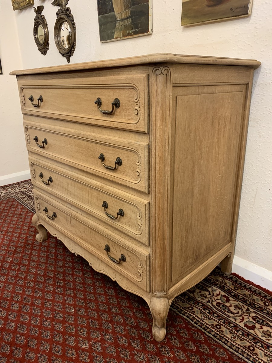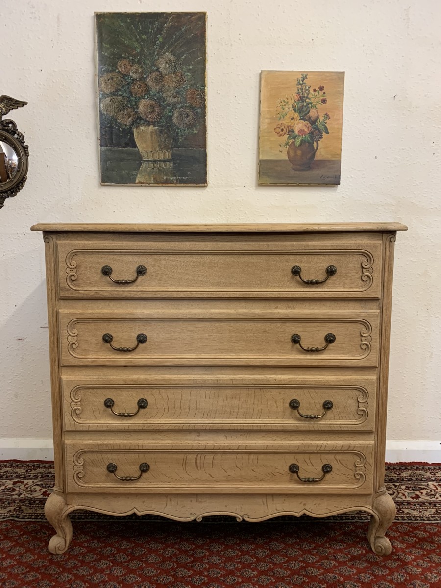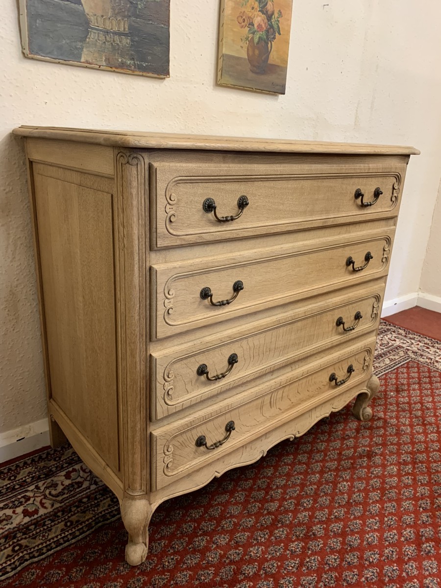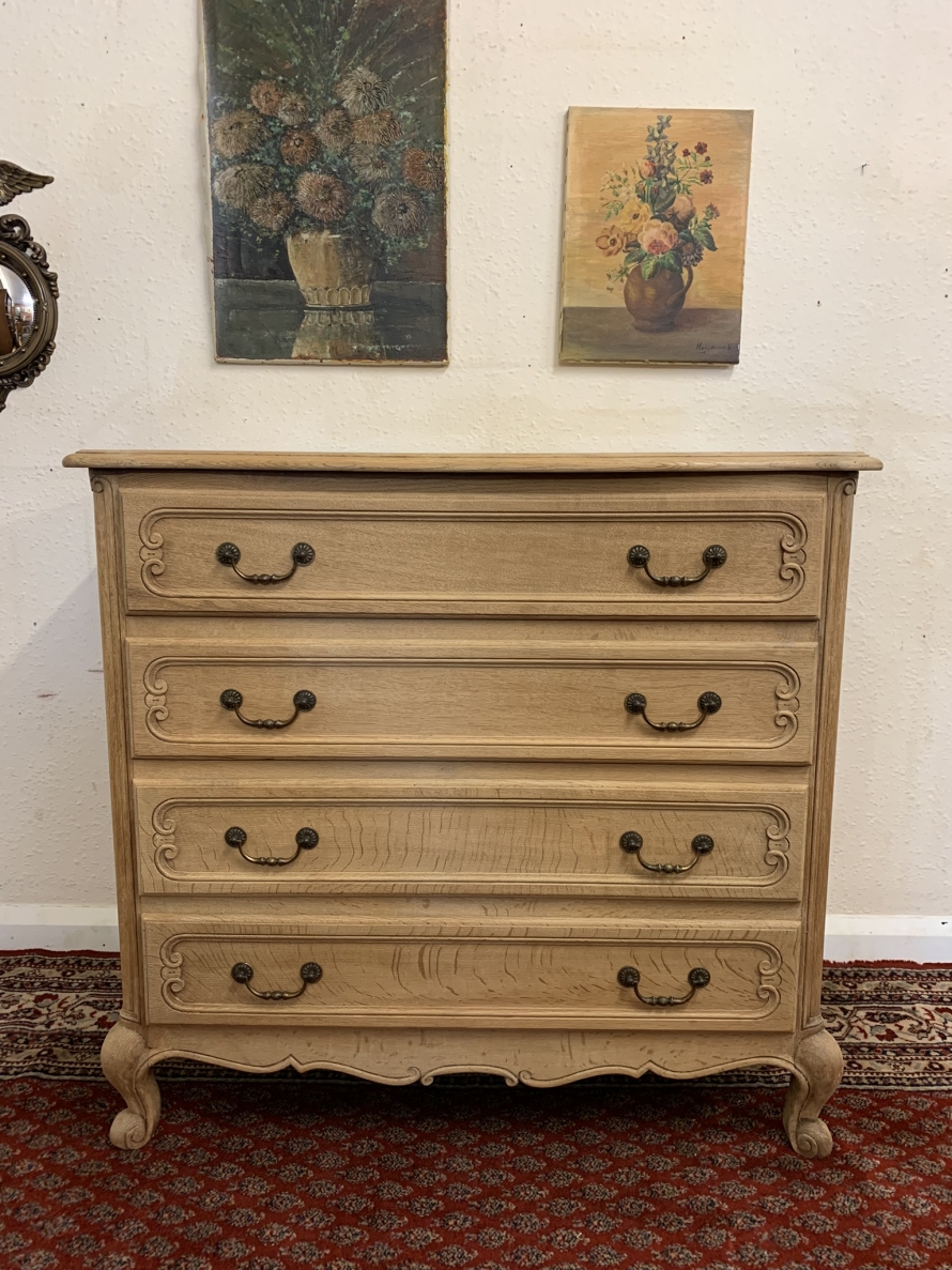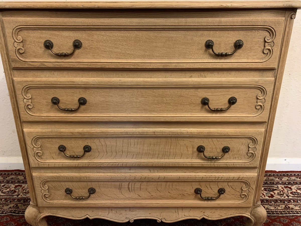This stylish raw oak chest has a shaped oversailing top which sits above four carved drawers, each drawer having a pair of drop handles. Recessed panelled sides, shaped carved skirt this fabulous chest of drawers stands on carved cabriole legs to the front.