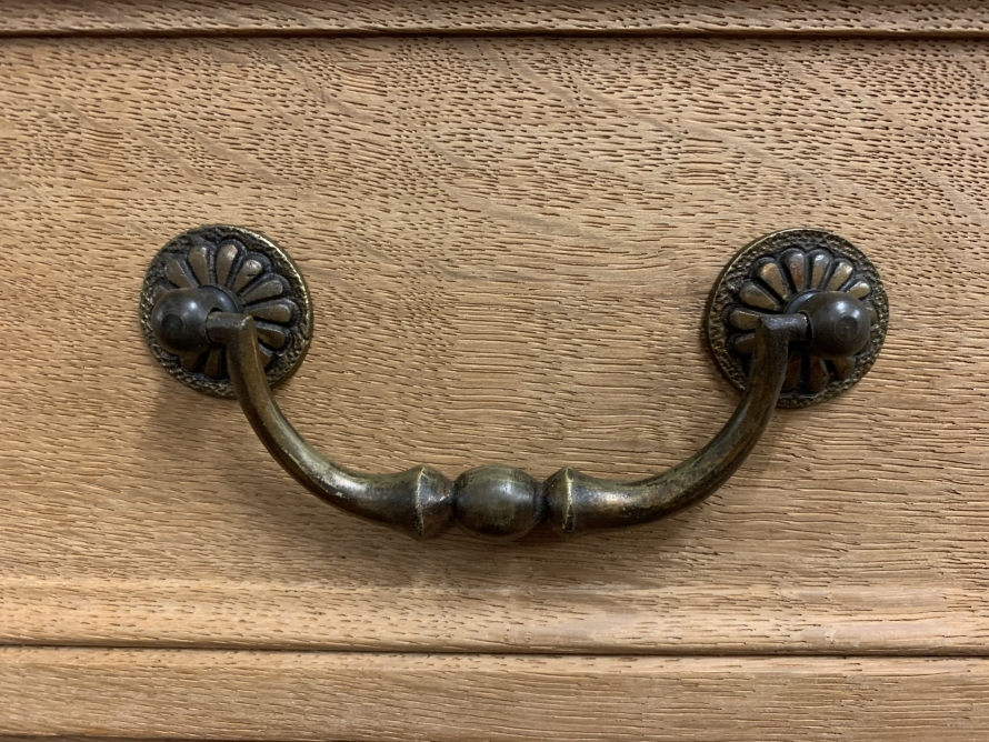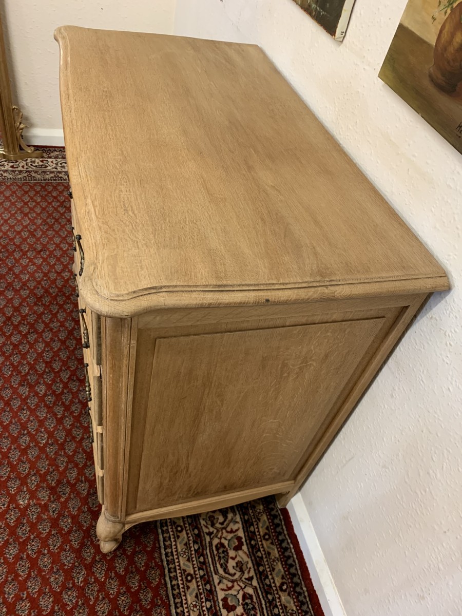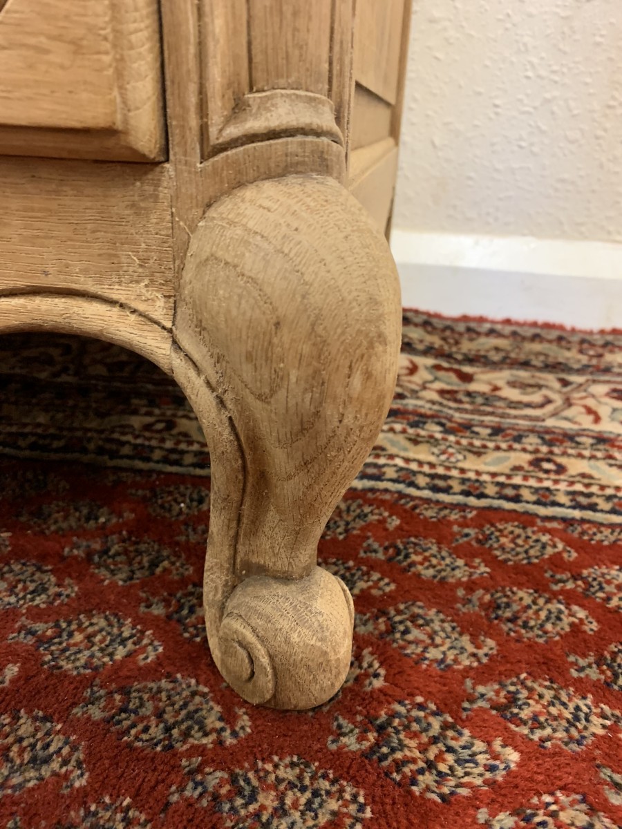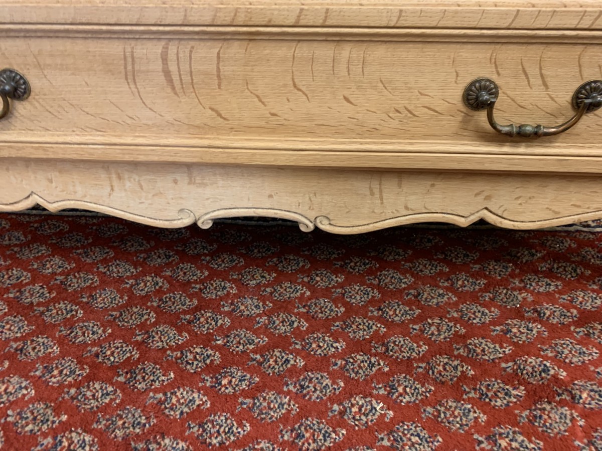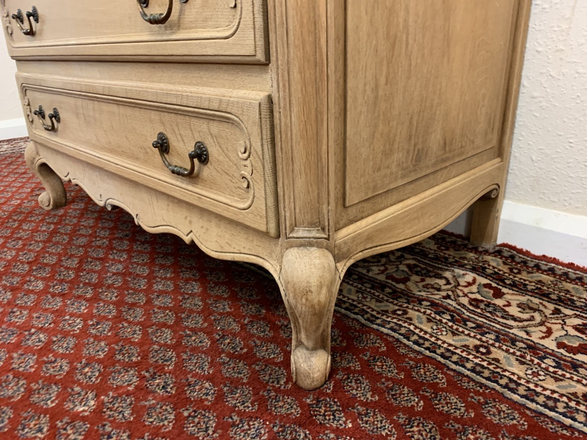 This stylish raw oak chest has a shaped oversailing top which sits above four carved drawers, each drawer having a pair of drop handles. Recessed panelled sides, shaped carved skirt this fabulous chest of drawers stands on carved cabriole legs to the front.