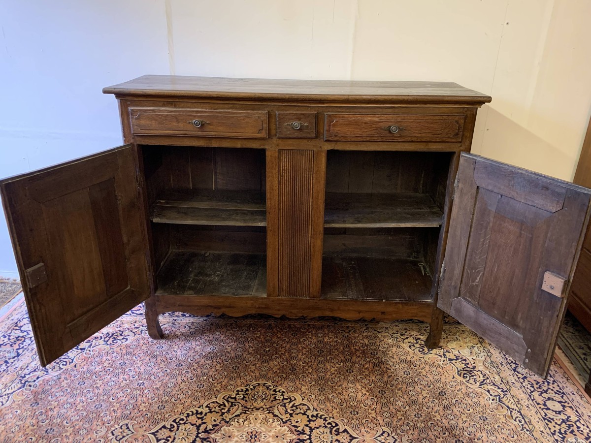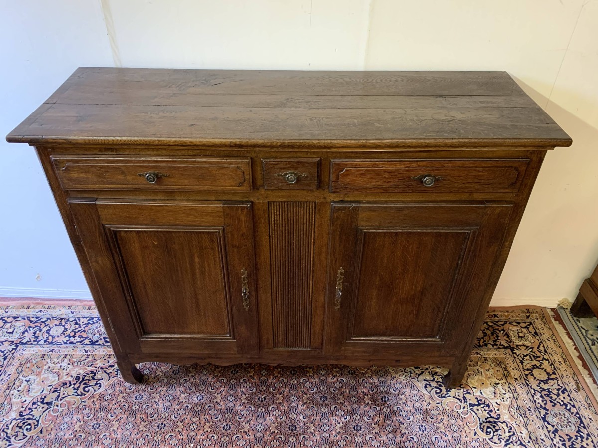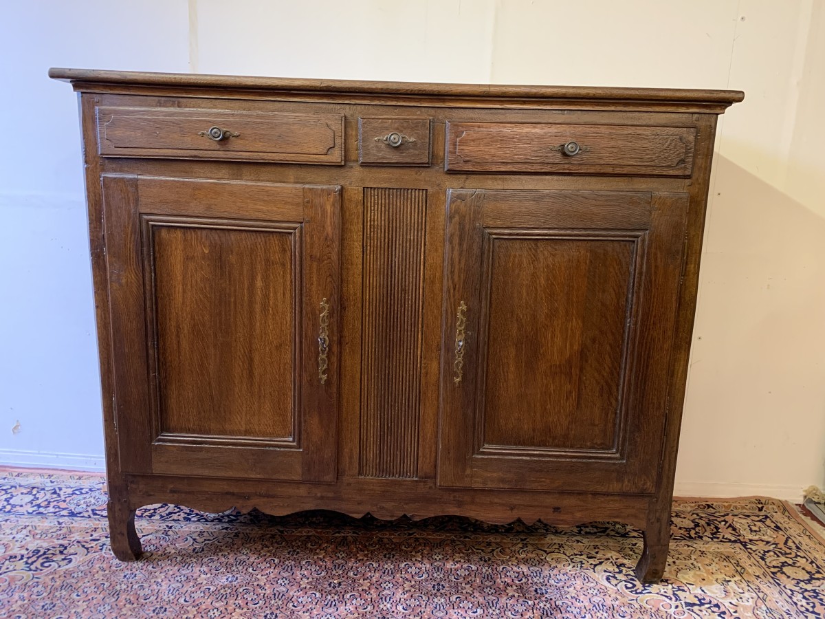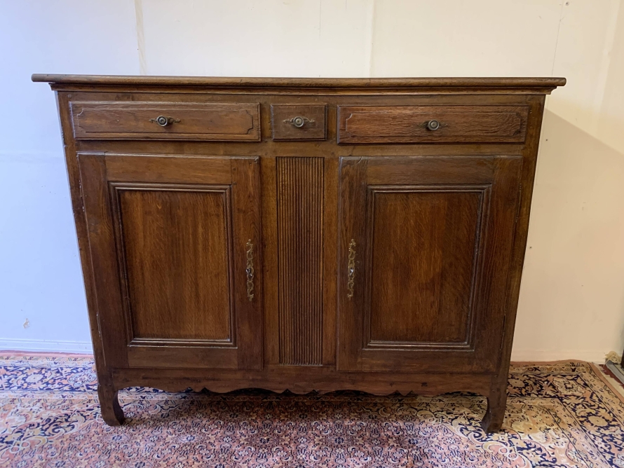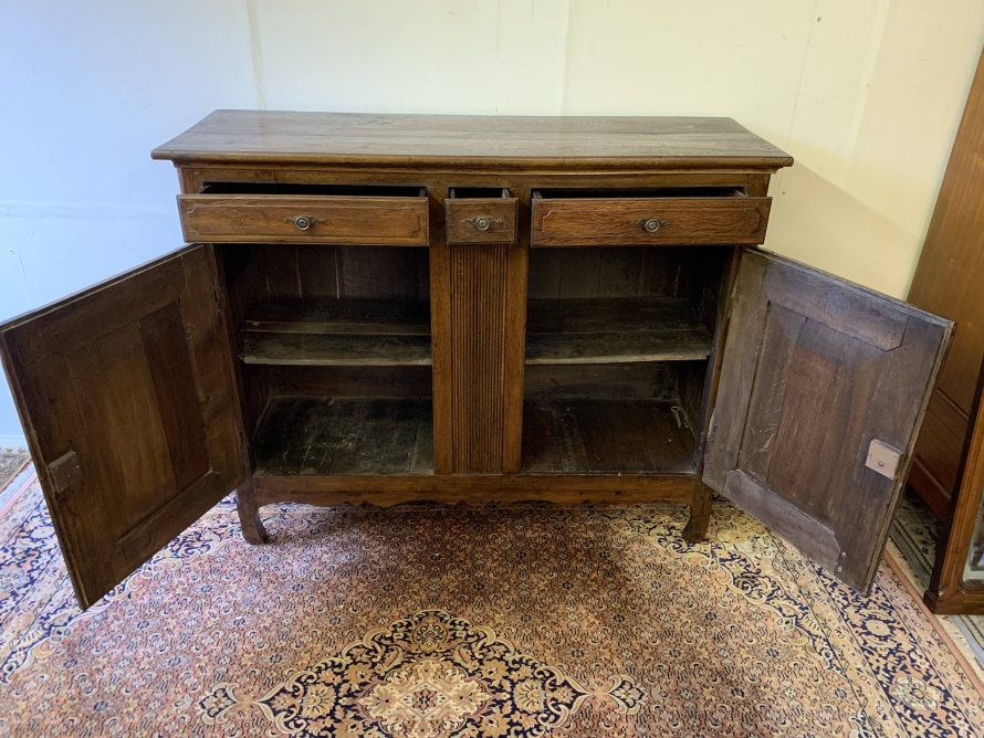 Made in glorious solid oak this rustic country dresser oozes style and quality. The oversailing top sits above a small central drawer which is flanked by a pair of larger drawers, each drawer having a turned knob handle. Central reeded decoration flanked by a pair of lockable recessed panelled cupboard doors, each door having brass hinges ornate escutcheon and key. The doors open to reveal a boarded back and base with wooden removable shelf. Recessed panelled sides the dresser stands on traditional block feet.