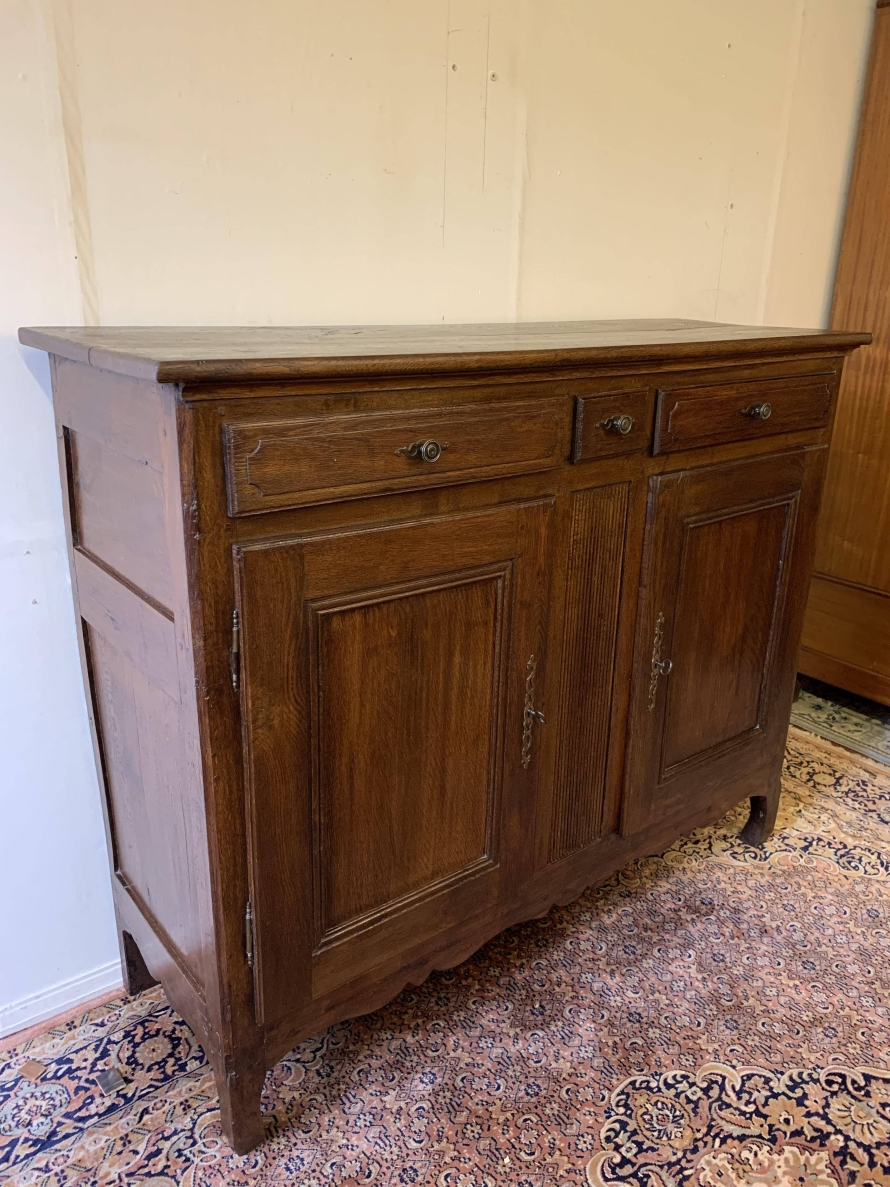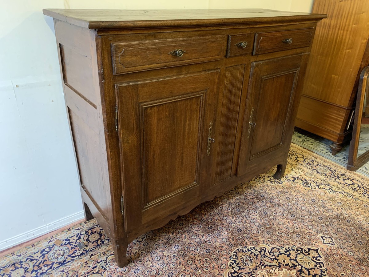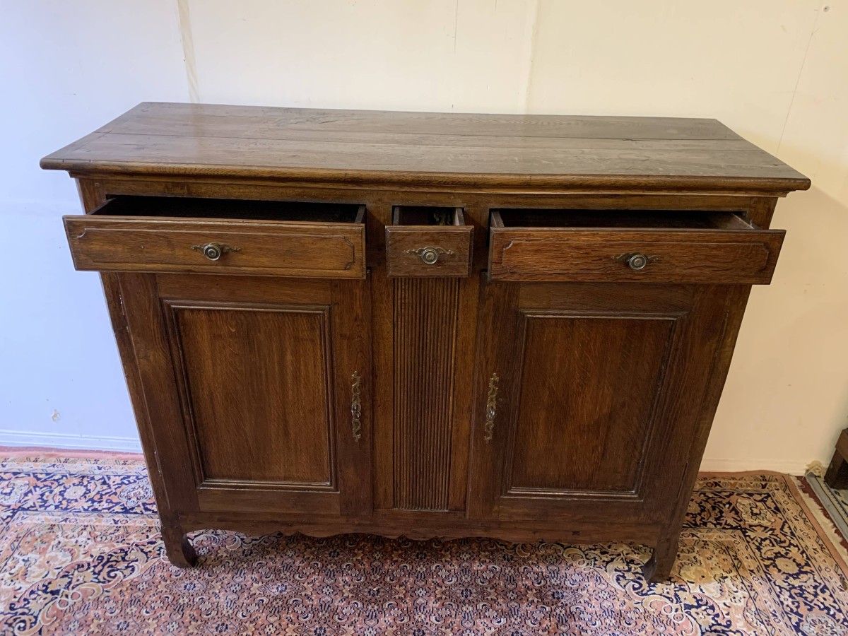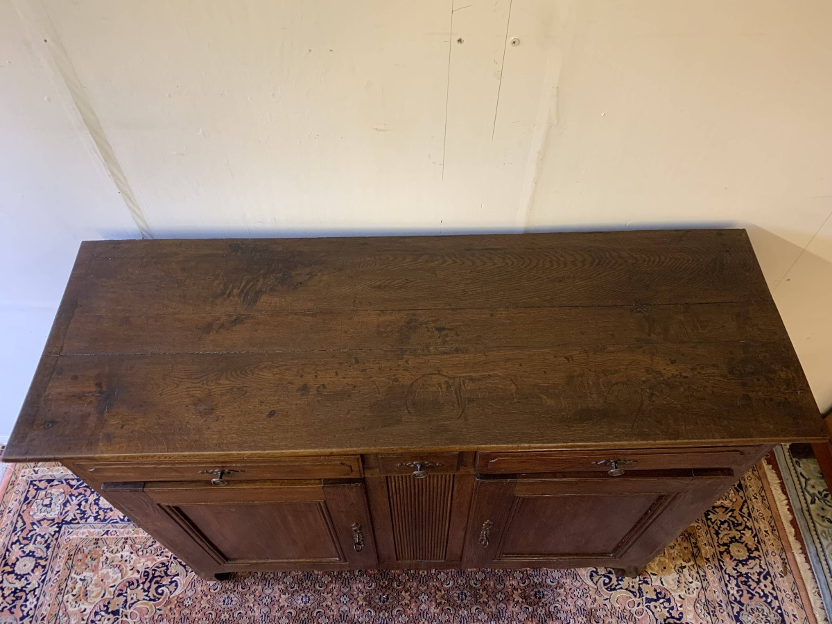 Made in glorious solid oak this rustic country dresser oozes style and quality. The oversailing top sits above a small central drawer which is flanked by a pair of larger drawers, each drawer having a turned knob handle. Central reeded decoration flanked by a pair of lockable recessed panelled cupboard doors, each door having brass hinges ornate escutcheon and key. The doors open to reveal a boarded back and base with wooden removable shelf. Recessed panelled sides the dresser stands on traditional block feet.